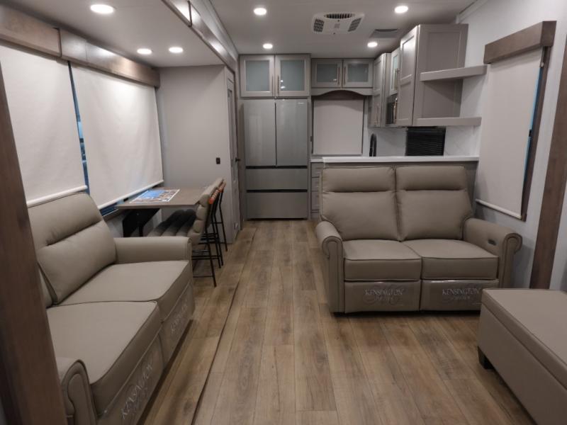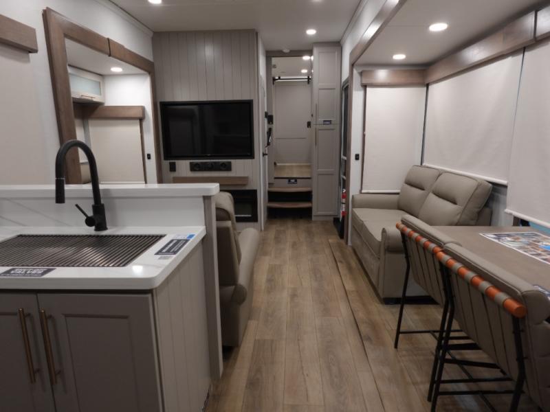 You won't want to camp any other way once you step inside this fifth wheel! the chef will enjoy all of the space in the rear kitchen with ample counter space, a 19 cu. ft. 12 volt residential refrigerator, and a pantry for snacks. Everyone will love to meet in the middle living area that includes dual sleeper sofas and a dual recliner loveseat across from the 50" Smart TV and fireplace. The half bathroom is nearby for quick bathroom breaks too. You will feel right at home in the master suite with a king bed slide to lay your head on at night, a flip top dresser with a Smart TV above it to watch your movies in true comfort, and a seat with storage, plus access to the front full bathroom. Inside the bathroom, you will find a 61" x 30" shower to freshen up in and a walk-in closet with a hamper, shelves, and washer and dryer prep for clean clothes throughout your entire trip!