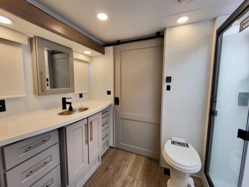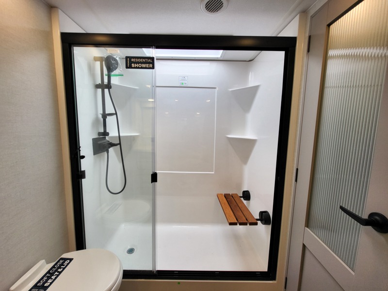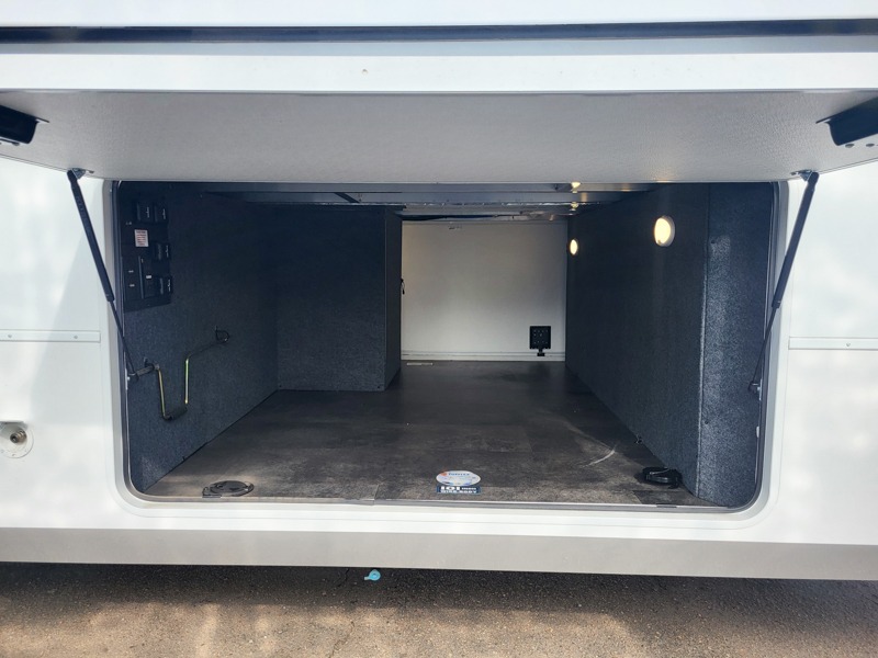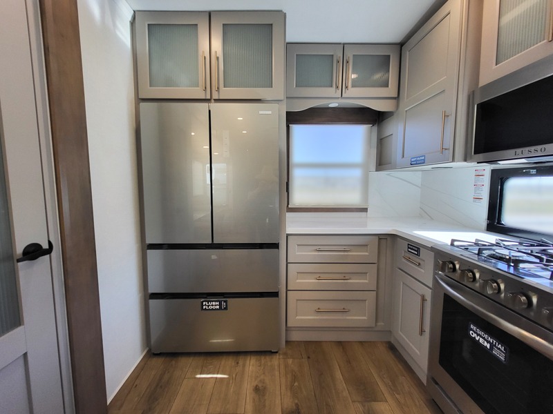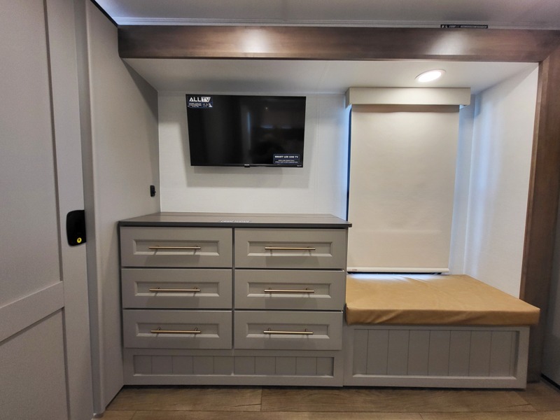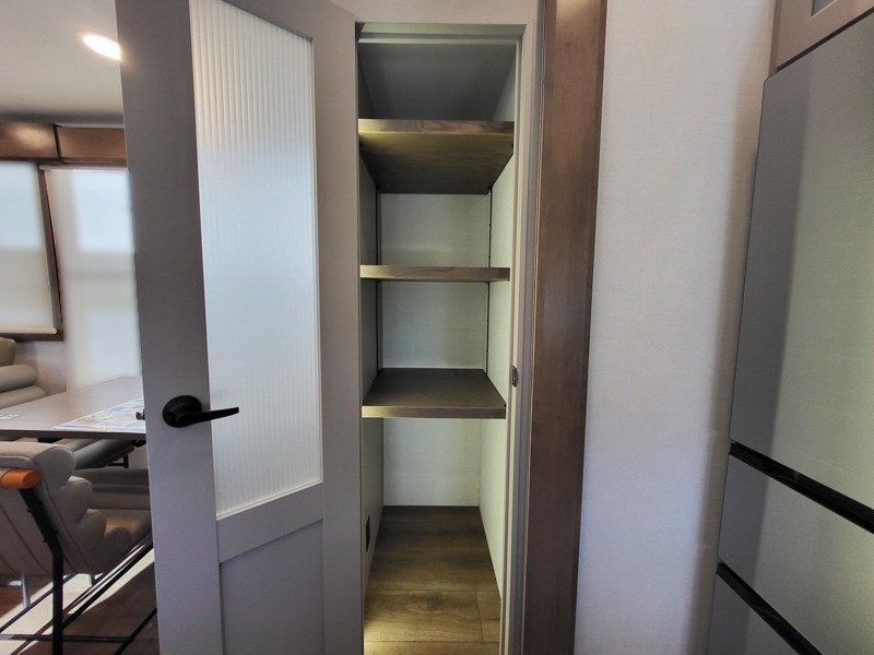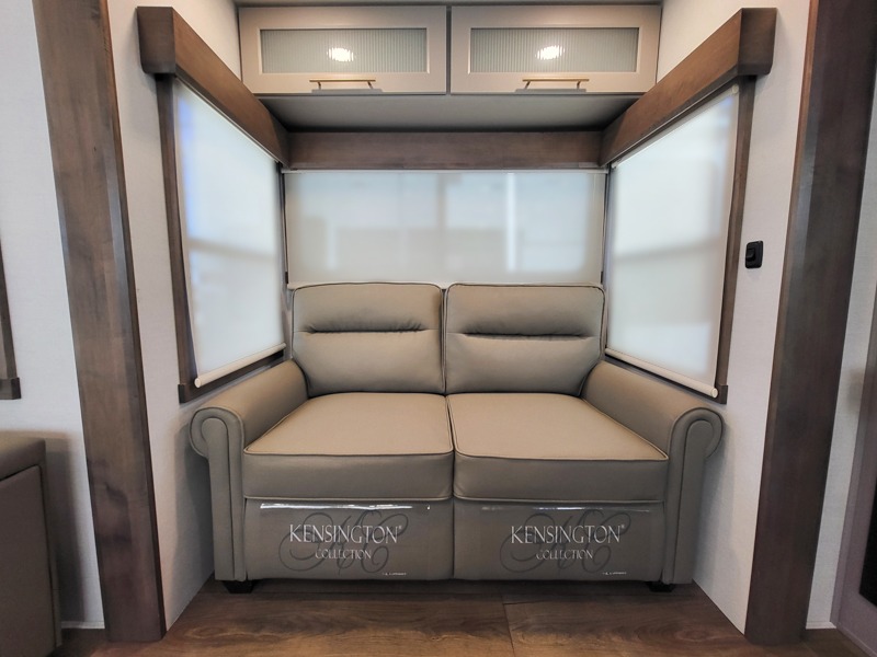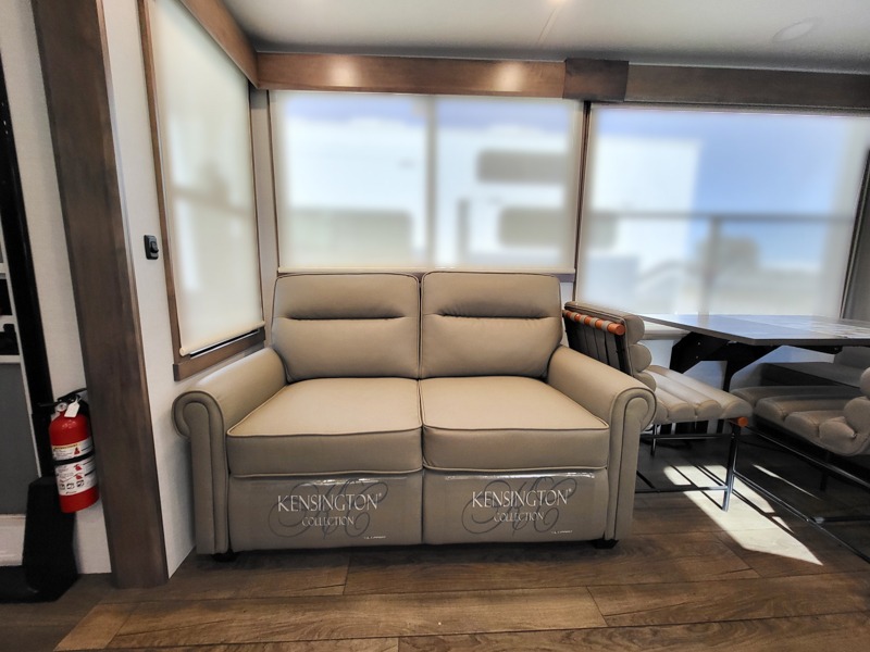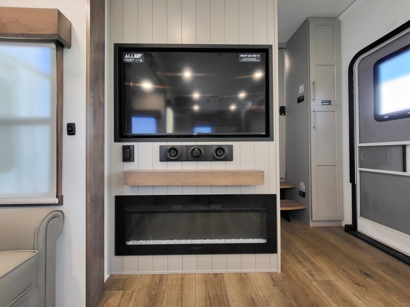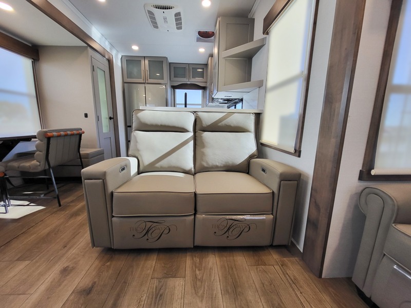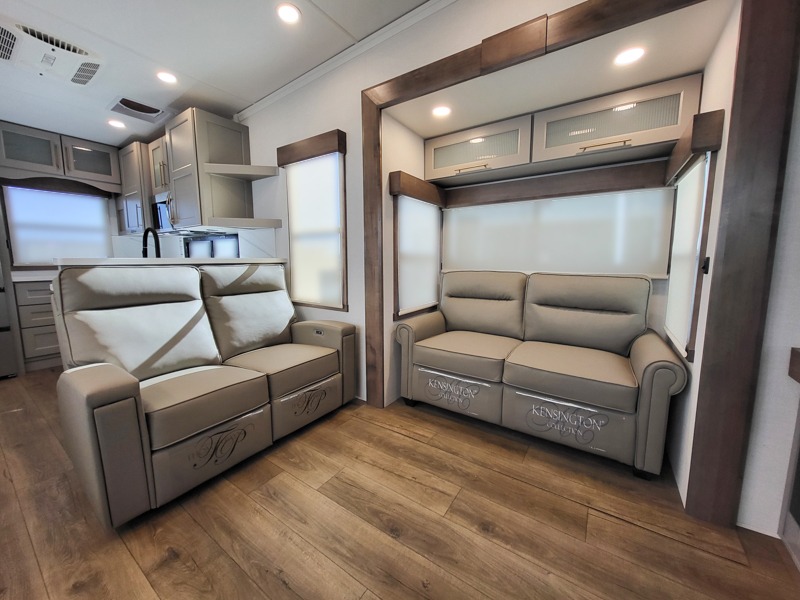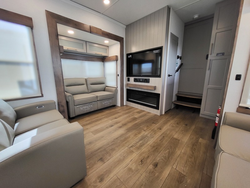 You won't want to camp any other way once you step inside this fifth wheel! the chef will enjoy all of the space in the rear kitchen with ample counter space, a 19 cu. ft. 12 volt residential refrigerator, and a pantry for snacks. Everyone will love to meet in the middle living area that includes dual sleeper sofas and a dual recliner loveseat across from the 50" Smart TV and fireplace. The half bathroom is nearby for quick bathroom breaks too. You will feel right at home in the master suite with a king bed slide to lay your head on at night, a flip top dresser with a Smart TV above it to watch your movies in true comfort, and a seat with storage, plus access to the front full bathroom. Inside the bathroom, you will find a 61" x 30" shower to freshen up in and a walk-in closet with a hamper, shelves, and washer and dryer prep for clean clothes throughout your entire trip!