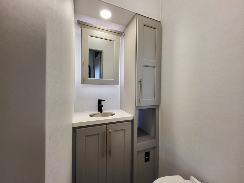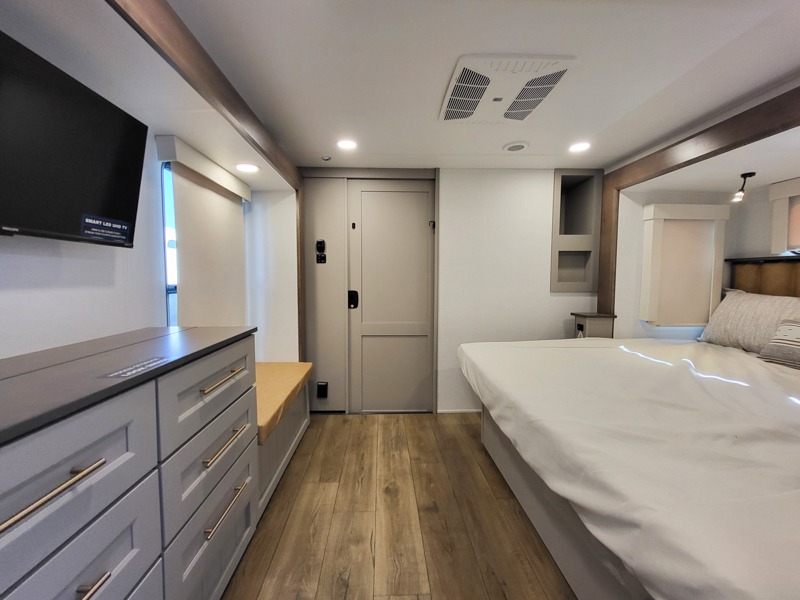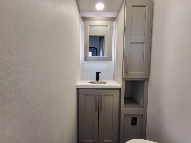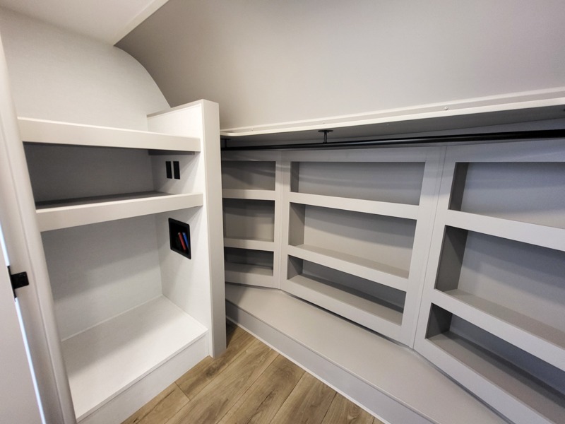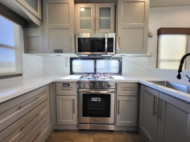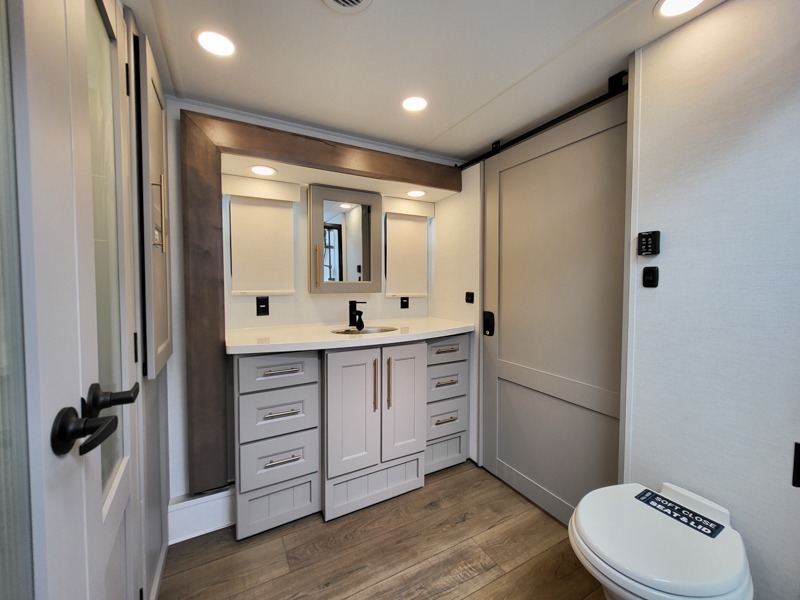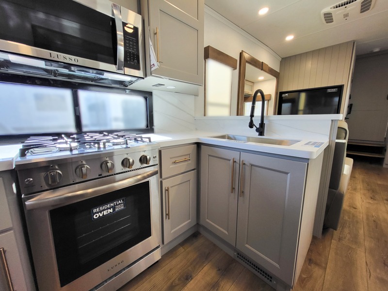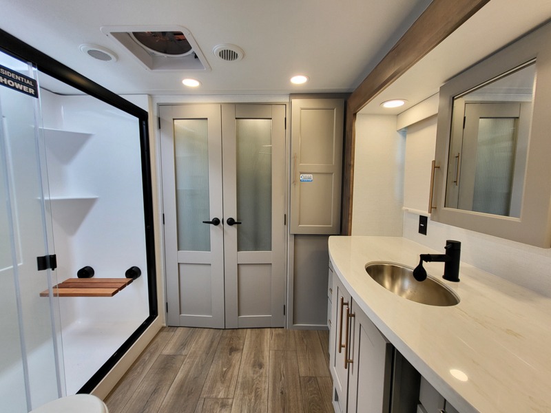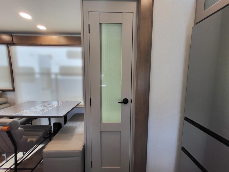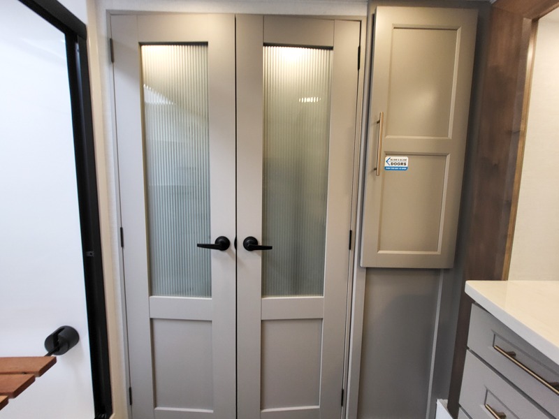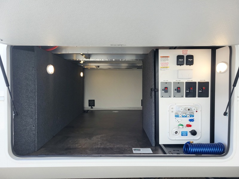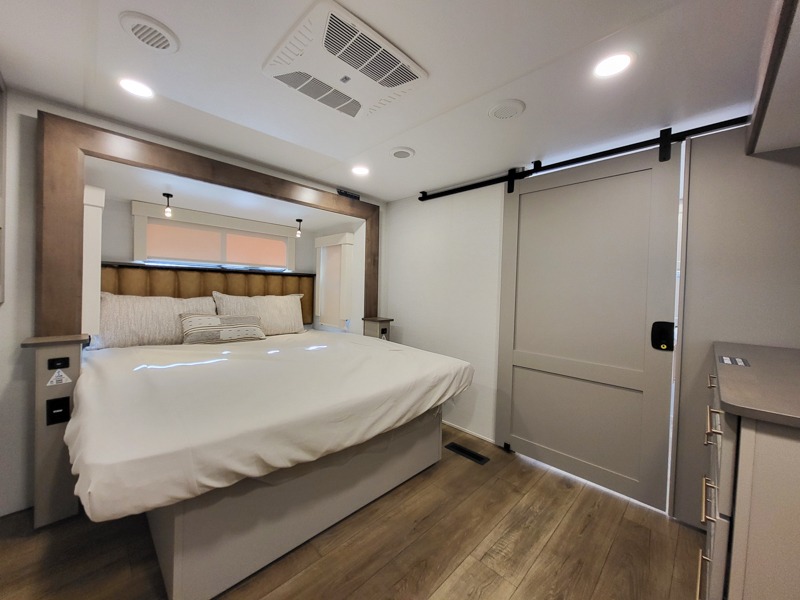 You won't want to camp any other way once you step inside this fifth wheel! the chef will enjoy all of the space in the rear kitchen with ample counter space, a 19 cu. ft. 12 volt residential refrigerator, and a pantry for snacks. Everyone will love to meet in the middle living area that includes dual sleeper sofas and a dual recliner loveseat across from the 50" Smart TV and fireplace. The half bathroom is nearby for quick bathroom breaks too. You will feel right at home in the master suite with a king bed slide to lay your head on at night, a flip top dresser with a Smart TV above it to watch your movies in true comfort, and a seat with storage, plus access to the front full bathroom. Inside the bathroom, you will find a 61" x 30" shower to freshen up in and a walk-in closet with a hamper, shelves, and washer and dryer prep for clean clothes throughout your entire trip!