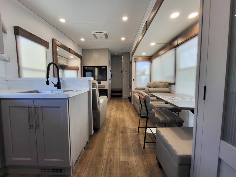 The Paradigm fifth wheels by Alliance RV are functional, high-quality, and luxurious for an unforgettable camping experience. There are three A/C units and a 40K BTU furnace to keep you comfortable year around, and you'll appreciate additional convenient amenities, like the all-in-one enclosed/heated utility center and the color coded and numbered wiring. A Rota-Flex pin box comes standard for hassle-free towing, along with Super-G 4,400 lb. rated tires and Dexter 7,000 lb. axles. You'll love the kitchen with its LG solid surface countertops and Lusso range, plus there is LED motion lighting in the pantry and a Maxx fan with a rain sensor to keep everything fresh when making dinner. Each model also includes an HD Smart TV in the living room and bedroom, plus a Winegard Air 360 antenna to keep you connected to the outside world. And of course there are a variety of options you can choose from to further customize your fifth wheel; dual pane windows, Super Solar Plus, slide out awning toppers, and generator prep or a generator to name a few!