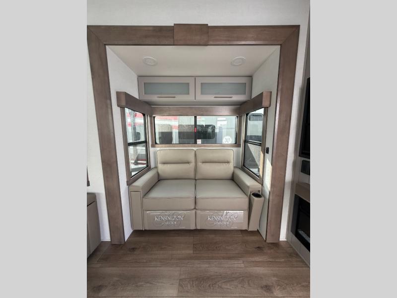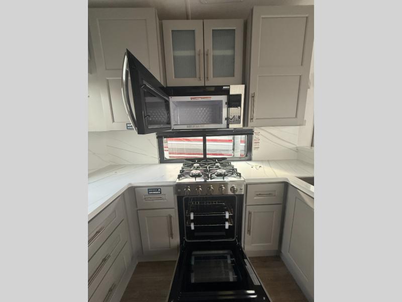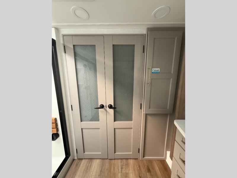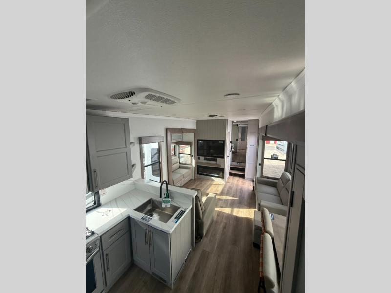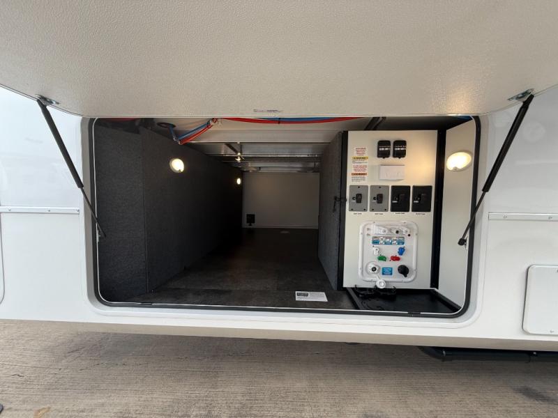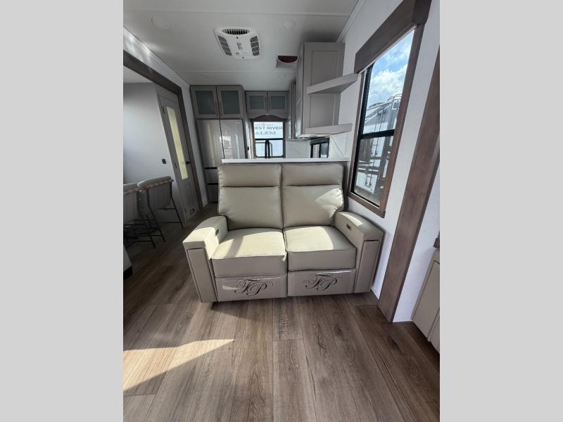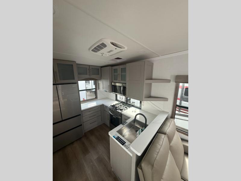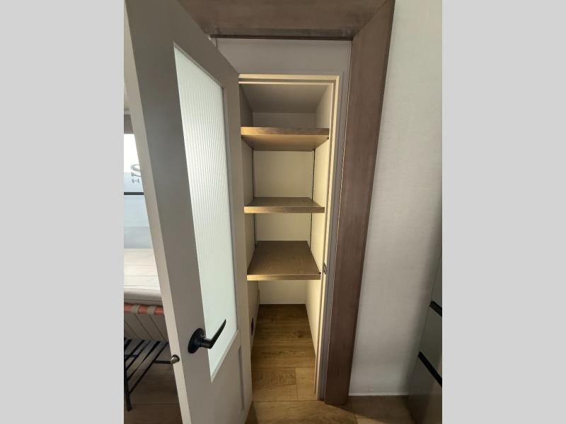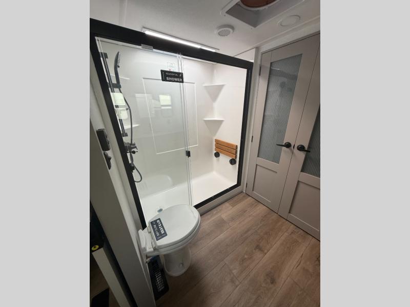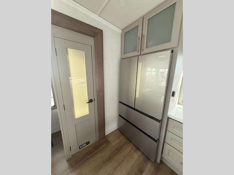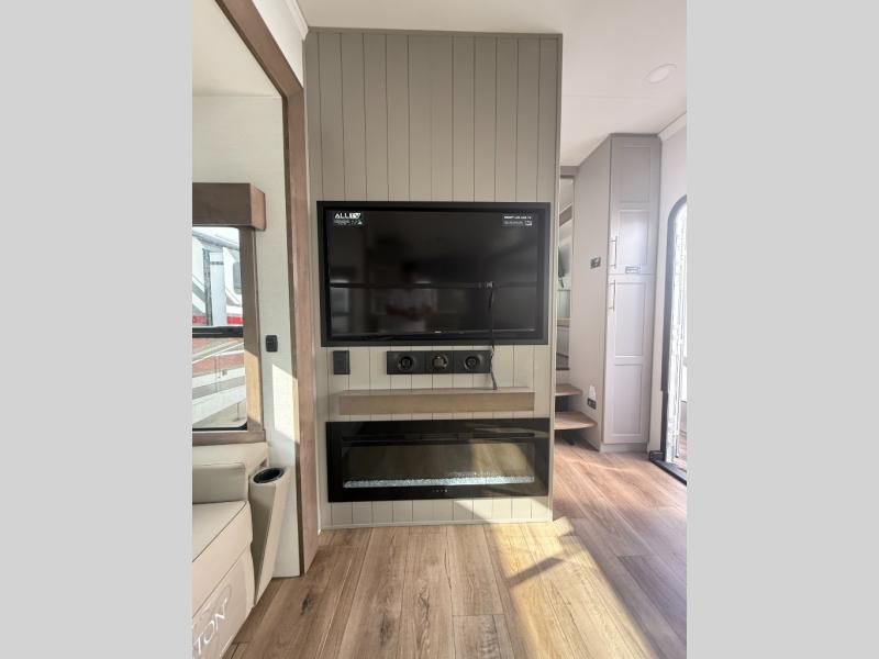 You won't want to camp any other way once you step inside this fifth wheel! the chef will enjoy all of the space in the rear kitchen with ample counter space, a 19 cu. ft. 12 volt residential refrigerator, and a pantry for snacks. Everyone will love to meet in the middle living area that includes dual sleeper sofas and a dual recliner loveseat across from the 50" Smart TV and fireplace. The half bathroom is nearby for quick bathroom breaks too. You will feel right at home in the master suite with a king bed slide to lay your head on at night, a flip top dresser with a Smart TV above it to watch your movies in true comfort, and a seat with storage, plus access to the front full bathroom. Inside the bathroom, you will find a 61" x 30" shower to freshen up in and a walk-in closet with a hamper, shelves, and washer and dryer prep for clean clothes throughout your entire trip!