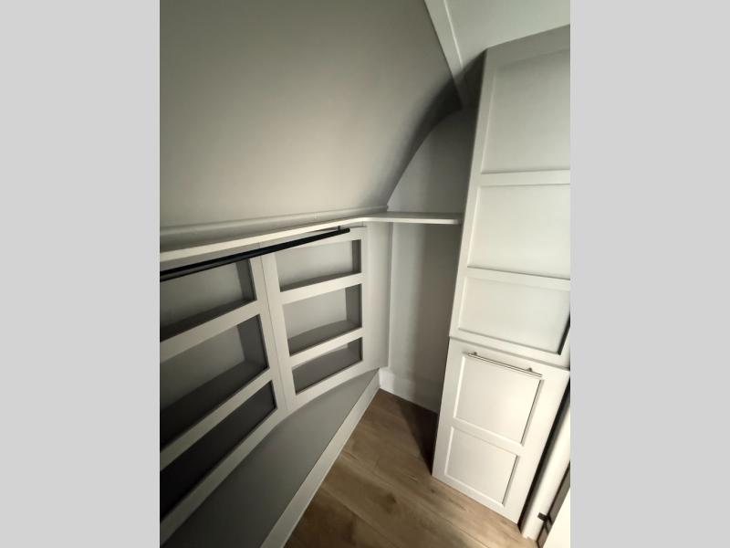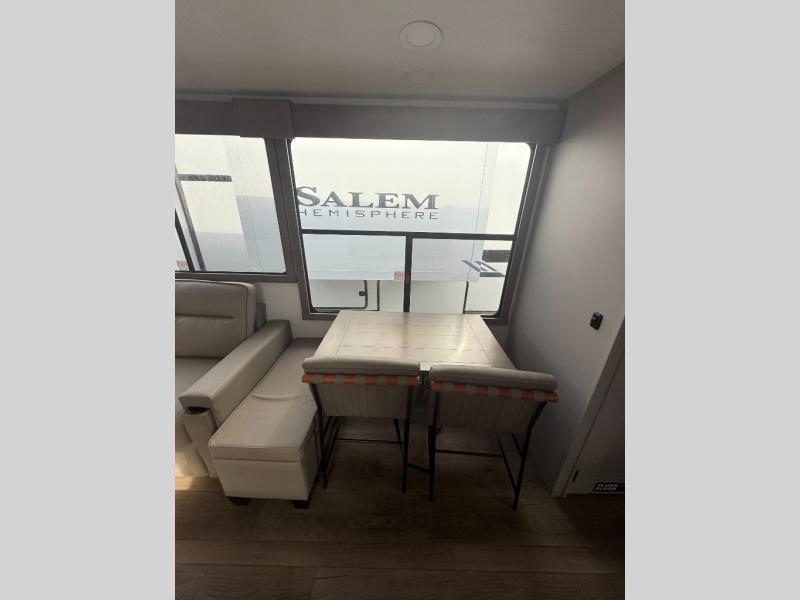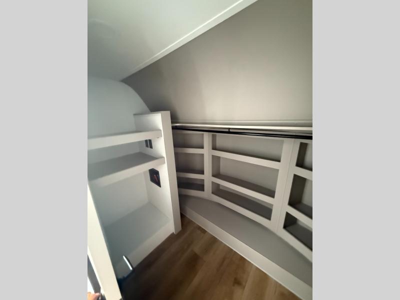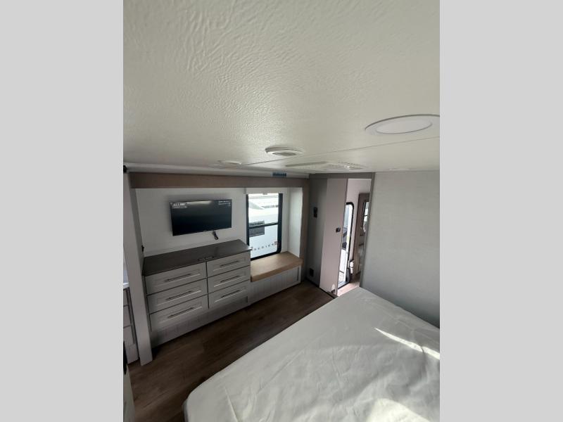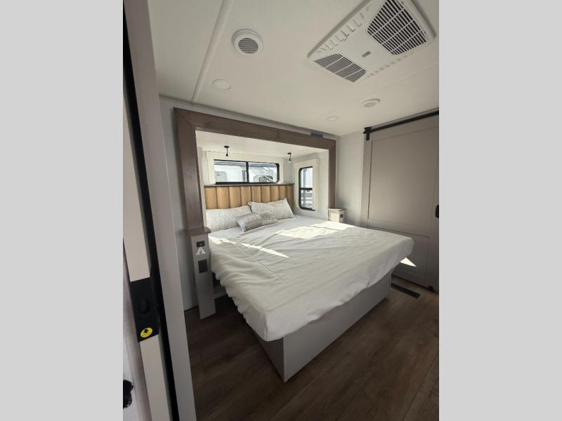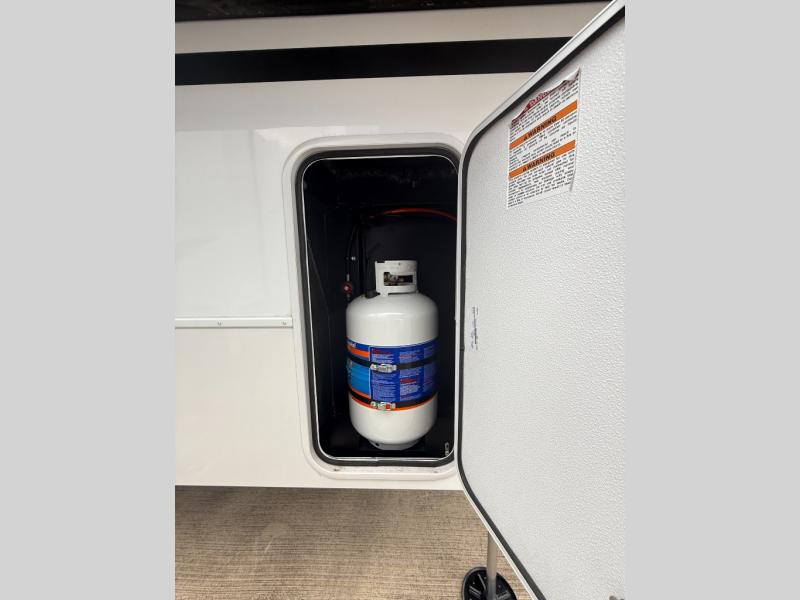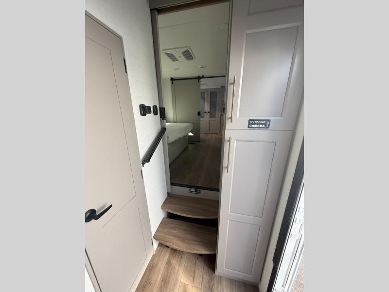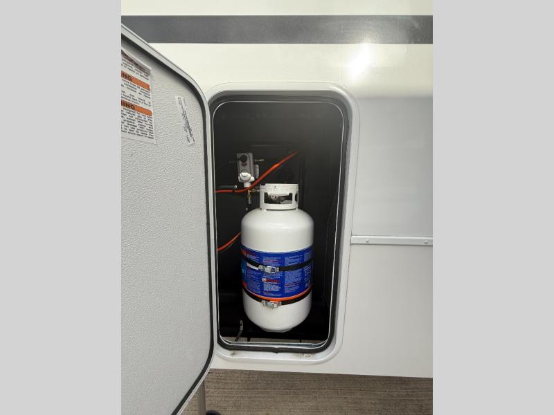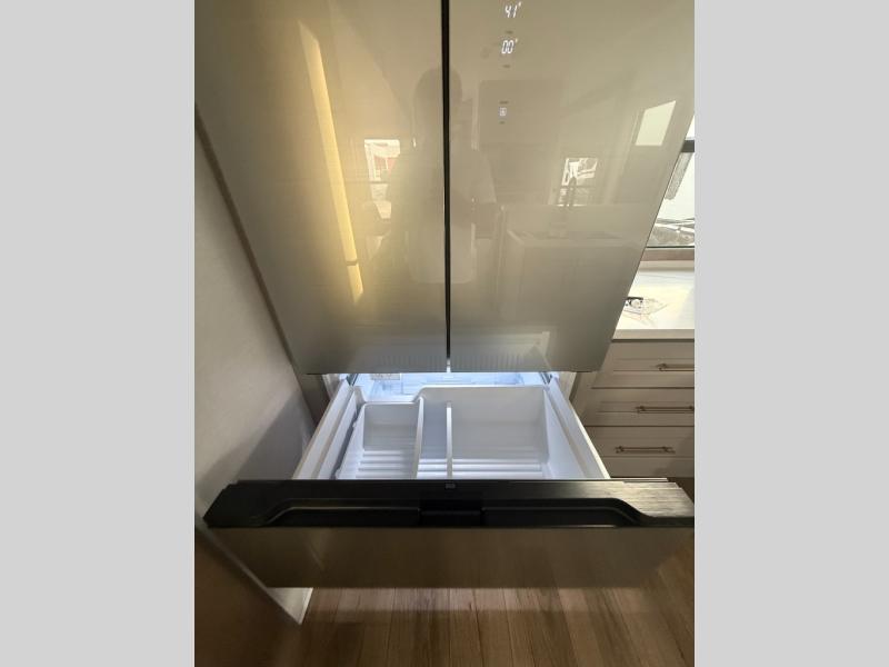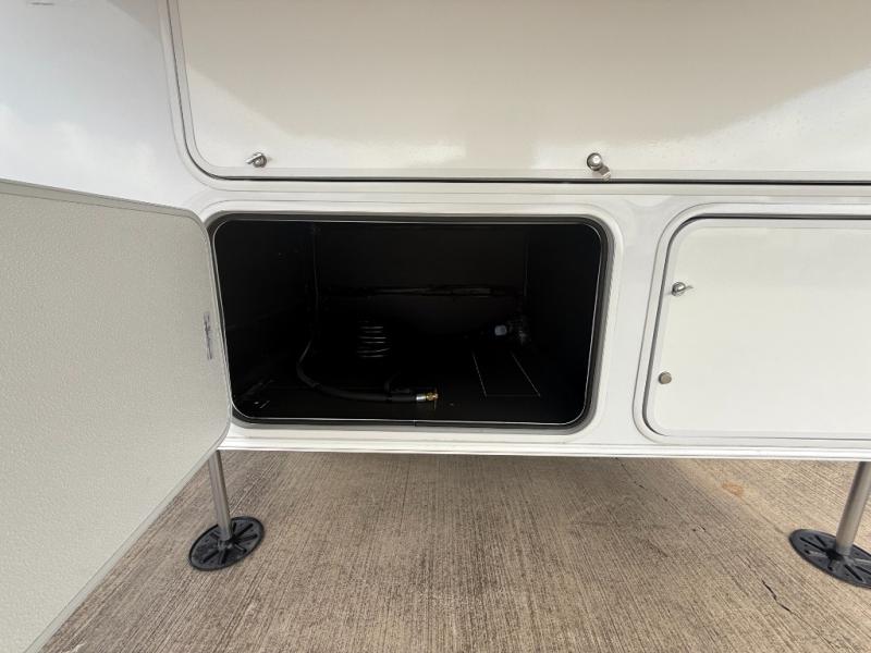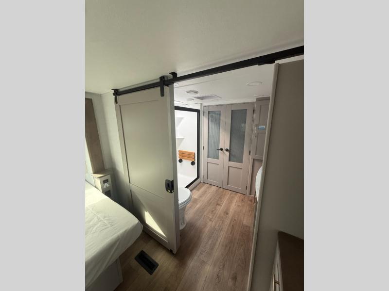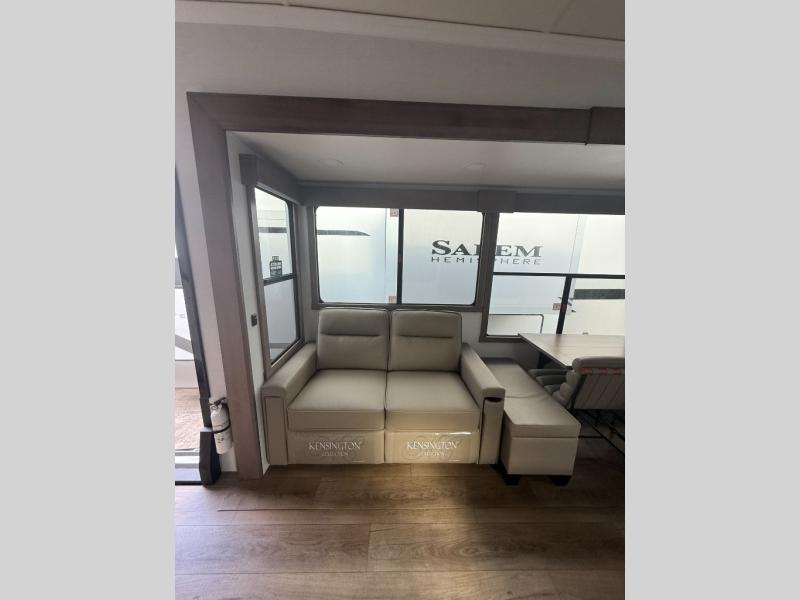 You won't want to camp any other way once you step inside this fifth wheel! the chef will enjoy all of the space in the rear kitchen with ample counter space, a 19 cu. ft. 12 volt residential refrigerator, and a pantry for snacks. Everyone will love to meet in the middle living area that includes dual sleeper sofas and a dual recliner loveseat across from the 50" Smart TV and fireplace. The half bathroom is nearby for quick bathroom breaks too. You will feel right at home in the master suite with a king bed slide to lay your head on at night, a flip top dresser with a Smart TV above it to watch your movies in true comfort, and a seat with storage, plus access to the front full bathroom. Inside the bathroom, you will find a 61" x 30" shower to freshen up in and a walk-in closet with a hamper, shelves, and washer and dryer prep for clean clothes throughout your entire trip!