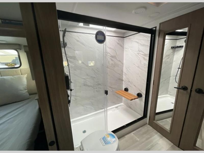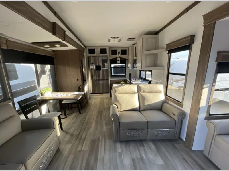 You won't want to camp any other way once you step inside this fifth wheel! the chef will enjoy all of the space in the rear kitchen with ample counter space, a 19 cu. ft. 12 volt residential refrigerator, and a pantry for snacks. Everyone will love to meet in the middle living area that includes dual sleeper sofas and a dual recliner loveseat across from the 50" Smart TV and fireplace. The half bathroom is nearby for quick bathroom breaks too. You will feel right at home in the master suite with a king bed slide to lay your head on at night, a flip top dresser with a Smart TV above it to watch your movies in true comfort, and a seat with storage, plus access to the front full bathroom. Inside the bathroom, you will find a 61" x 30" shower to freshen up in and a walk-in closet with a hamper, shelves, and washer and dryer prep for clean clothes throughout your entire trip!