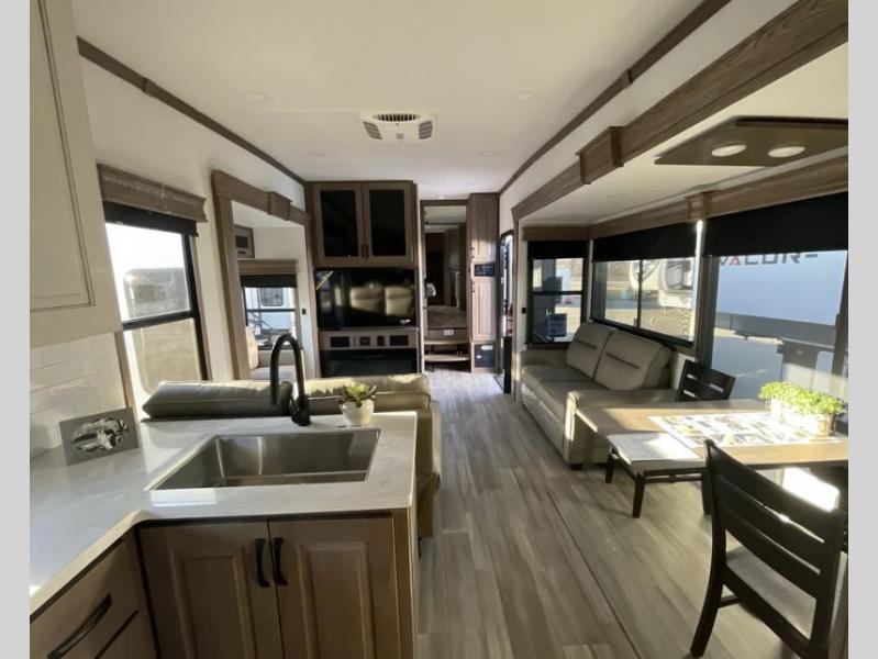 The Paradigm fifth wheels by Alliance RV are functional, high-quality, and luxurious for an unforgettable camping experience. There are three A/C units and a 40K BTU furnace to keep you comfortable year around, and you'll appreciate additional convenient amenities, like the all-in-one enclosed/heated utility center and the color coded and numbered wiring. A Helux Series coil spring pin box comes standard for hassle-free towing, along with Super-G 4,400 lb. rated tires and Dexter 7,000 lb. axles. You'll love the kitchen with its LG solid surface countertops and Lusso range, plus there is LED motion lighting in the pantry and a Maxx fan with a rain sensor to keep everything fresh when making dinner. Each model also includes an HD Smart TV in the living room and bedroom, plus a Winegard Air 360 antenna to keep you connected to the outside world. And of course there are a variety of options you can choose from to further customize your fifth wheel; dual pane windows, Super Solar Plus, slide out awning toppers, and generator prep or a generator to name a few!