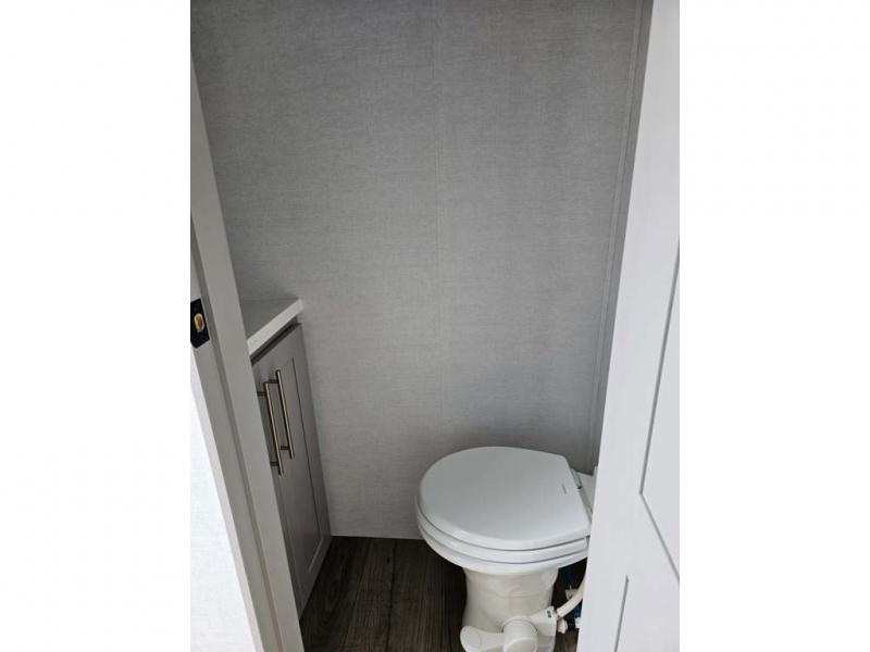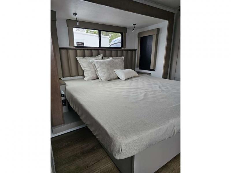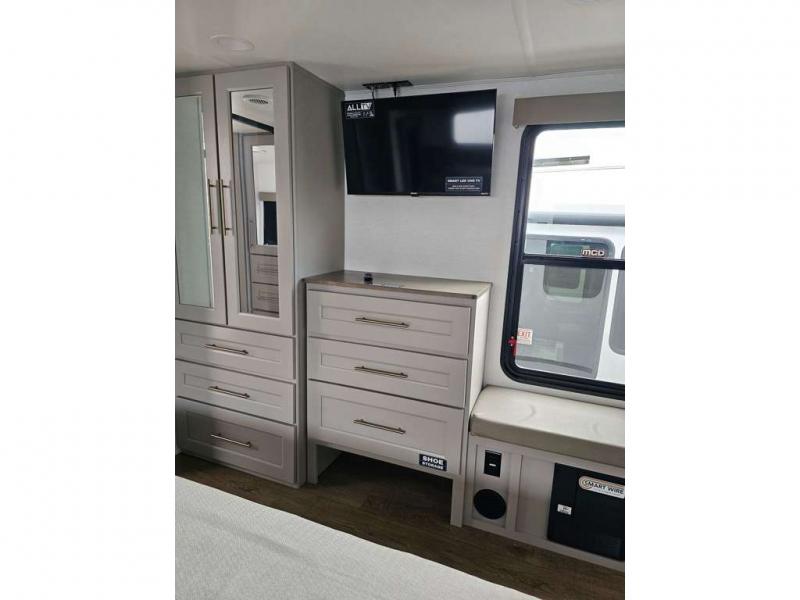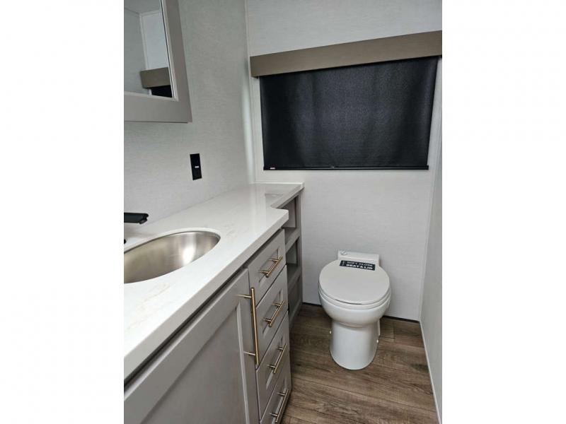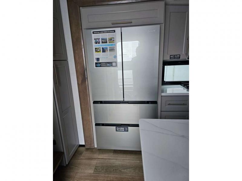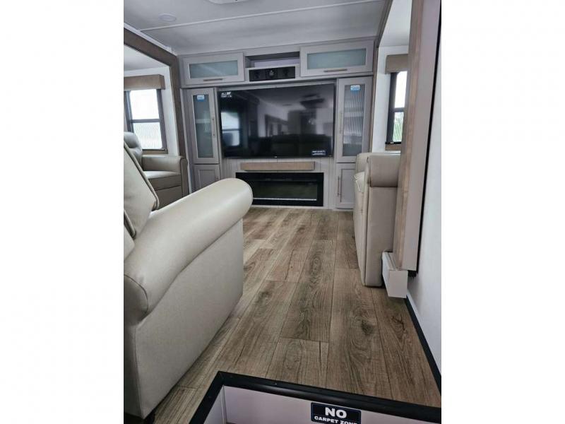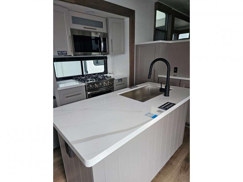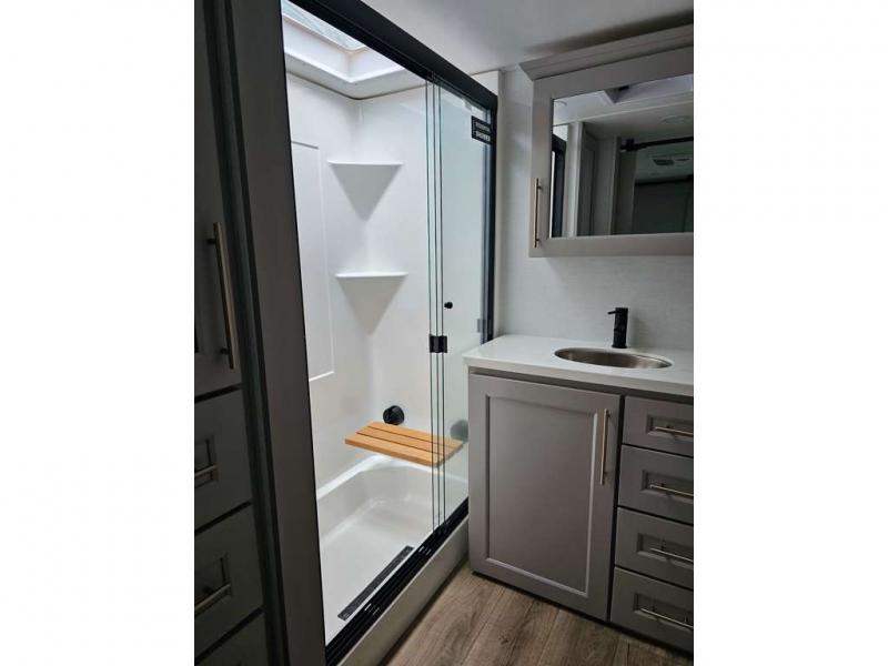 An active family will want this fifth wheel with its 48" x 115" exterior basement pull-out tray for kayaks or extra storage. Just above this area is the master suite with a rear bathroom that offers a residential shower, a porcelain toilet with soft close seat, plus a wardrobe and shelf storage. The king bed slide gives you more floor space, and you will have a seat, a flip-top dresser, and a Smart TV to watch movies in bed. The half bath is next to the main entry which is super convenient, and the middle kitchen is separate from the front living area. The cook will love the residential microwave, range and oven, plus the 19 cu. ft. 12 volt residential refrigerator. There is also a pantry and extra counter space on the kitchen island with a large sink. The views out of the atrium windows in the slide out, which includes the swivel table and desk, are a must see. And when you need to watch the big game, the 55" Smart TV with a pull-out fireplace storage are up front with the dual recliner love seat and two sleeper sofas.