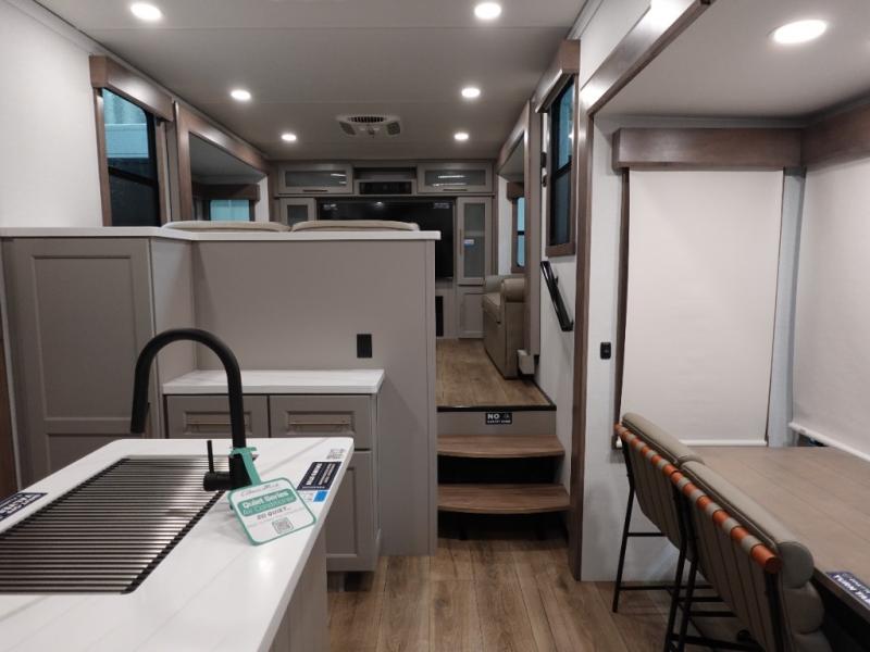 An active family will want this fifth wheel with its 48" x 115" exterior basement pull-out tray for kayaks or extra storage. Just above this area is the master suite with a rear bathroom that offers a residential shower, a porcelain toilet with soft close seat, plus a wardrobe and shelf storage. The king bed slide gives you more floor space, and you will have a seat, a flip-top dresser, and a Smart TV to watch movies in bed. The half bath is next to the main entry which is super convenient, and the middle kitchen is separate from the front living area. The cook will love the residential microwave, range and oven, plus the 19 cu. ft. 12 volt residential refrigerator. There is also a pantry and extra counter space on the kitchen island with a large sink. The views out of the atrium windows in the slide out, which includes the swivel table and desk, are a must see. And when you need to watch the big game, the 55" Smart TV with a pull-out fireplace storage are up front with the dual recliner love seat and two sleeper sofas.