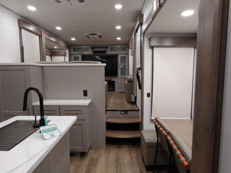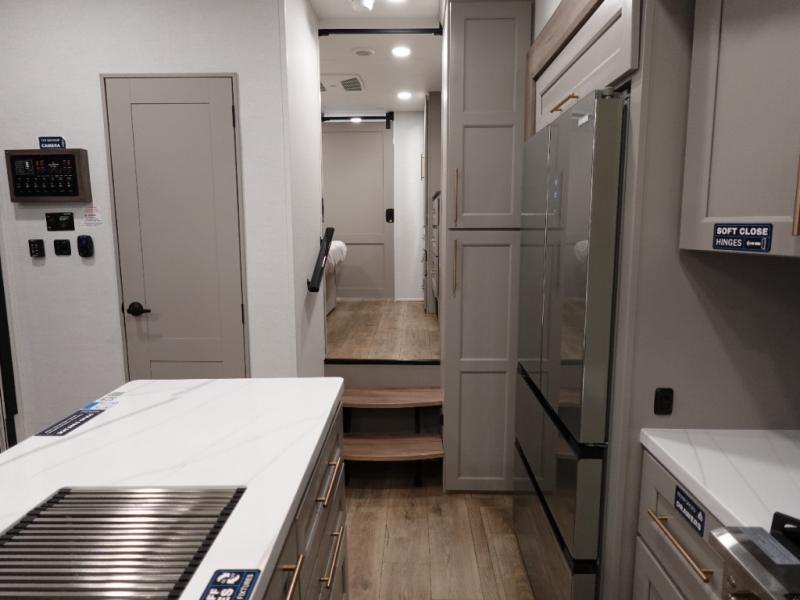 An active family will want this fifth wheel with its 48" x 115" exterior basement pull-out tray for kayaks or extra storage. Just above this area is the master suite with a rear bathroom that offers a residential shower, a porcelain toilet with soft close seat, plus a wardrobe and shelf storage. The king bed slide gives you more floor space, and you will have a seat, a flip-top dresser, and a Smart TV to watch movies in bed. The half bath is next to the main entry which is super convenient, and the middle kitchen is separate from the front living area. The cook will love the residential microwave, range and oven, plus the 19 cu. ft. 12 volt residential refrigerator. There is also a pantry and extra counter space on the kitchen island with a large sink. The views out of the atrium windows in the slide out, which includes the swivel table and desk, are a must see. And when you need to watch the big game, the 55" Smart TV with a pull-out fireplace storage are up front with the dual recliner love seat and two sleeper sofas.