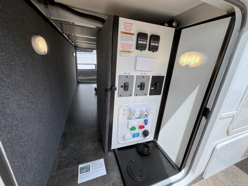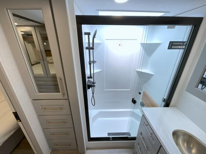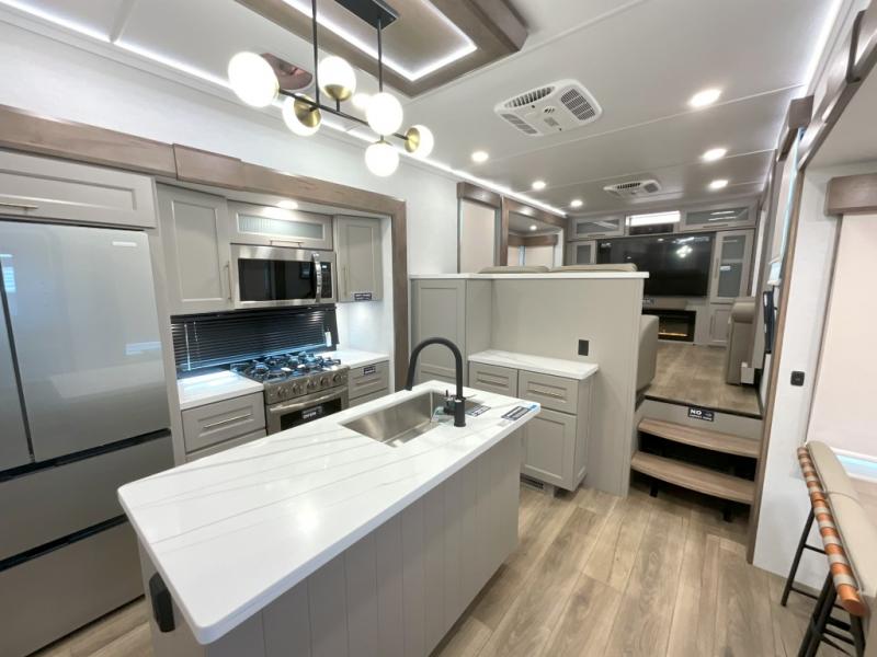 The Paradigm fifth wheels by Alliance RV are functional, high-quality, and luxurious for an unforgettable camping experience. There are three A/C units and a 40K BTU furnace to keep you comfortable year around, and you'll appreciate additional convenient amenities, like the all-in-one enclosed/heated utility center and the color coded and numbered wiring. A Rota-Flex pin box comes standard for hassle-free towing, along with Super-G 4,400 lb. rated tires and Dexter 7,000 lb. axles. You'll love the kitchen with its LG solid surface countertops and Lusso range, plus there is LED motion lighting in the pantry and a Maxx fan with a rain sensor to keep everything fresh when making dinner. Each model also includes an HD Smart TV in the living room and bedroom, plus a Winegard Air 360 antenna to keep you connected to the outside world. And of course there are a variety of options you can choose from to further customize your fifth wheel; dual pane windows, Super Solar Plus, slide out awning toppers, and generator prep or a generator to name a few!