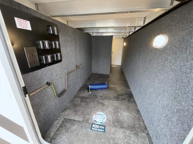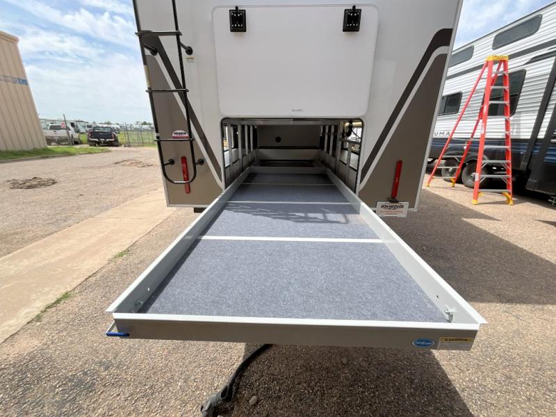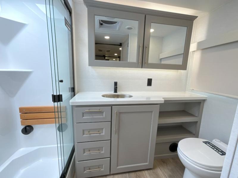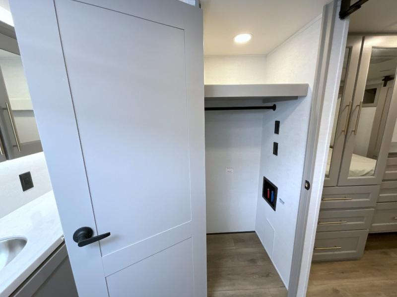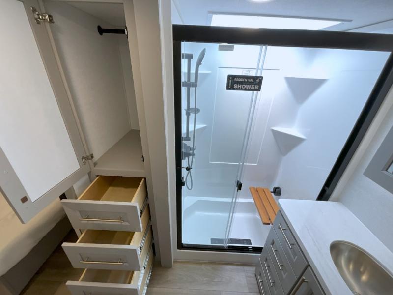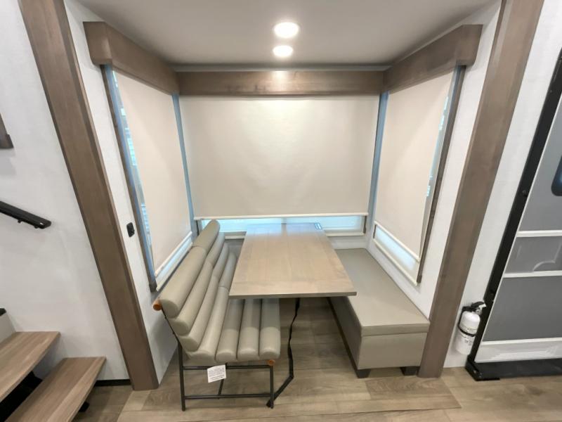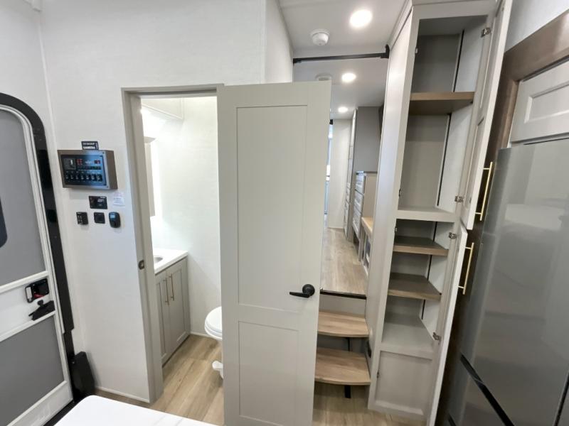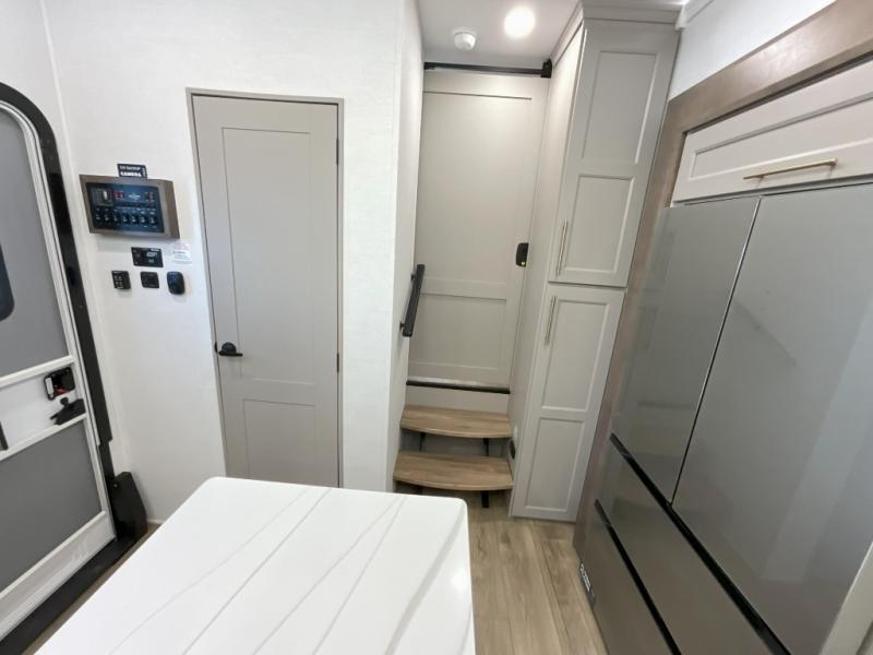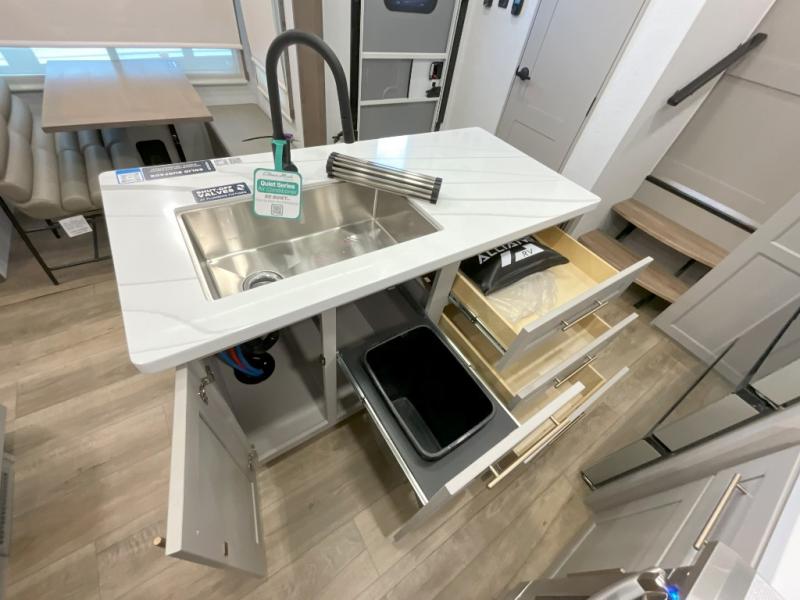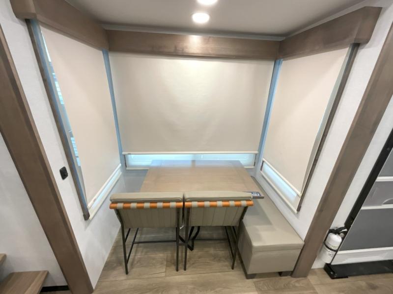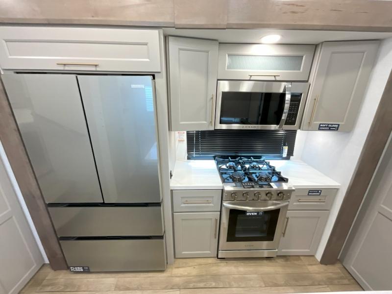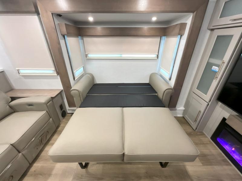 An active family will want this fifth wheel with its 48" x 115" exterior basement pull-out tray for kayaks or extra storage. Just above this area is the master suite with a rear bathroom that offers a residential shower, a porcelain toilet with soft close seat, plus a wardrobe and shelf storage. The king bed slide gives you more floor space, and you will have a seat, a flip-top dresser, and a Smart TV to watch movies in bed. The half bath is next to the main entry which is super convenient, and the middle kitchen is separate from the front living area. The cook will love the residential microwave, range and oven, plus the 19 cu. ft. 12 volt residential refrigerator. There is also a pantry and extra counter space on the kitchen island with a large sink. The views out of the atrium windows in the slide out, which includes the swivel table and desk, are a must see. And when you need to watch the big game, the 55" Smart TV with a pull-out fireplace storage are up front with the dual recliner love seat and two sleeper sofas.