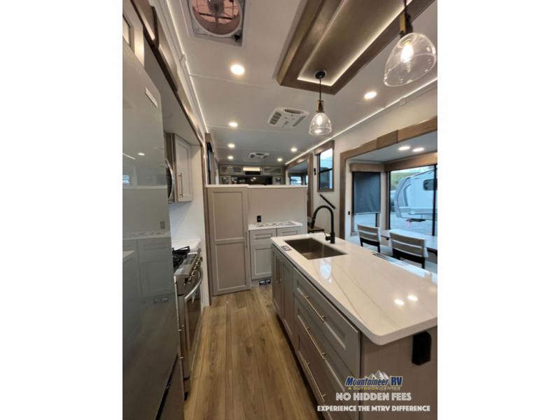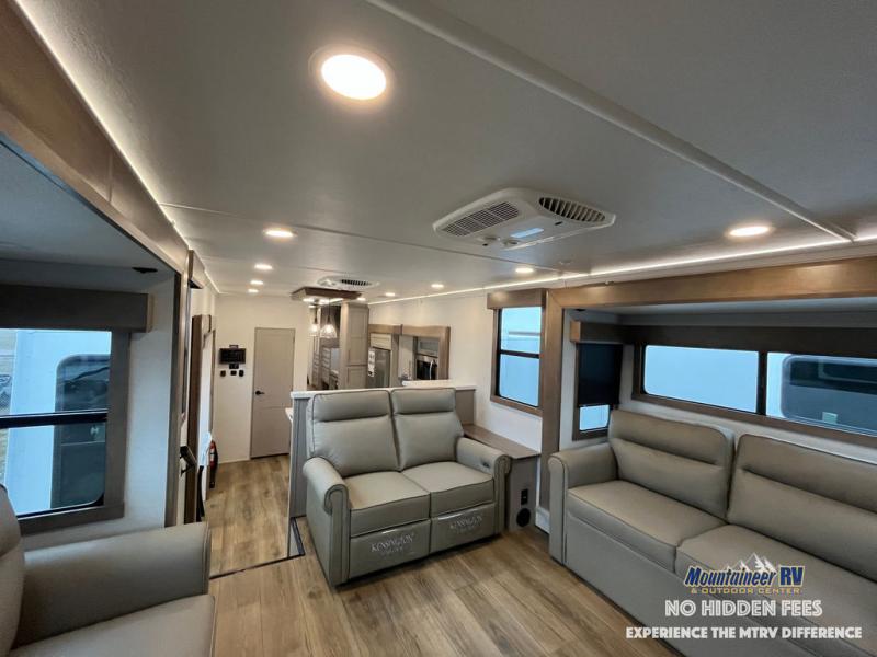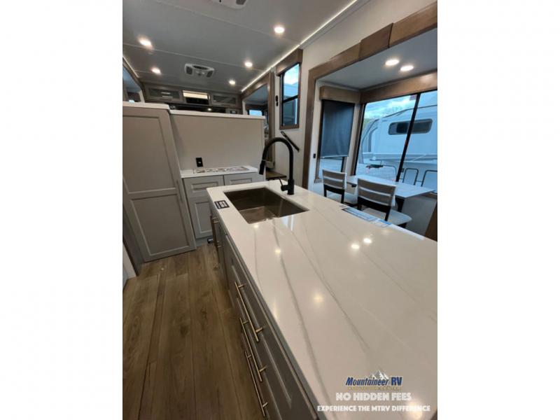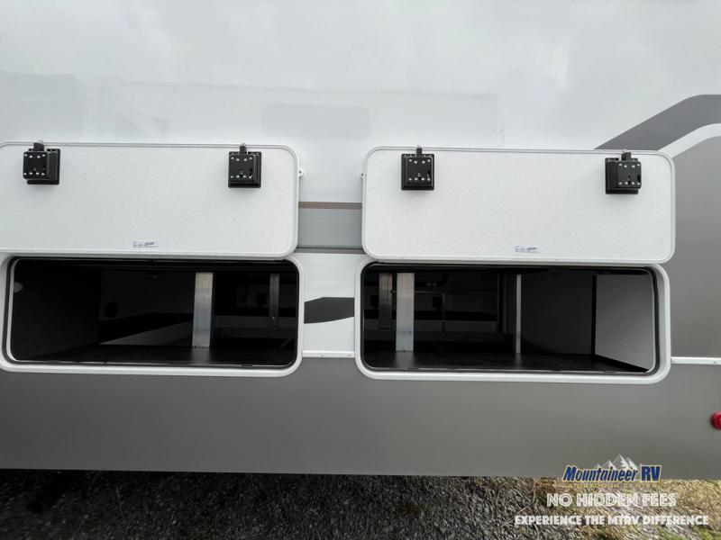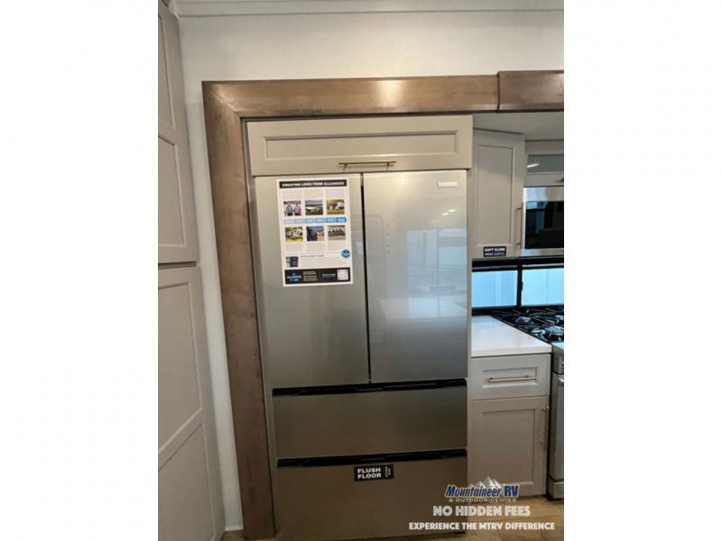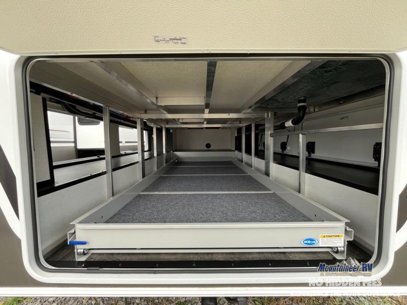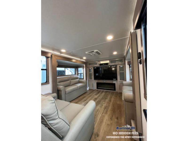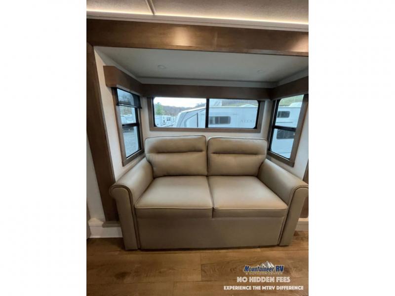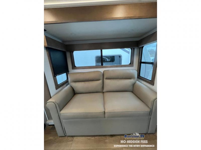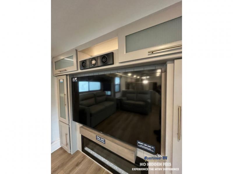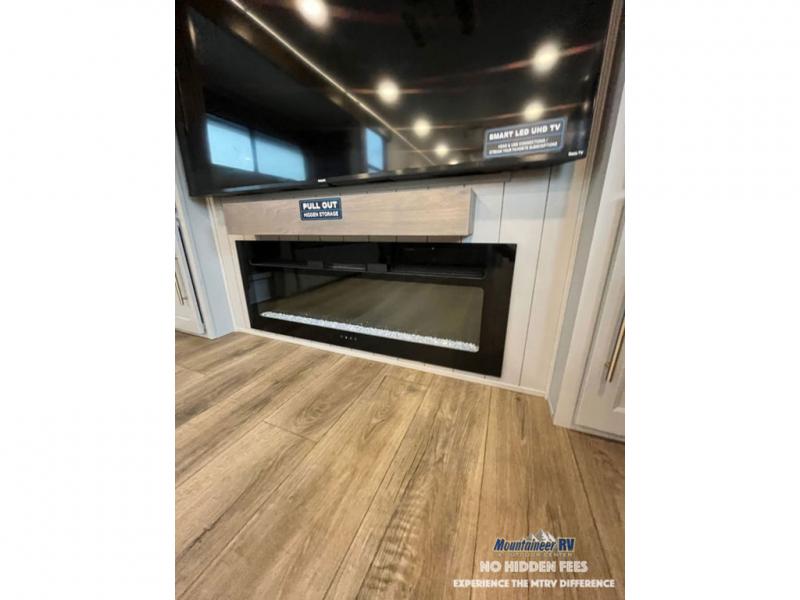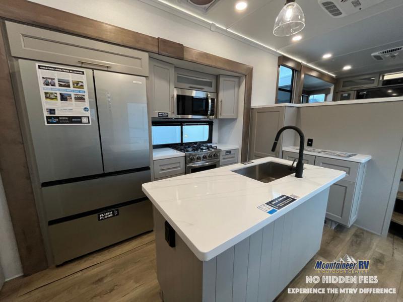 An active family will want this fifth wheel with its 48" x 115" exterior basement pull-out tray for kayaks or extra storage. Just above this area is the master suite with a rear bathroom that offers a residential shower, a porcelain toilet with soft close seat, plus a wardrobe and shelf storage. The king bed slide gives you more floor space, and you will have a seat, a flip-top dresser, and a Smart TV to watch movies in bed. The half bath is next to the main entry which is super convenient, and the middle kitchen is separate from the front living area. The cook will love the residential microwave, range and oven, plus the 19 cu. ft. 12 volt residential refrigerator. There is also a pantry and extra counter space on the kitchen island with a large sink. The views out of the atrium windows in the slide out, which includes the swivel table and desk, are a must see. And when you need to watch the big game, the 55" Smart TV with a pull-out fireplace storage are up front with the dual recliner love seat and two sleeper sofas.