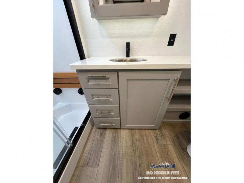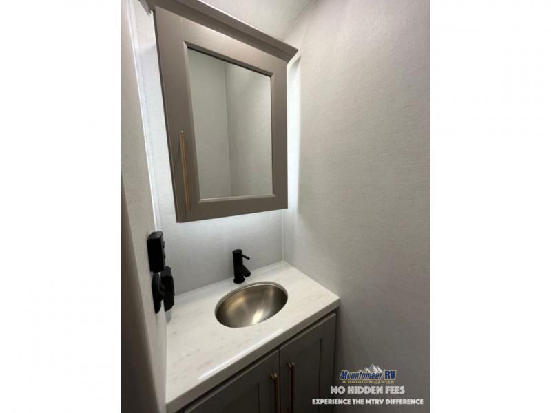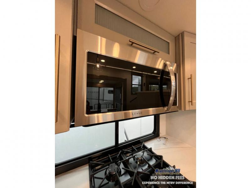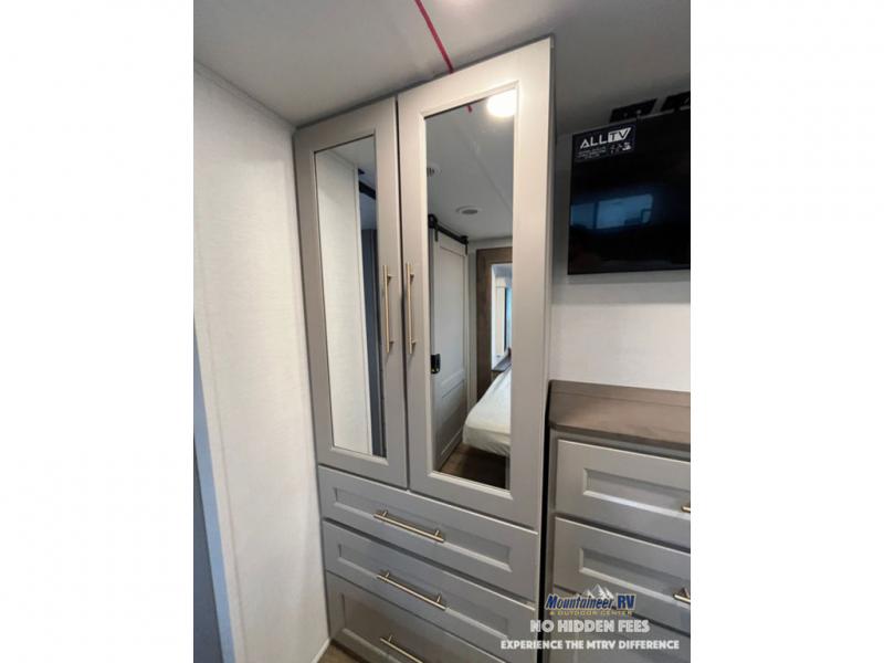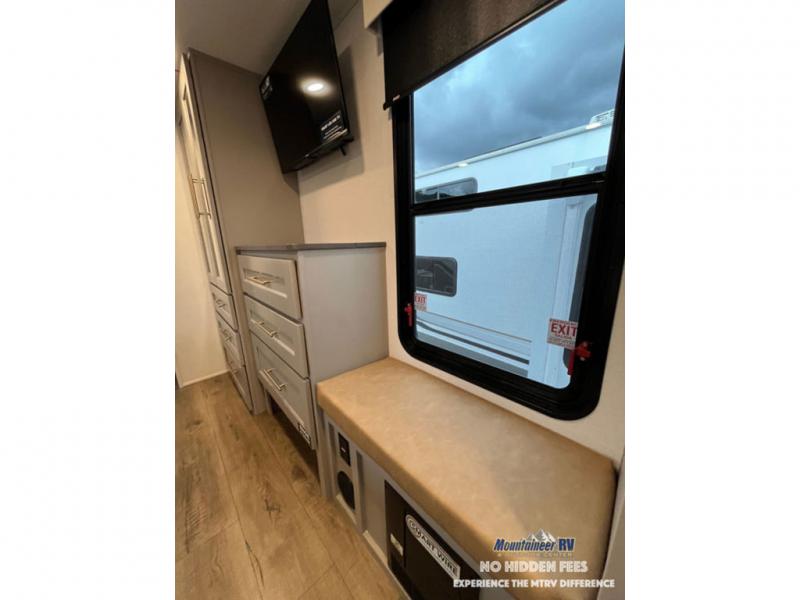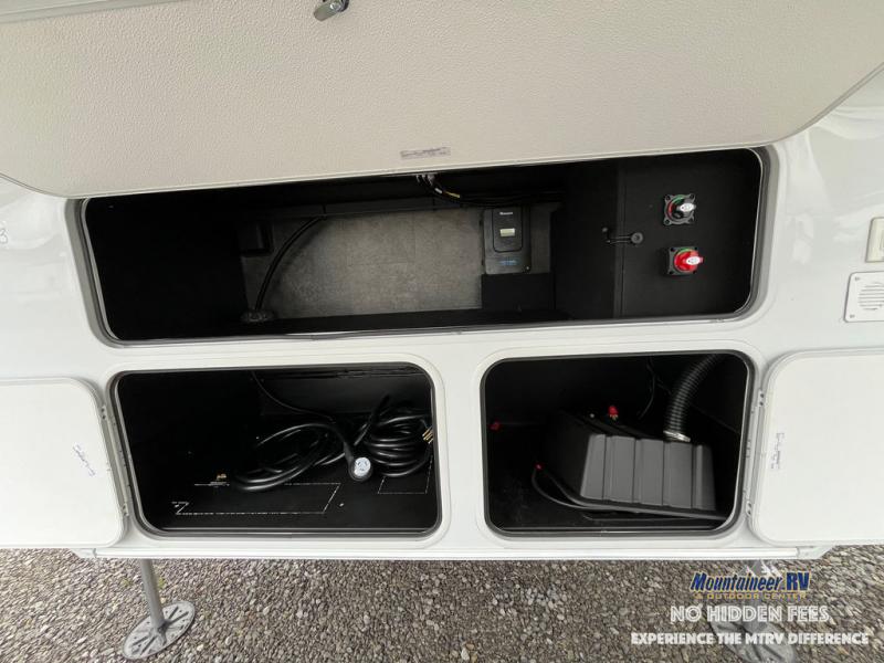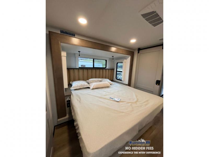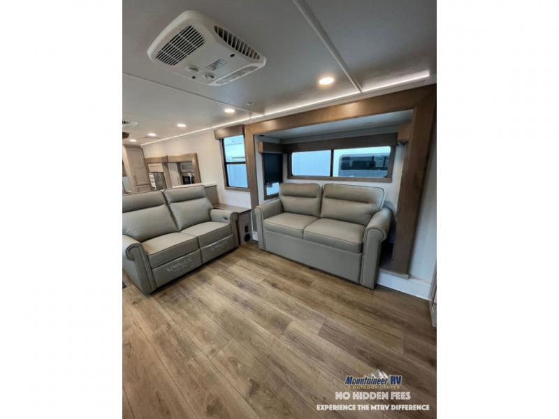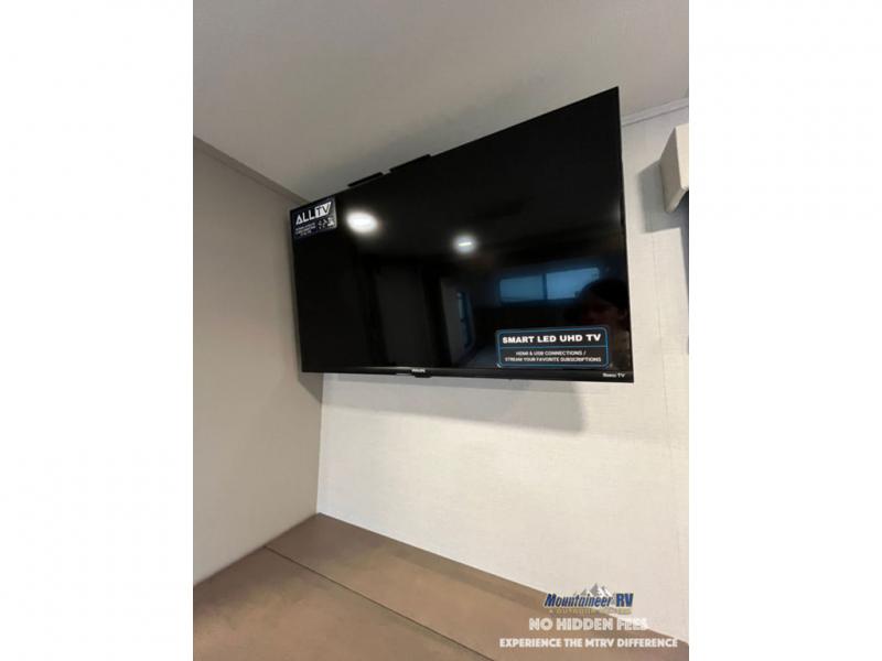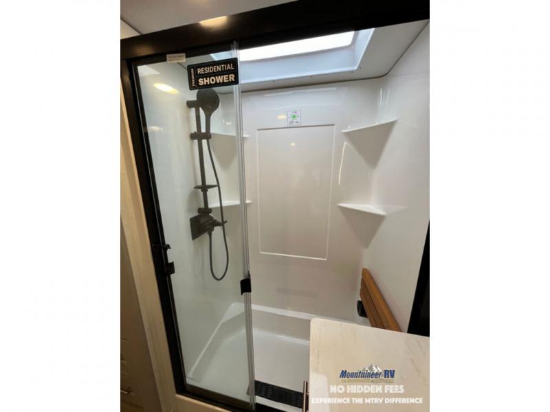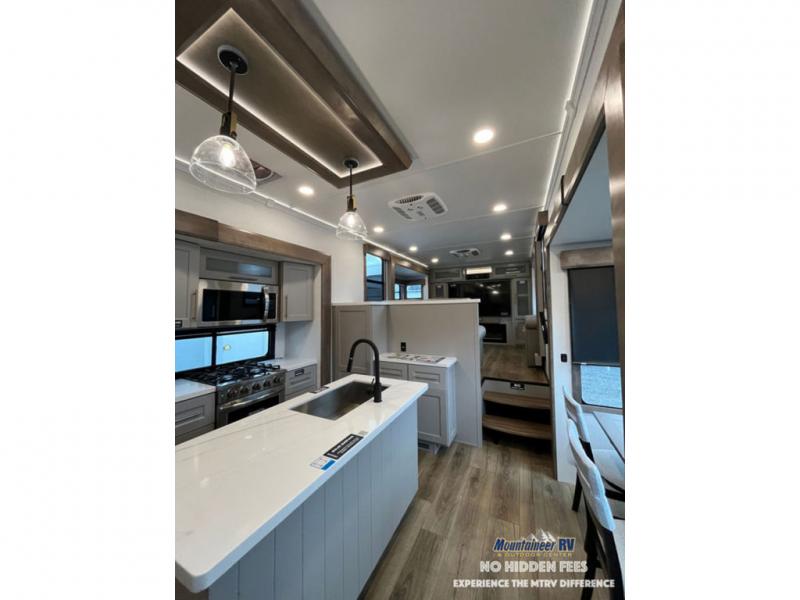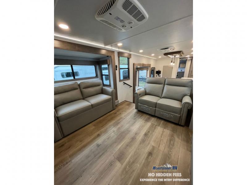 An active family will want this fifth wheel with its 48" x 115" exterior basement pull-out tray for kayaks or extra storage. Just above this area is the master suite with a rear bathroom that offers a residential shower, a porcelain toilet with soft close seat, plus a wardrobe and shelf storage. The king bed slide gives you more floor space, and you will have a seat, a flip-top dresser, and a Smart TV to watch movies in bed. The half bath is next to the main entry which is super convenient, and the middle kitchen is separate from the front living area. The cook will love the residential microwave, range and oven, plus the 19 cu. ft. 12 volt residential refrigerator. There is also a pantry and extra counter space on the kitchen island with a large sink. The views out of the atrium windows in the slide out, which includes the swivel table and desk, are a must see. And when you need to watch the big game, the 55" Smart TV with a pull-out fireplace storage are up front with the dual recliner love seat and two sleeper sofas.