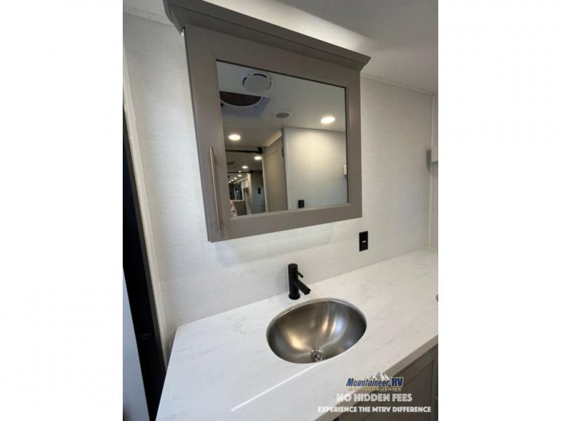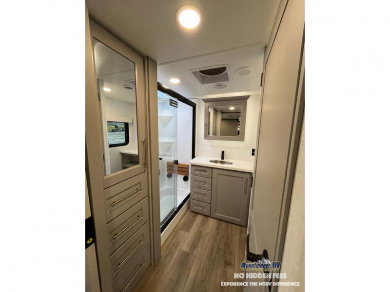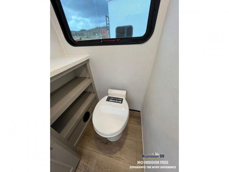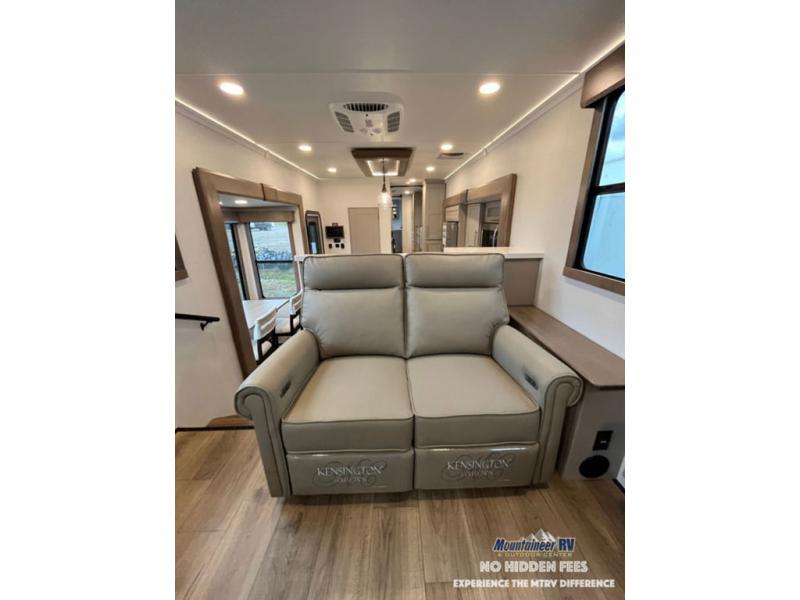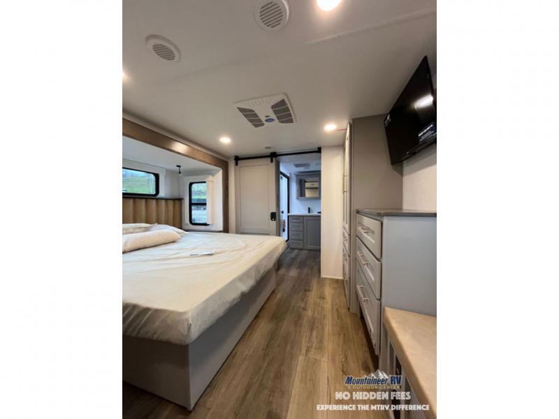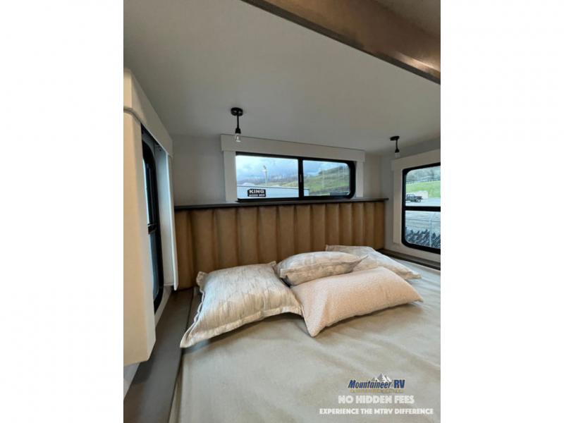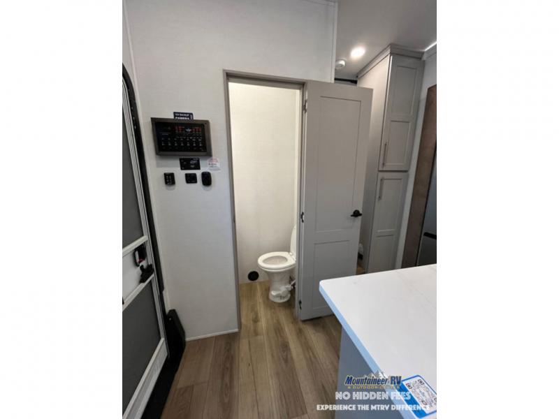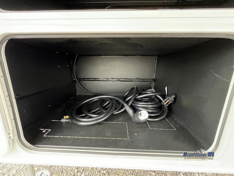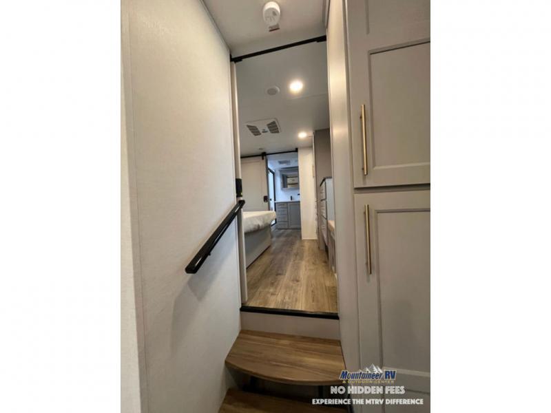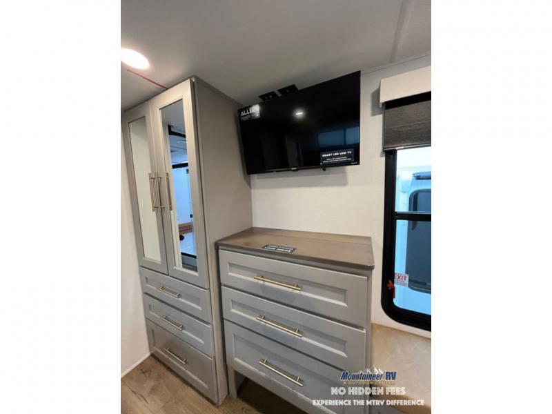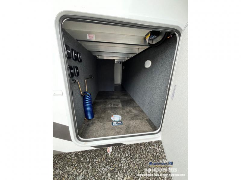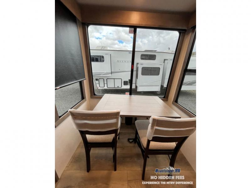 An active family will want this fifth wheel with its 48" x 115" exterior basement pull-out tray for kayaks or extra storage. Just above this area is the master suite with a rear bathroom that offers a residential shower, a porcelain toilet with soft close seat, plus a wardrobe and shelf storage. The king bed slide gives you more floor space, and you will have a seat, a flip-top dresser, and a Smart TV to watch movies in bed. The half bath is next to the main entry which is super convenient, and the middle kitchen is separate from the front living area. The cook will love the residential microwave, range and oven, plus the 19 cu. ft. 12 volt residential refrigerator. There is also a pantry and extra counter space on the kitchen island with a large sink. The views out of the atrium windows in the slide out, which includes the swivel table and desk, are a must see. And when you need to watch the big game, the 55" Smart TV with a pull-out fireplace storage are up front with the dual recliner love seat and two sleeper sofas.