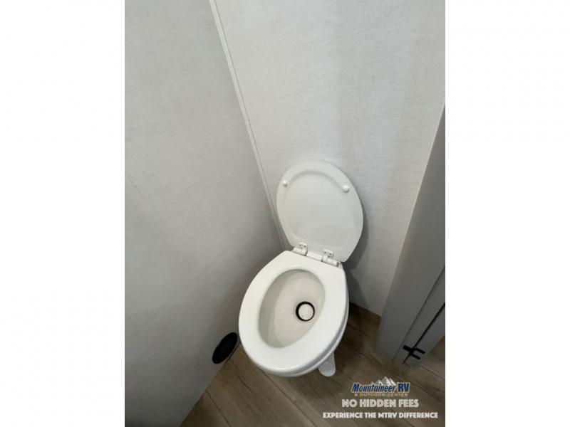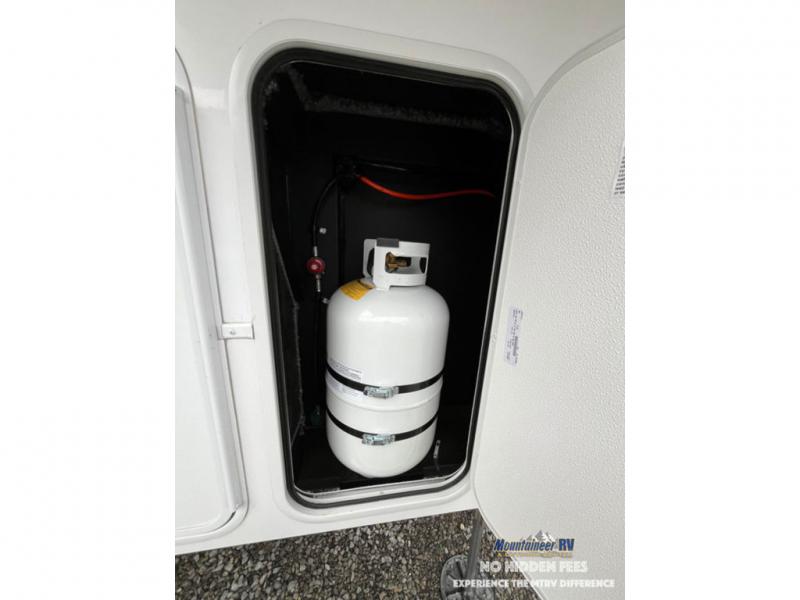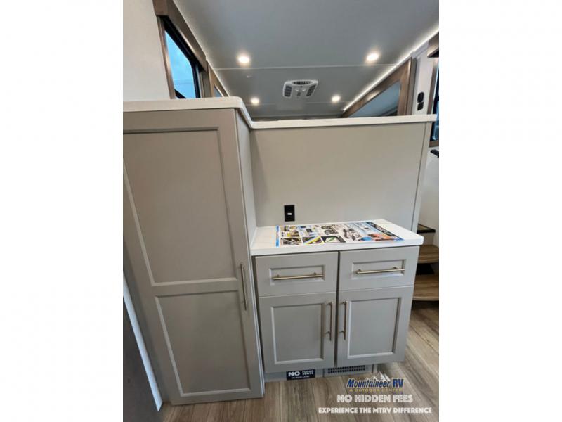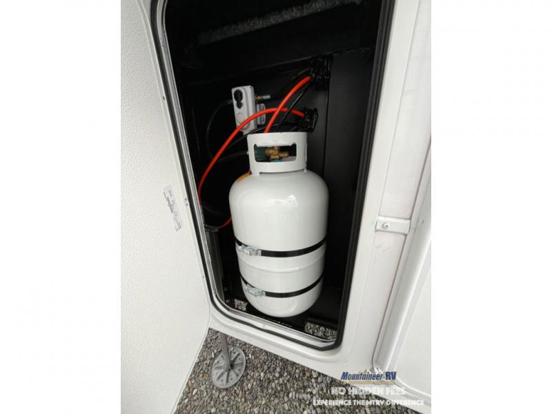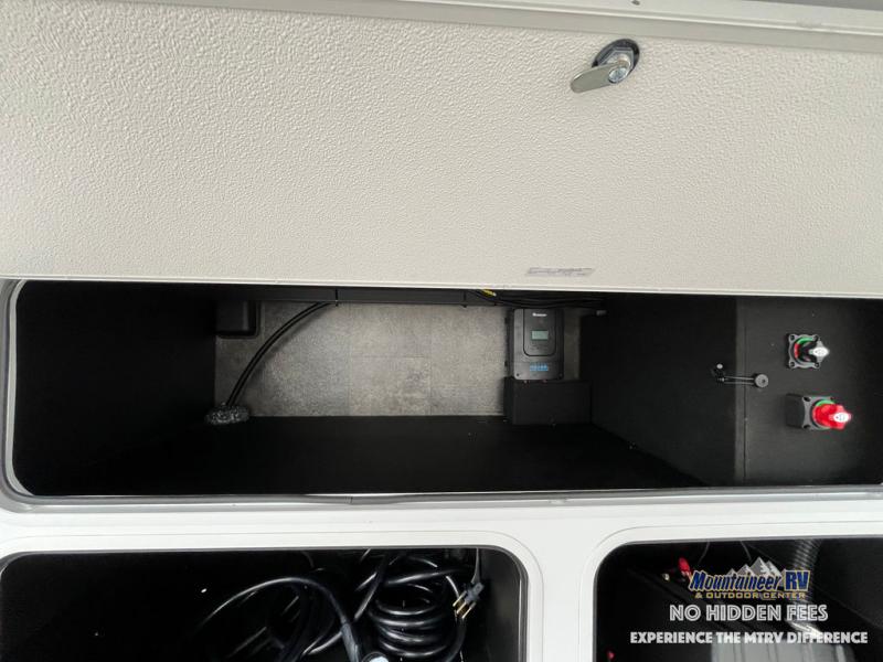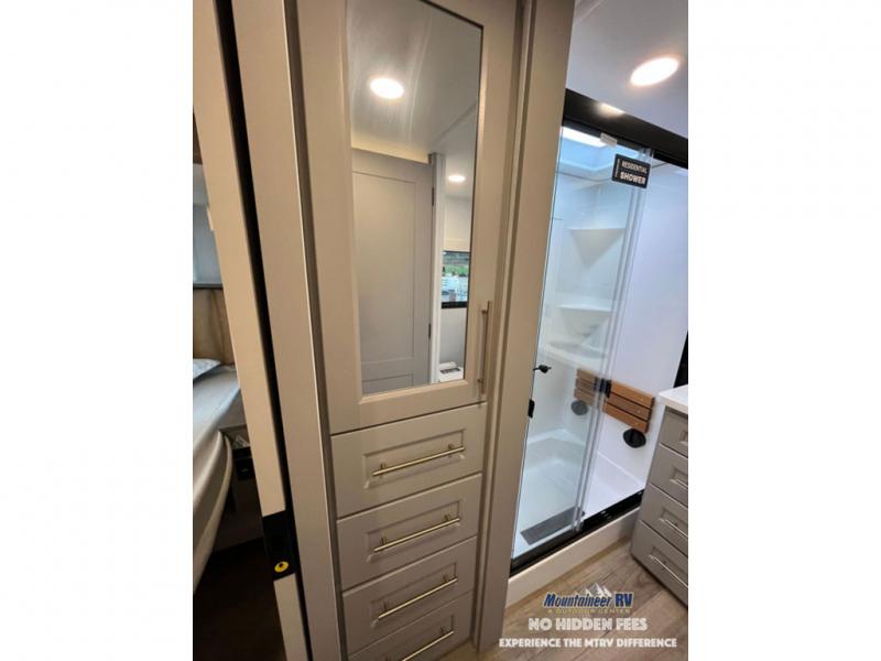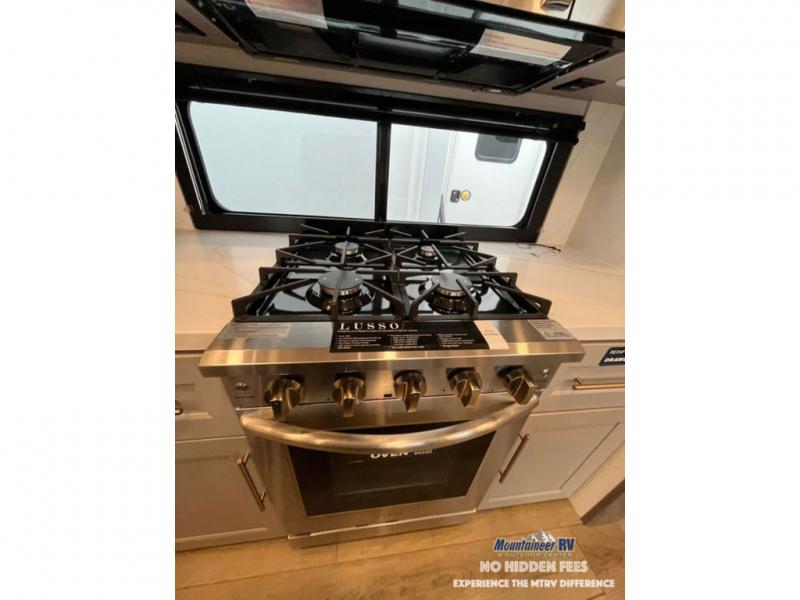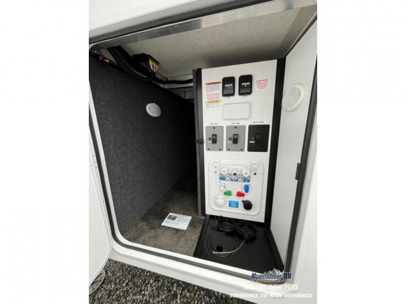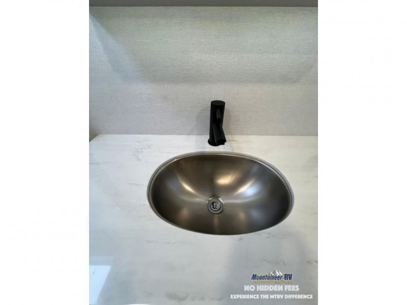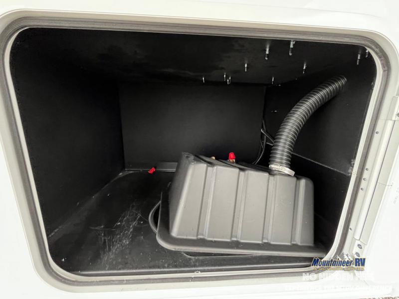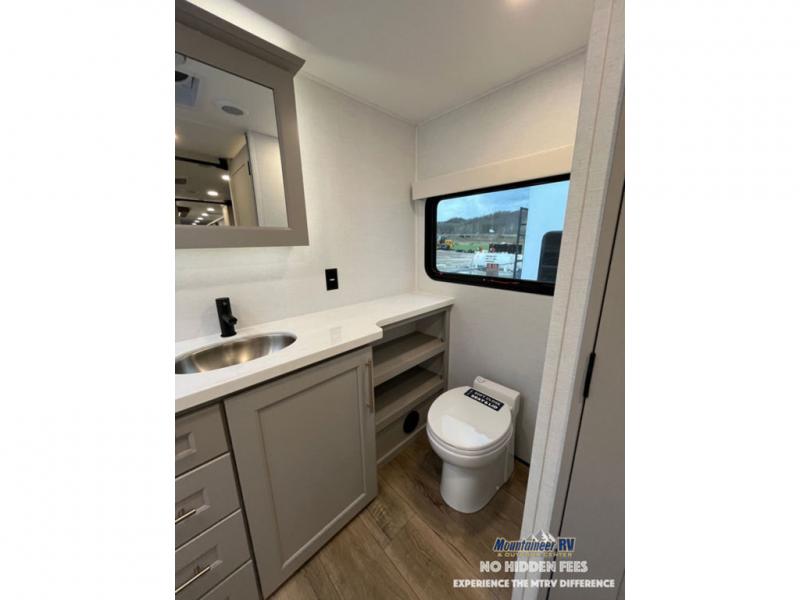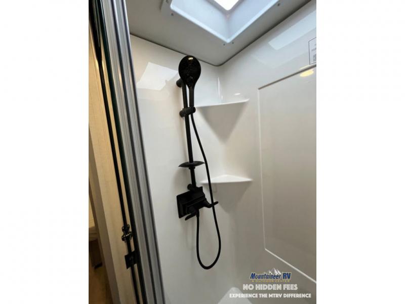An active family will want this fifth wheel with its 48" x 115" exterior basement pull-out tray for kayaks or extra storage. Just above this area is the master suite with a rear bathroom that offers a residential shower, a porcelain toilet with soft close seat, plus a wardrobe and shelf storage. The king bed slide gives you more floor space, and you will have a seat, a flip-top dresser, and a Smart TV to watch movies in bed. The half bath is next to the main entry which is super convenient, and the middle kitchen is separate from the front living area. The cook will love the residential microwave, range and oven, plus the 19 cu. ft. 12 volt residential refrigerator. There is also a pantry and extra counter space on the kitchen island with a large sink. The views out of the atrium windows in the slide out, which includes the swivel table and desk, are a must see. And when you need to watch the big game, the 55" Smart TV with a pull-out fireplace storage are up front with the dual recliner love seat and two sleeper sofas.