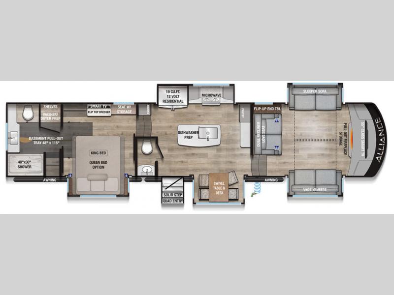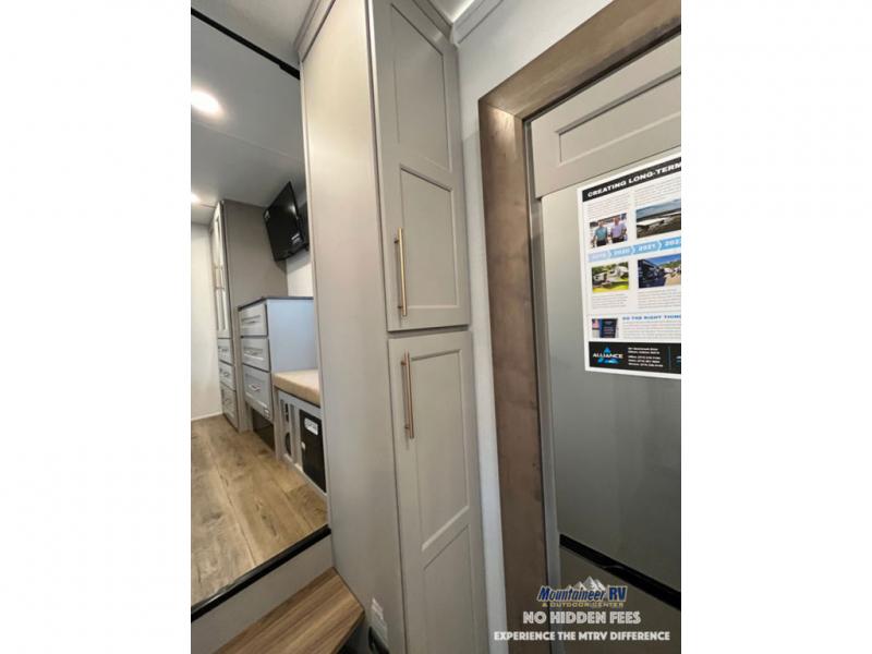 The Paradigm fifth wheels by Alliance RV are functional, high-quality, and luxurious for an unforgettable camping experience. There are three A/C units and a 40K BTU furnace to keep you comfortable year around, and you'll appreciate additional convenient amenities, like the all-in-one enclosed/heated utility center and the color coded and numbered wiring. A Helux Series coil spring pin box comes standard for hassle-free towing, along with Super-G 4,400 lb. rated tires and Dexter 7,000 lb. axles. You'll love the kitchen with its LG solid surface countertops and Lusso range, plus there is LED motion lighting in the pantry and a Maxx fan with a rain sensor to keep everything fresh when making dinner. Each model also includes an HD Smart TV in the living room and bedroom, plus a Winegard Air 360 antenna to keep you connected to the outside world. And of course there are a variety of options you can choose from to further customize your fifth wheel; dual pane windows, Super Solar Plus, slide out awning toppers, and generator prep or a generator to name a few!