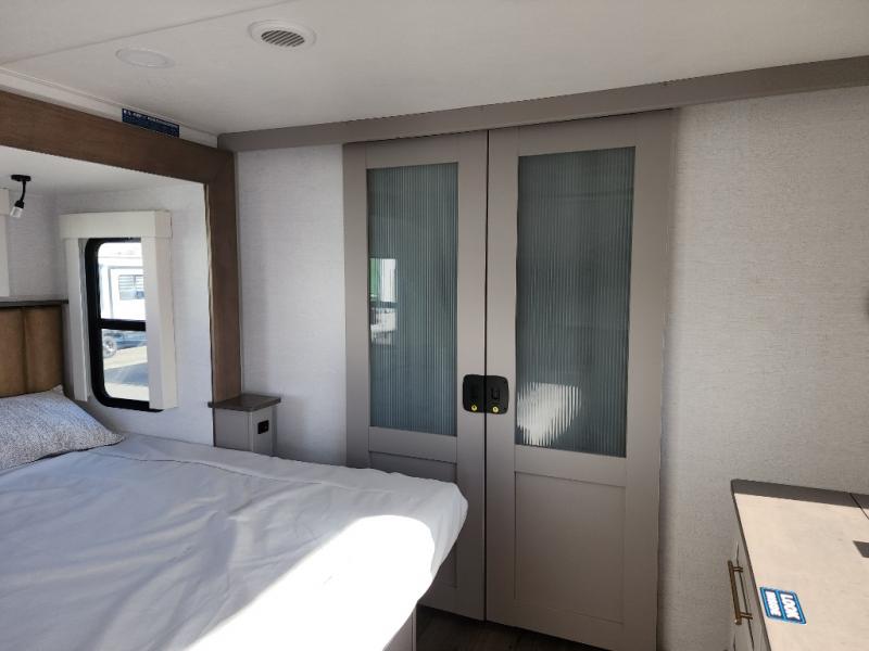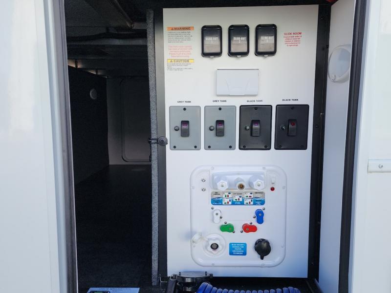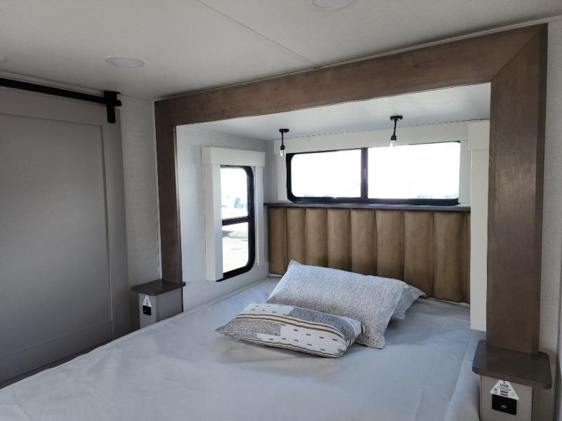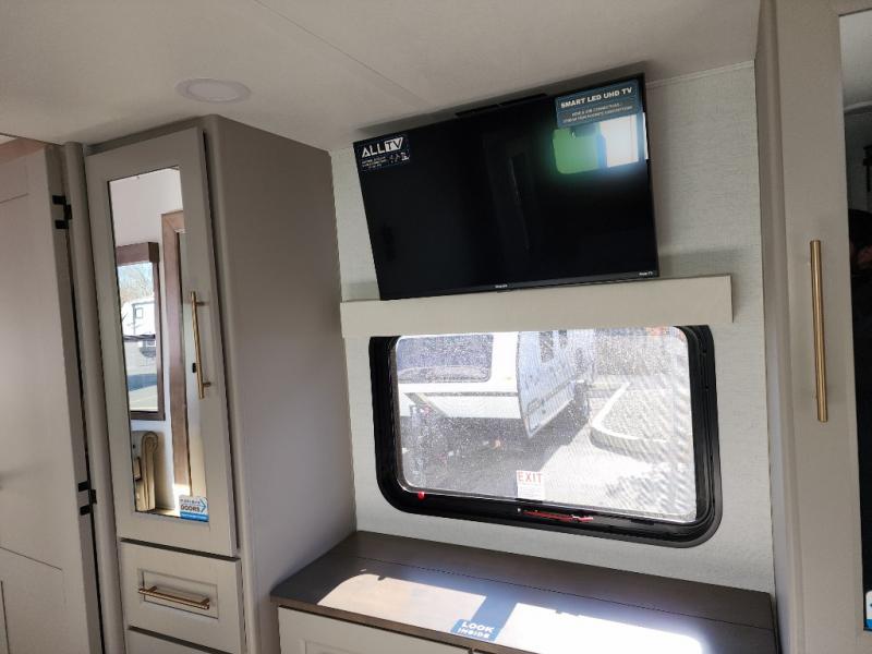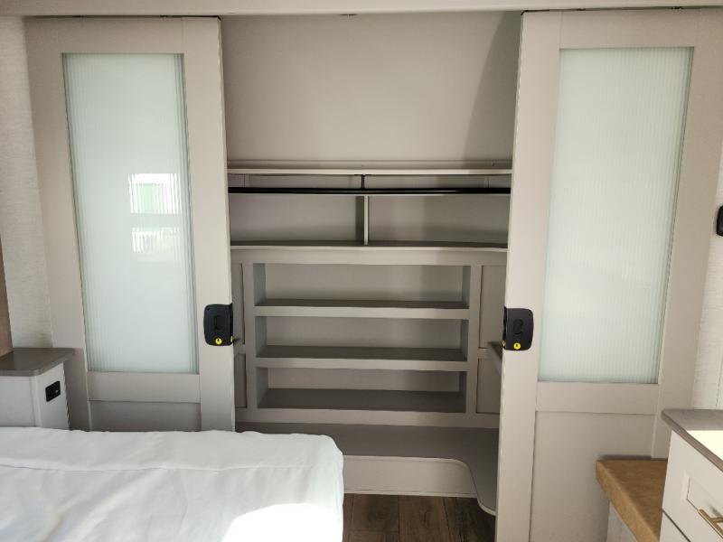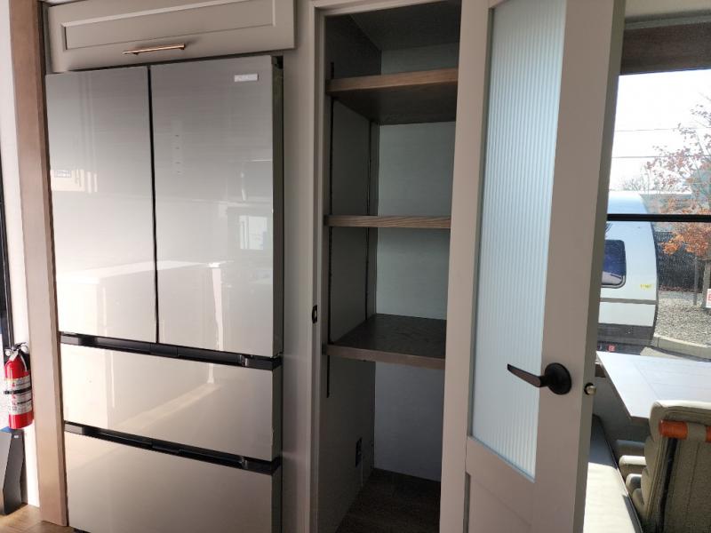 A spacious unit with sleeping for eight with plenty of choices to suit everyone! There is a front private bedroom with a king size bed that offers a large full front closet that has also been prepped for a washer and dryer if you choose that option. The front bath features a 40" x 30" shower and dual entry. Head down to the kitchen and living space at the bottom of the stairs to find a curbside slide that houses the 19 cu. ft. residential refrigerator, a pantry, and a swivel table and desk. As you continue on toward the rear of this coach, you will find a spacious living area along the roadside with a 50" Smart TV and a fireplace, a sofa sleeper slide, and a dual reclining loveseat. This makes a great gathering place for television watching, game playing, and even added sleeping space if needed at night. The rear private bedroom with its own private bath features a queen bed, two closets, and a Smart TV as well. The multipurpose loft area above can be accessed just before this rear bedroom entry by a ladder, and it is perfect for extra storage, or it can be used for added sleeping that the kiddos are sure to love.