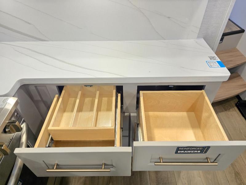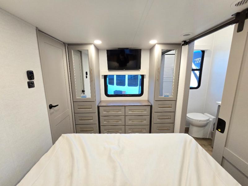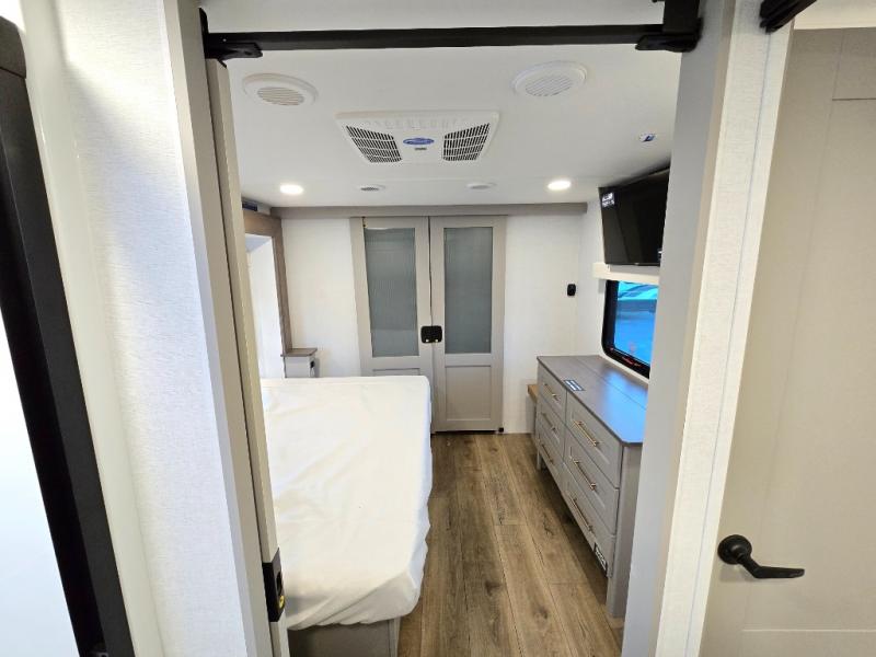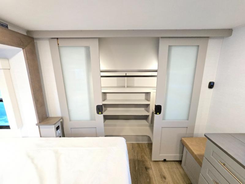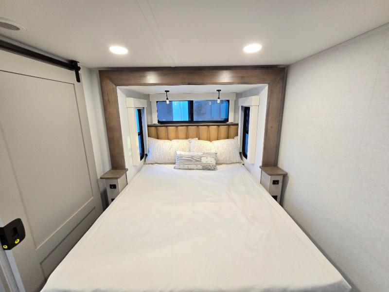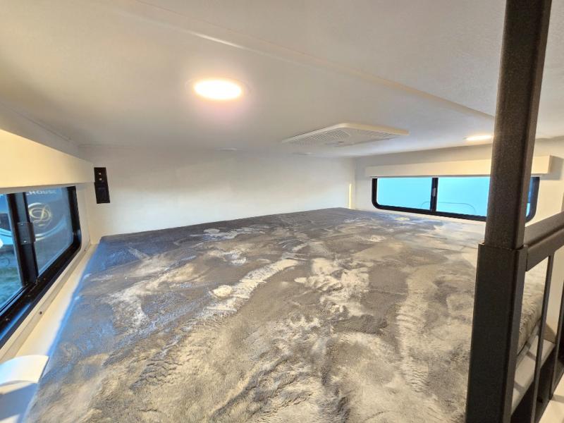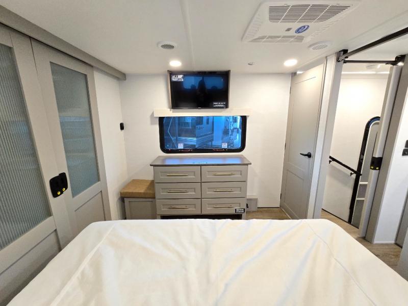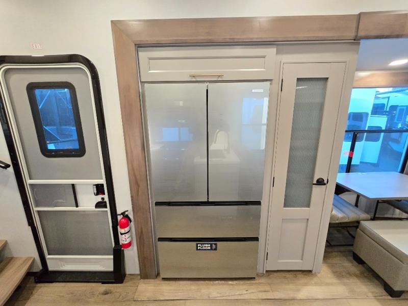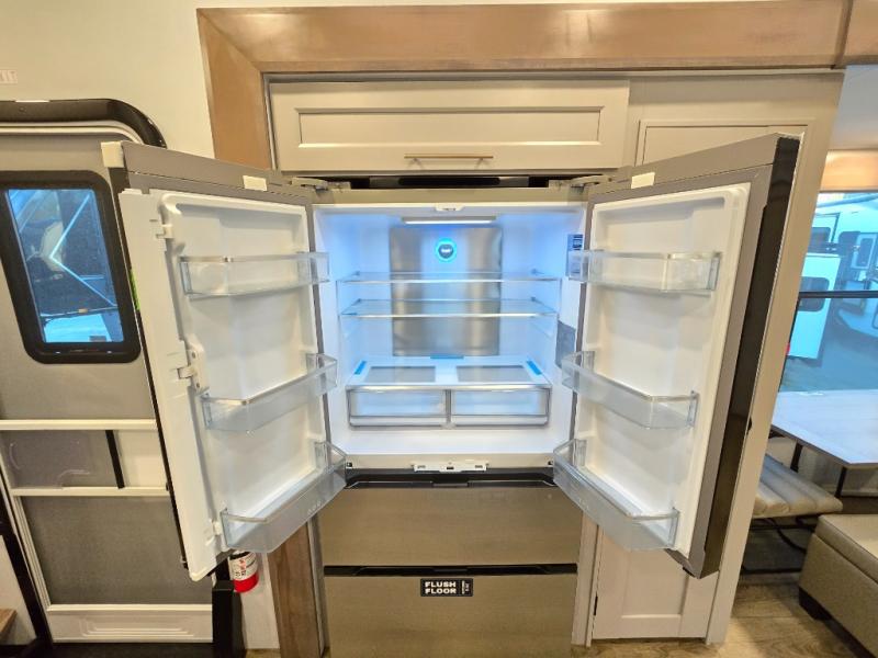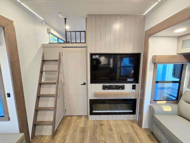 A spacious unit with sleeping for eight with plenty of choices to suit everyone! There is a front private bedroom with a king size bed that offers a large full front closet that has also been prepped for a washer and dryer if you choose that option. The front bath features a 40" x 30" shower and dual entry. Head down to the kitchen and living space at the bottom of the stairs to find a curbside slide that houses the 19 cu. ft. residential refrigerator, a pantry, and a swivel table and desk. As you continue on toward the rear of this coach, you will find a spacious living area along the roadside with a 50" Smart TV and a fireplace, a sofa sleeper slide, and a dual reclining loveseat. This makes a great gathering place for television watching, game playing, and even added sleeping space if needed at night. The rear private bedroom with its own private bath features a queen bed, two closets, and a Smart TV as well. The multipurpose loft area above can be accessed just before this rear bedroom entry by a ladder, and it is perfect for extra storage, or it can be used for added sleeping that the kiddos are sure to love.