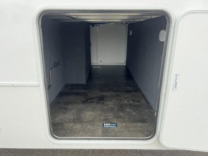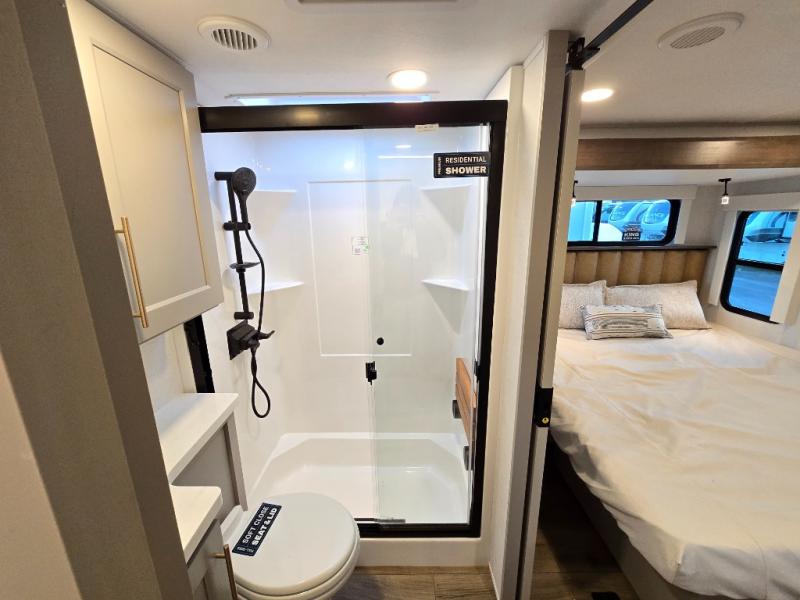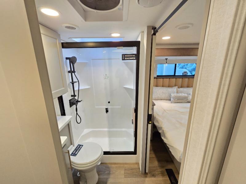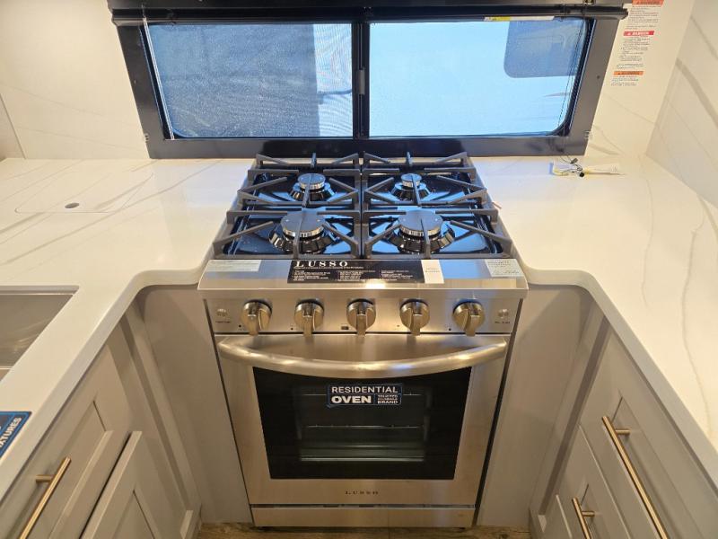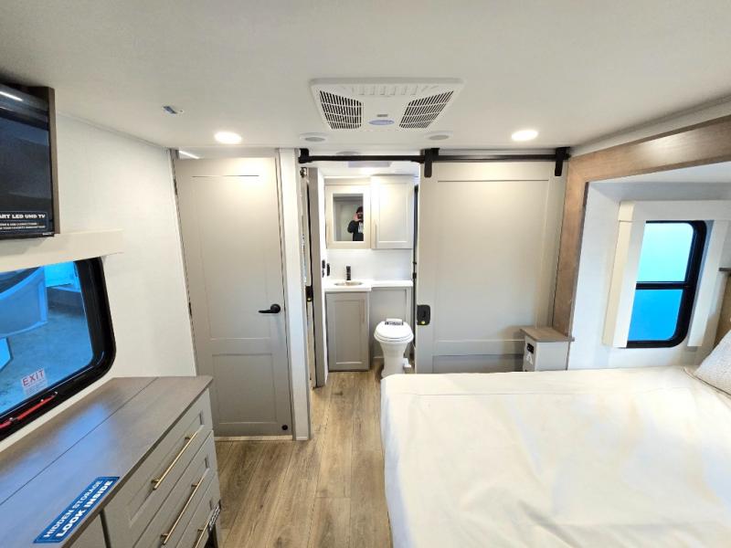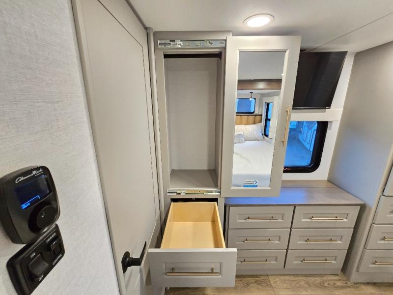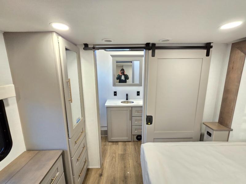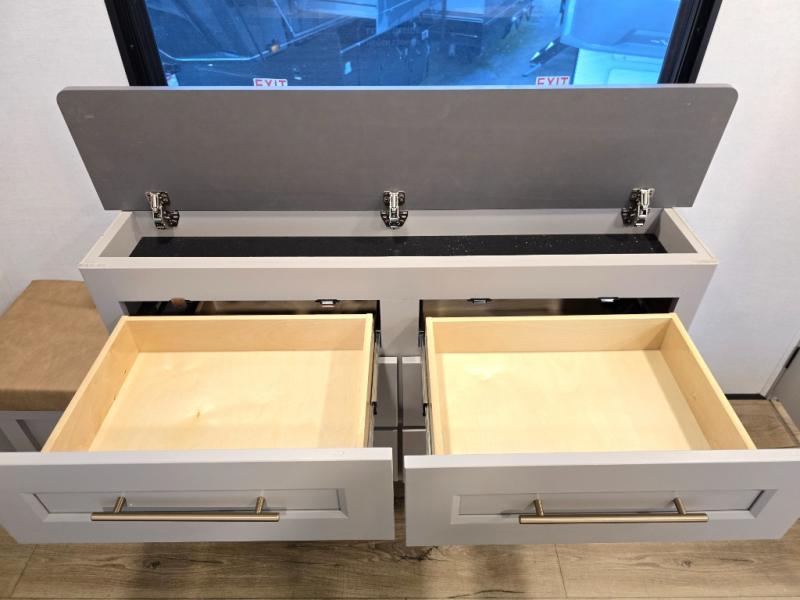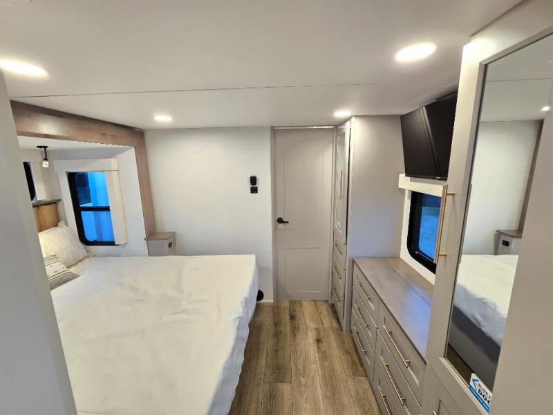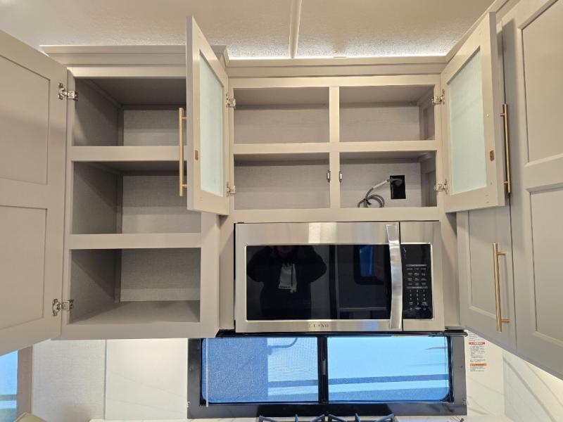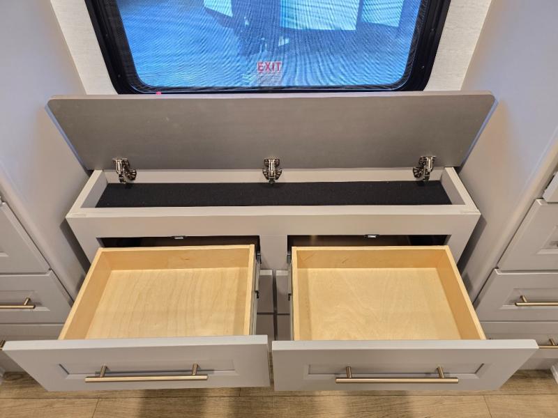 A spacious unit with sleeping for eight with plenty of choices to suit everyone! There is a front private bedroom with a king size bed that offers a large full front closet that has also been prepped for a washer and dryer if you choose that option. The front bath features a 40" x 30" shower and dual entry. Head down to the kitchen and living space at the bottom of the stairs to find a curbside slide that houses the 19 cu. ft. residential refrigerator, a pantry, and a swivel table and desk. As you continue on toward the rear of this coach, you will find a spacious living area along the roadside with a 50" Smart TV and a fireplace, a sofa sleeper slide, and a dual reclining loveseat. This makes a great gathering place for television watching, game playing, and even added sleeping space if needed at night. The rear private bedroom with its own private bath features a queen bed, two closets, and a Smart TV as well. The multipurpose loft area above can be accessed just before this rear bedroom entry by a ladder, and it is perfect for extra storage, or it can be used for added sleeping that the kiddos are sure to love.