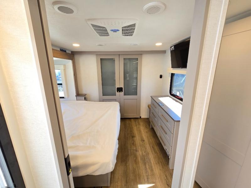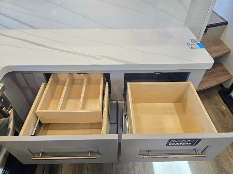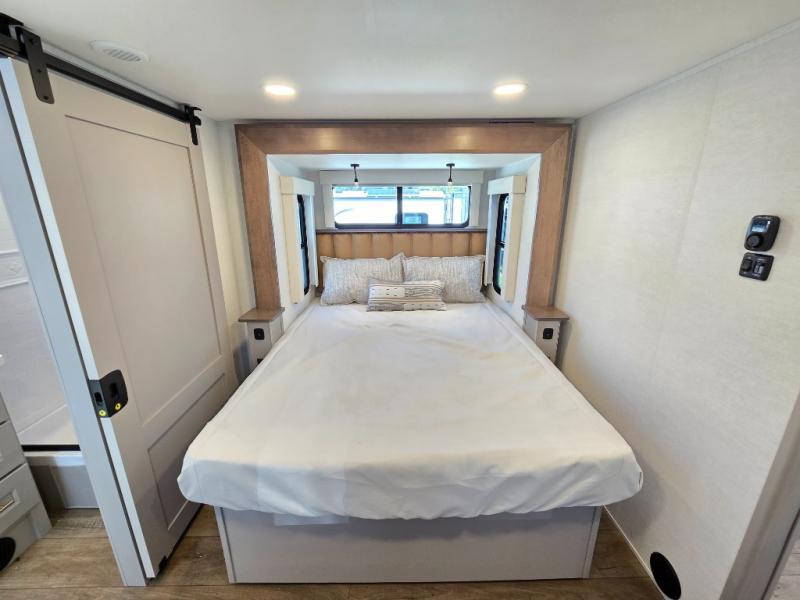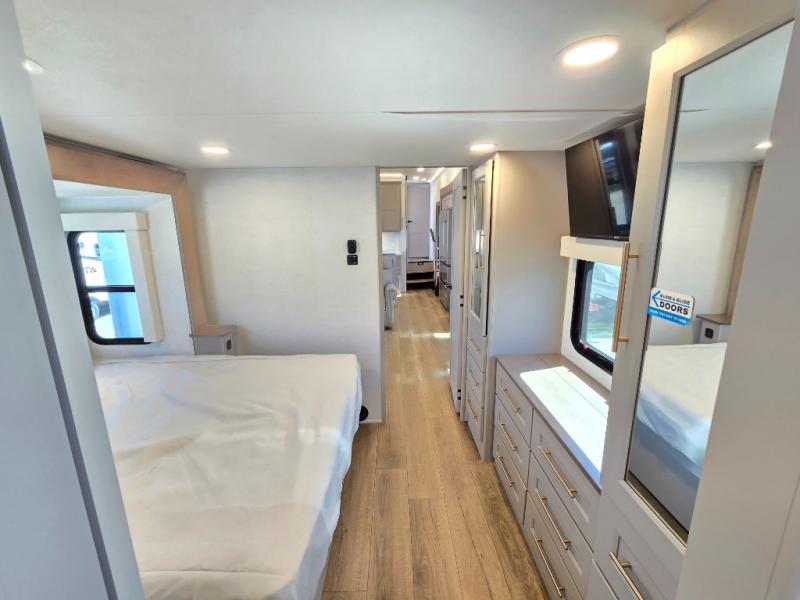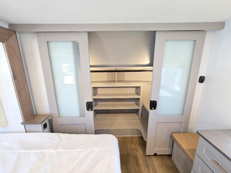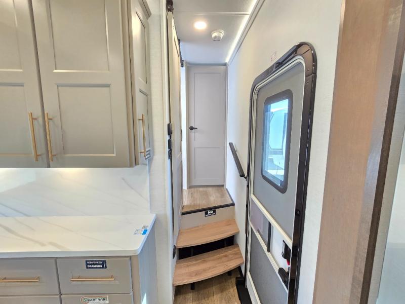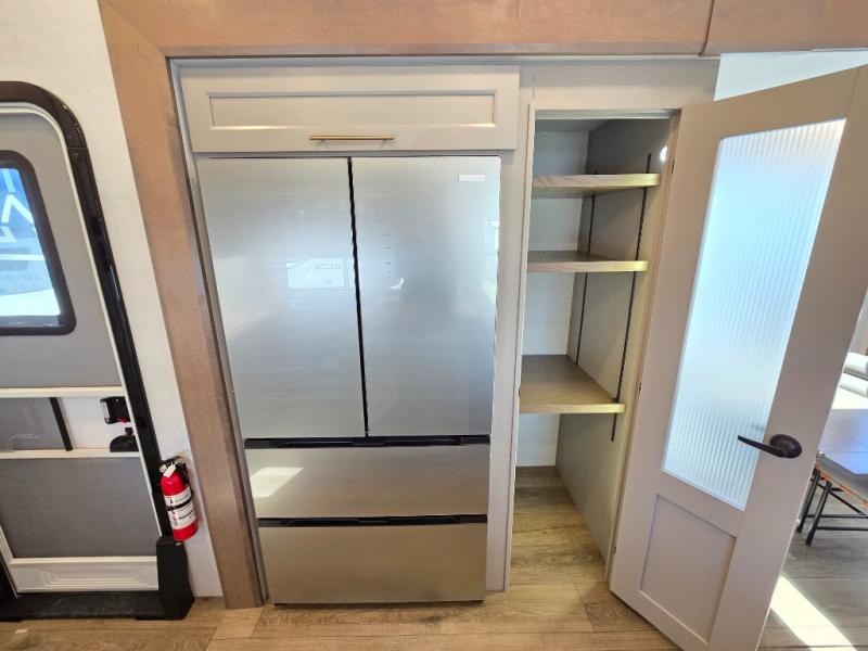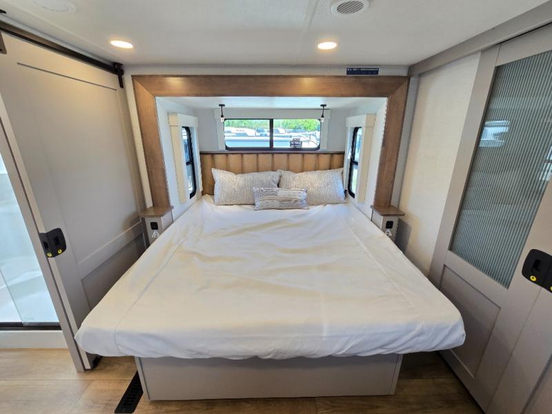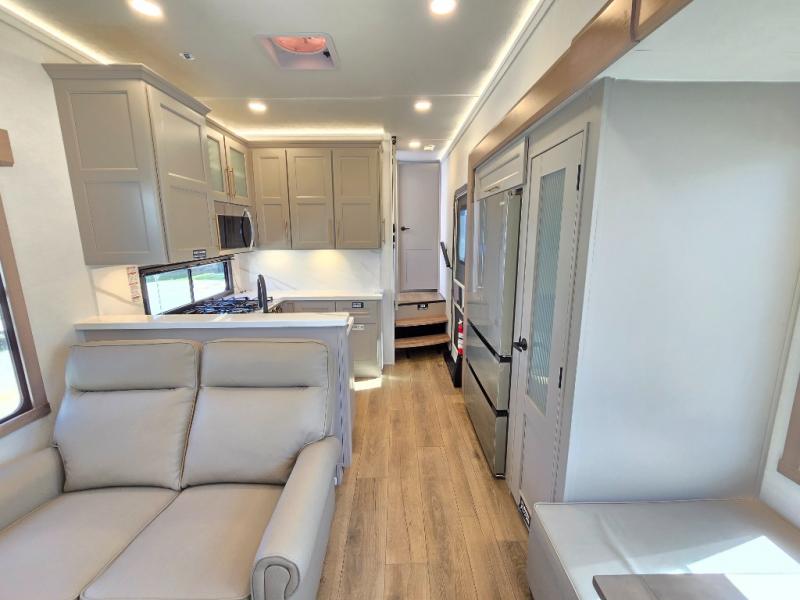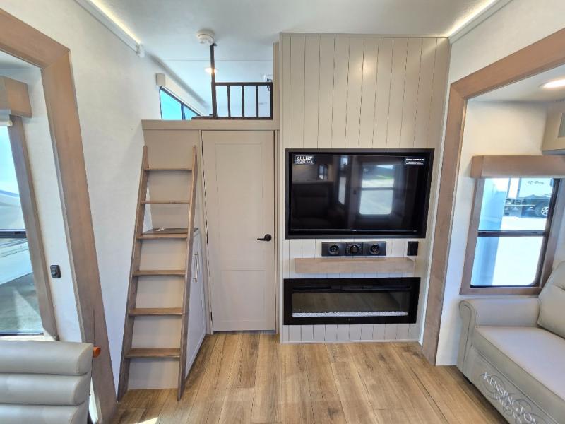 A spacious unit with sleeping for eight with plenty of choices to suit everyone! There is a front private bedroom with a king size bed that offers a large full front closet that has also been prepped for a washer and dryer if you choose that option. The front bath features a 40" x 30" shower and dual entry. Head down to the kitchen and living space at the bottom of the stairs to find a curbside slide that houses the 19 cu. ft. residential refrigerator, a pantry, and a swivel table and desk. As you continue on toward the rear of this coach, you will find a spacious living area along the roadside with a 50" Smart TV and a fireplace, a sofa sleeper slide, and a dual reclining loveseat. This makes a great gathering place for television watching, game playing, and even added sleeping space if needed at night. The rear private bedroom with its own private bath features a queen bed, two closets, and a Smart TV as well. The multipurpose loft area above can be accessed just before this rear bedroom entry by a ladder, and it is perfect for extra storage, or it can be used for added sleeping that the kiddos are sure to love.
