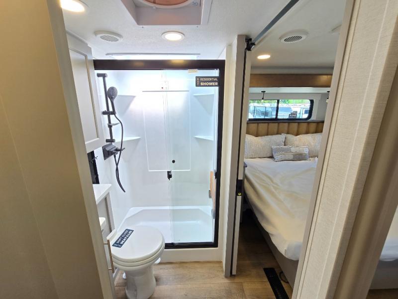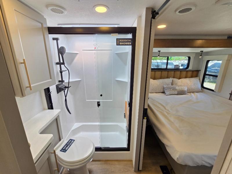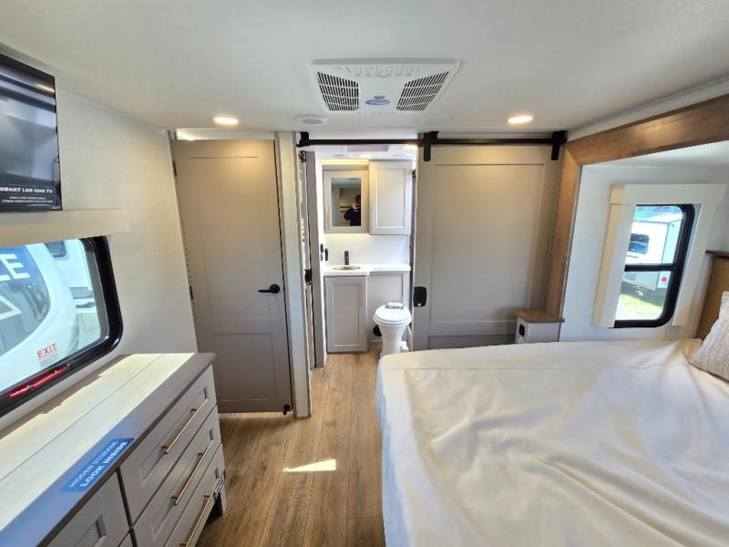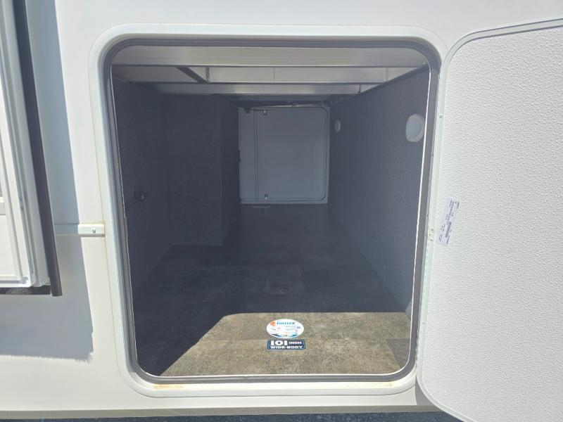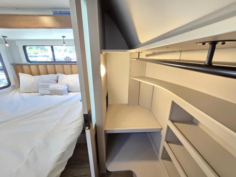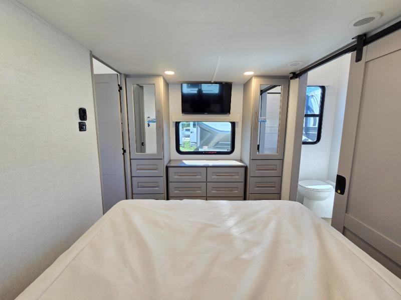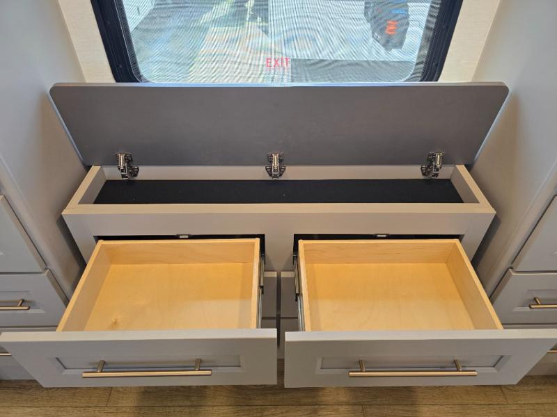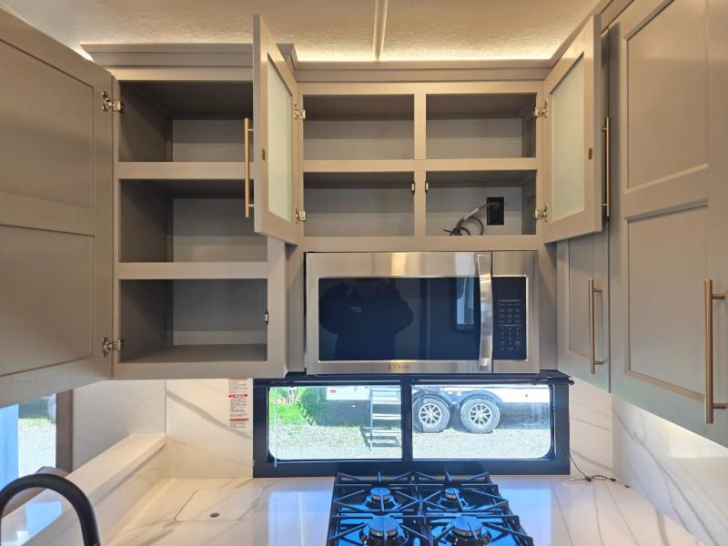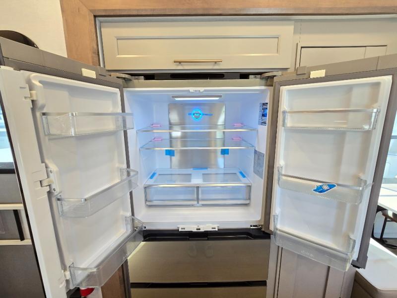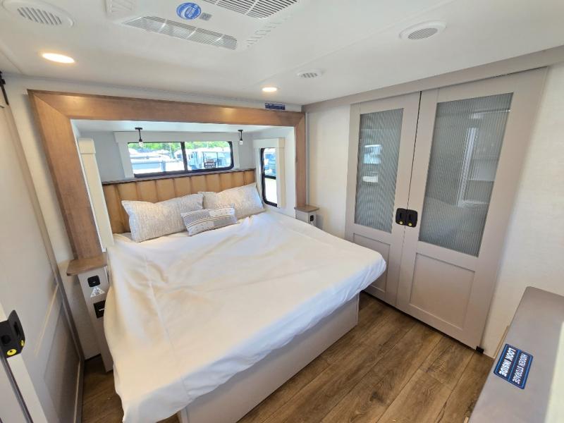A spacious unit with sleeping for eight with plenty of choices to suit everyone! There is a front private bedroom with a king size bed that offers a large full front closet that has also been prepped for a washer and dryer if you choose that option. The front bath features a 40" x 30" shower and dual entry. Head down to the kitchen and living space at the bottom of the stairs to find a curbside slide that houses the 19 cu. ft. residential refrigerator, a pantry, and a swivel table and desk. As you continue on toward the rear of this coach, you will find a spacious living area along the roadside with a 50" Smart TV and a fireplace, a sofa sleeper slide, and a dual reclining loveseat. This makes a great gathering place for television watching, game playing, and even added sleeping space if needed at night. The rear private bedroom with its own private bath features a queen bed, two closets, and a Smart TV as well. The multipurpose loft area above can be accessed just before this rear bedroom entry by a ladder, and it is perfect for extra storage, or it can be used for added sleeping that the kiddos are sure to love.