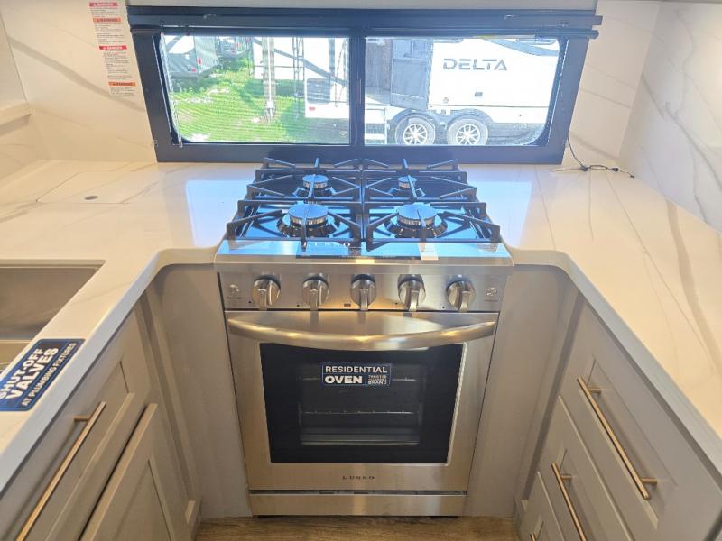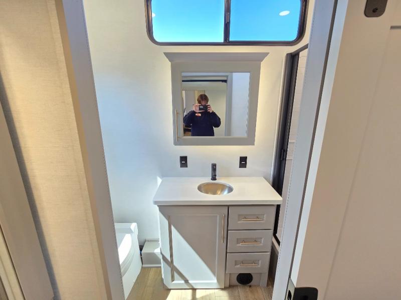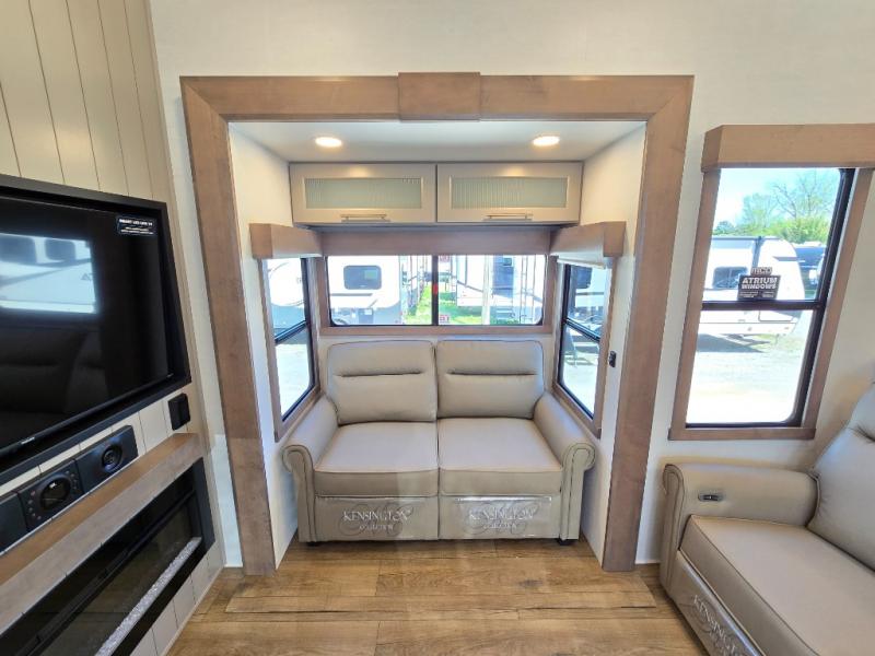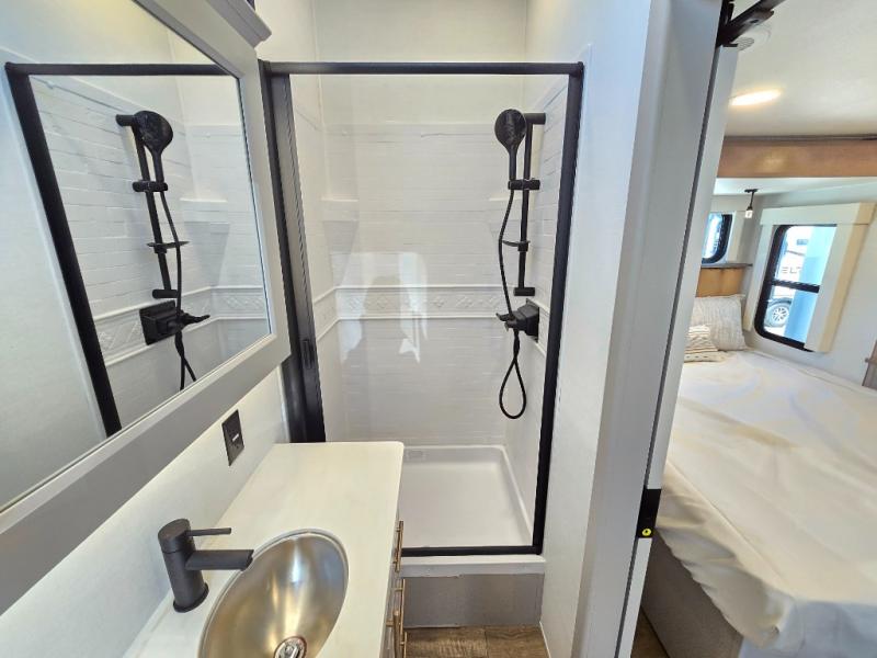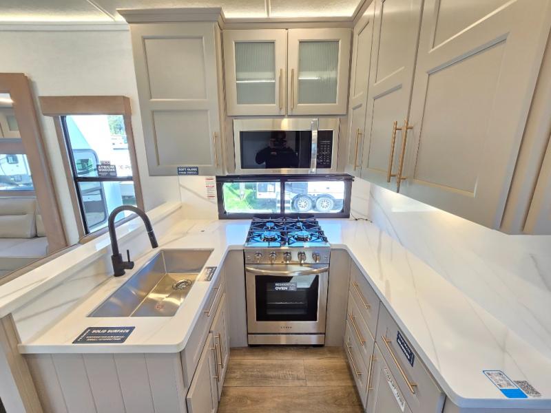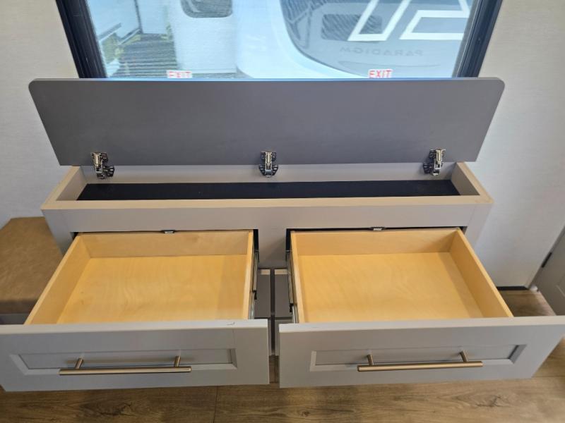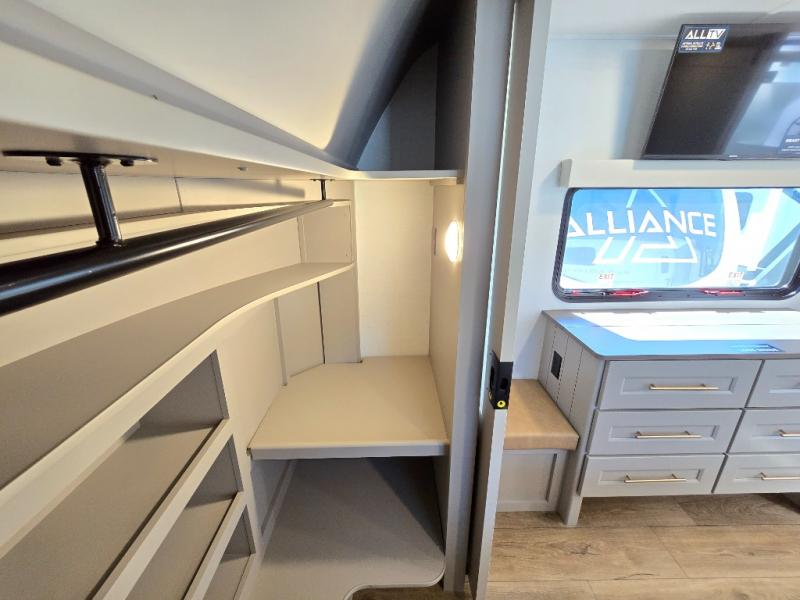 The Paradigm fifth wheels by Alliance RV are functional, high-quality, and luxurious for an unforgettable camping experience. There are three A/C units and a 40K BTU furnace to keep you comfortable year around, and you'll appreciate additional convenient amenities, like the all-in-one enclosed/heated utility center and the color coded and numbered wiring. A Rota-Flex pin box comes standard for hassle-free towing, along with Super-G 4,400 lb. rated tires and Dexter 7,000 lb. axles. You'll love the kitchen with its LG solid surface countertops and Insignia range, plus there is LED motion lighting in the pantry and a Maxx fan with a rain sensor to keep everything fresh when making dinner. Each model also includes an HD Smart TV in the living room and bedroom, plus a Winegard Air 360 antenna to keep you connected to the outside world. And of course there are a variety of options you can choose from to further customize your fifth wheel; dual pane windows, Super Solar Plus, slide out awning toppers, and generator prep or a generator to name a few!