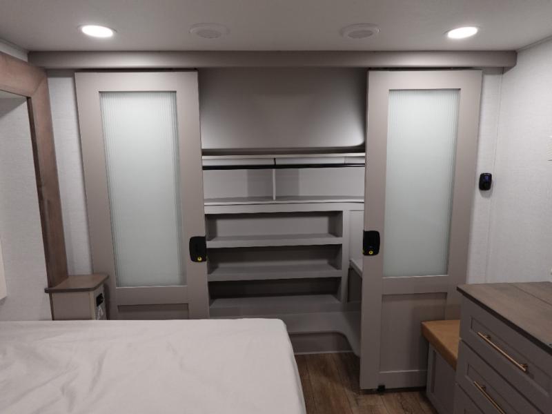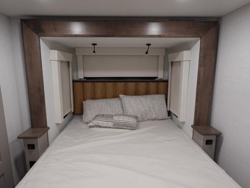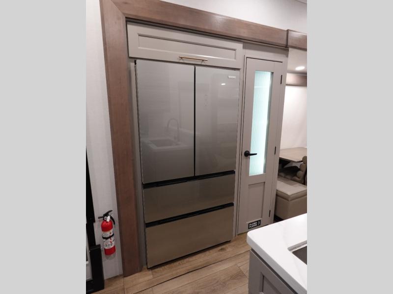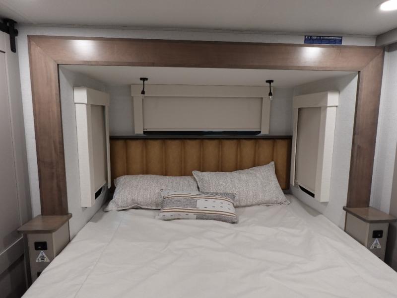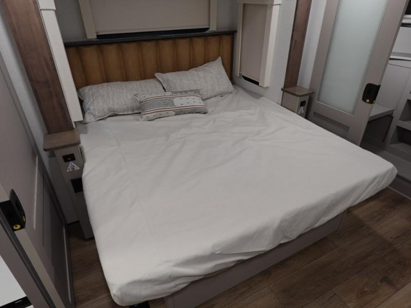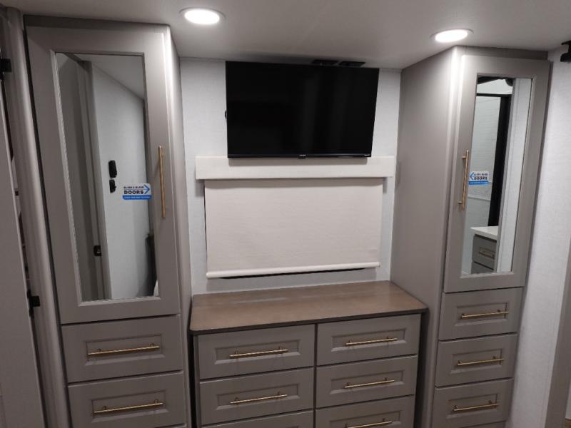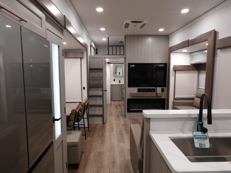 The Paradigm fifth wheels by Alliance RV are functional, high-quality, and luxurious for an unforgettable camping experience. There are three A/C units and a 40K BTU furnace to keep you comfortable year around, and you'll appreciate additional convenient amenities, like the all-in-one enclosed/heated utility center and the color coded and numbered wiring. A Rota-Flex pin box comes standard for hassle-free towing, along with Super-G 4,400 lb. rated tires and Dexter 7,000 lb. axles. You'll love the kitchen with its LG solid surface countertops and Lusso range, plus there is LED motion lighting in the pantry and a Maxx fan with a rain sensor to keep everything fresh when making dinner. Each model also includes an HD Smart TV in the living room and bedroom, plus a Winegard Air 360 antenna to keep you connected to the outside world.