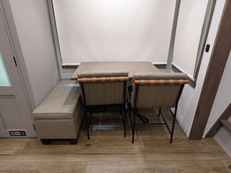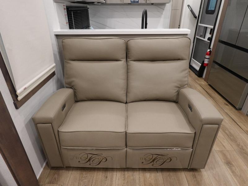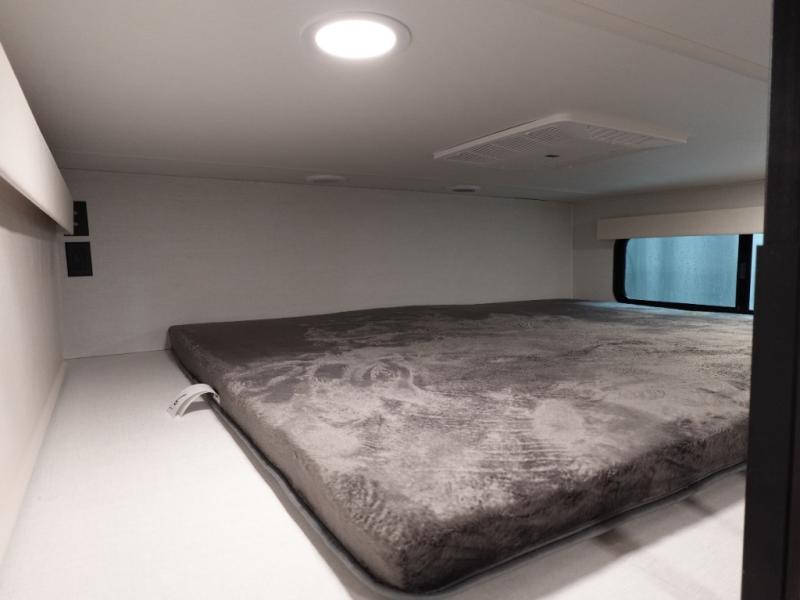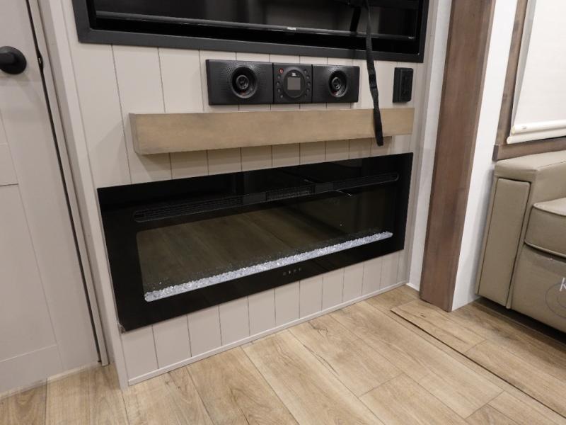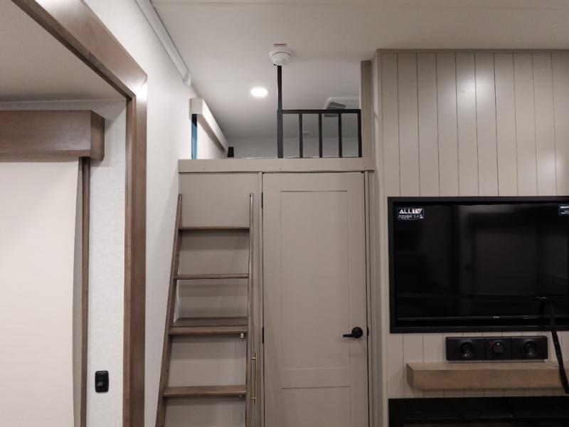 A spacious unit with sleeping for eight with plenty of choices to suit everyone! There is a front private bedroom with a king size bed that offers a large full front closet that has also been prepped for a washer and dryer if you choose to add. The front bath features a 40" x 30" shower and dual entry. Head down to the kitchen and living space at the bottom of the stairs to find a curbside slide that houses the 19 cu. ft. residential refrigerator, a pantry, and a swivel table and desk. As you continue on toward the rear of this coach, you will find a spacious living area along the roadside with a 50" Smart TV and a fireplace, a sofa sleeper slide, and a dual reclining loveseat. This makes a great gathering place for television watching, game playing, and even added sleeping space if needed at night. The rear private bedroom with its own private bath features a queen bed, two closets, and a Smart TV as well. The multipurpose loft area above can be accessed just before this rear bedroom entry by a ladder, and it is perfect for extra storage, or it can be used for added sleeping that the kiddos are sure to love.