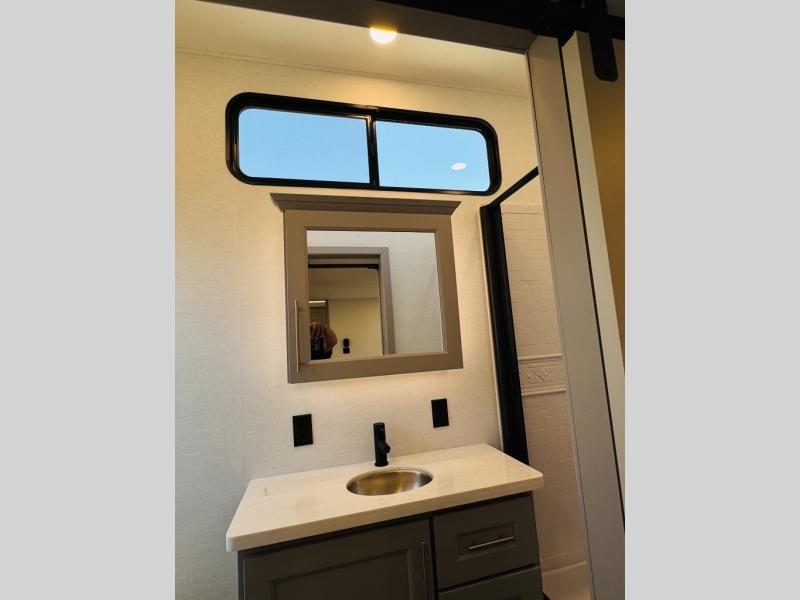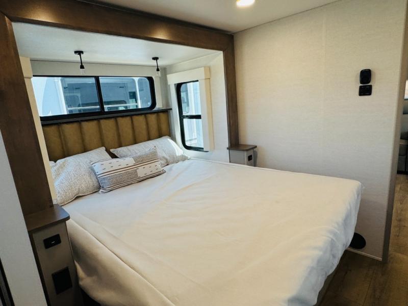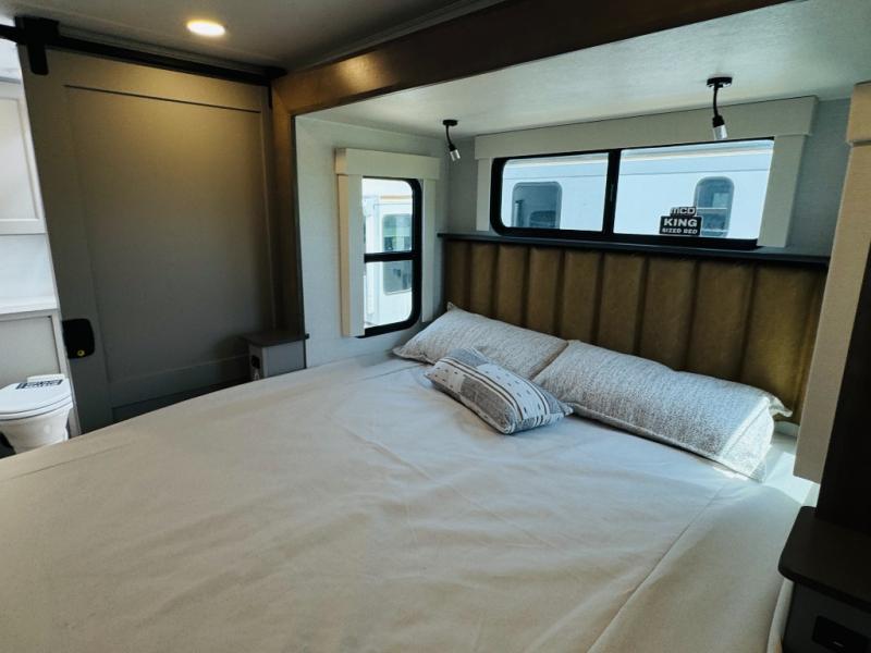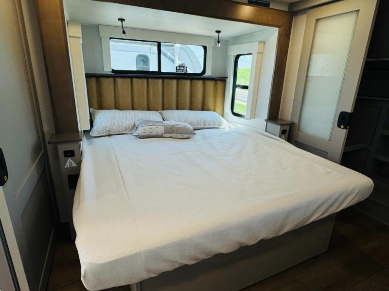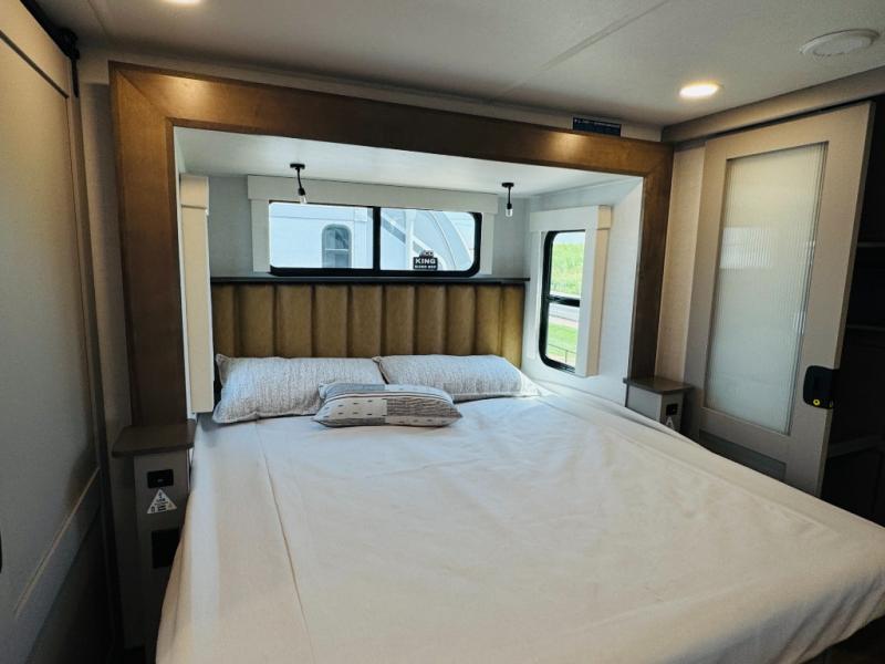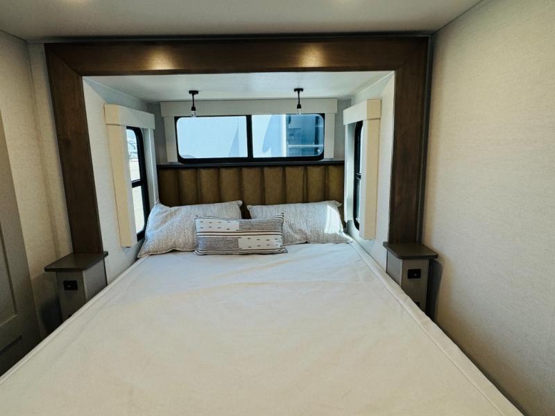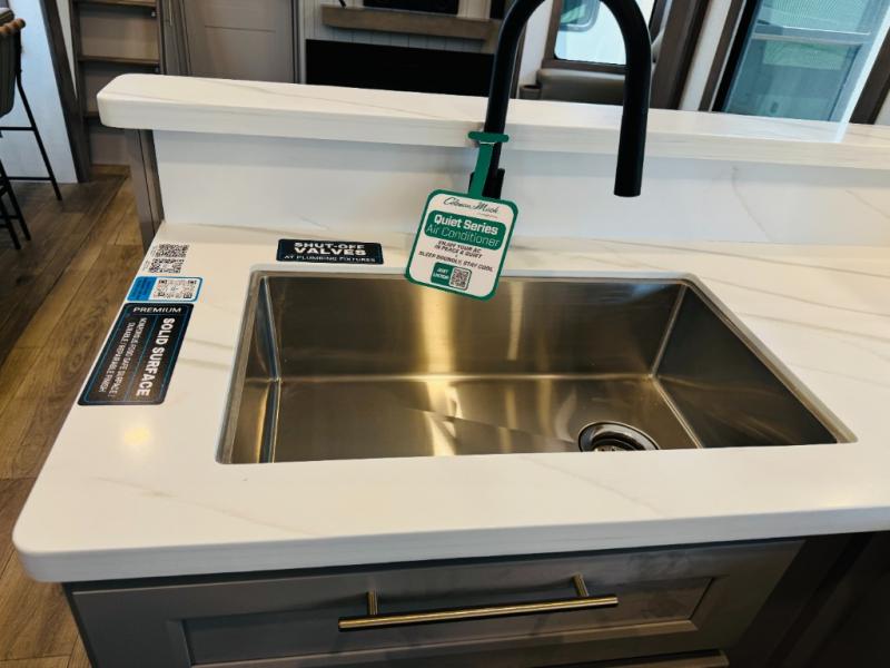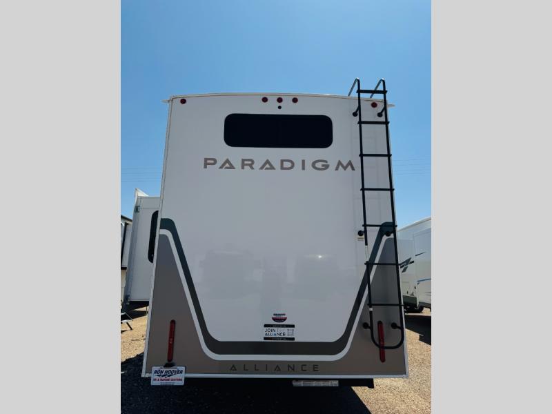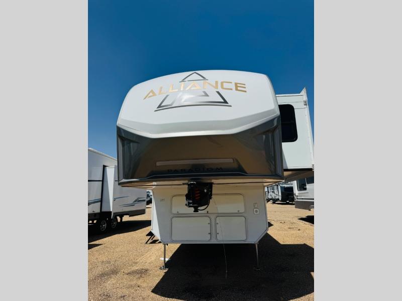 The Paradigm fifth wheels by Alliance RV are functional, high-quality, and luxurious for an unforgettable camping experience. There are three A/C units and a 40K BTU furnace to keep you comfortable year around, and you'll appreciate additional convenient amenities, like the all-in-one enclosed/heated utility center and the color coded and numbered wiring. A Helux Series coil spring pin box comes standard for hassle-free towing, along with Super-G 4,400 lb. rated tires and Dexter 7,000 lb. axles. You'll love the kitchen with its LG solid surface countertops and Lusso range, plus there is LED motion lighting in the pantry and a Maxx fan with a rain sensor to keep everything fresh when making dinner. Each model also includes an HD Smart TV in the living room and bedroom, plus a Winegard Air 360 antenna to keep you connected to the outside world. And of course there are a variety of options you can choose from to further customize your fifth wheel; dual pane windows, Super Solar Plus, slide out awning toppers, and generator prep or a generator to name a few!