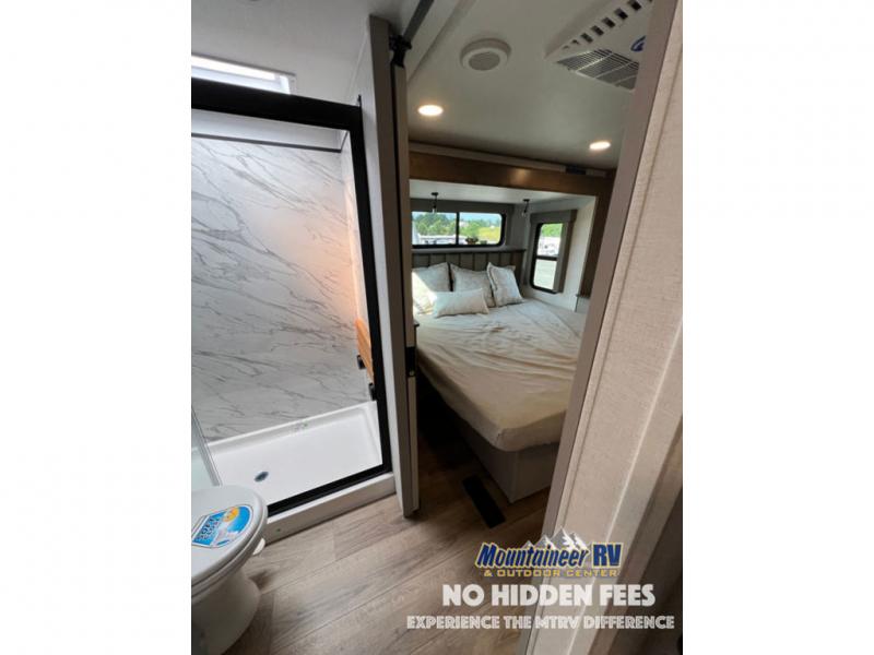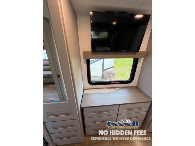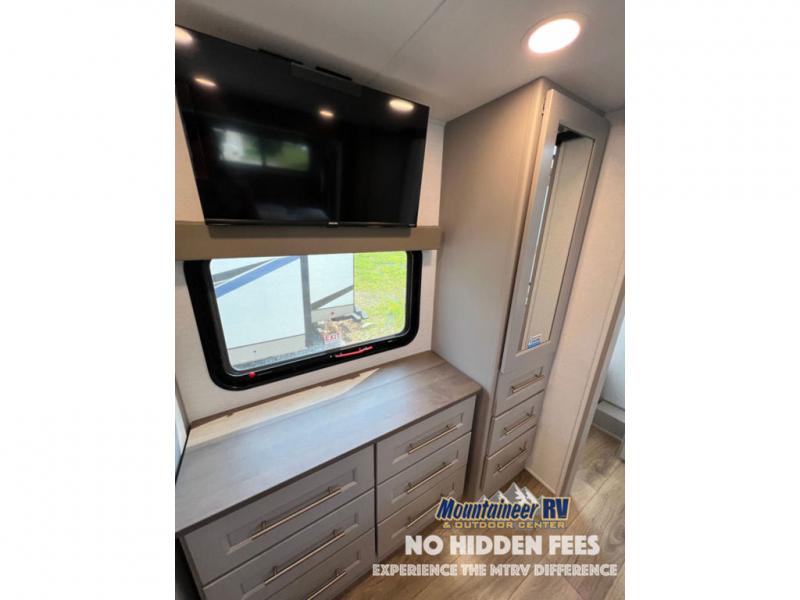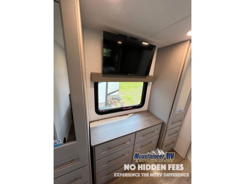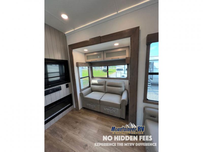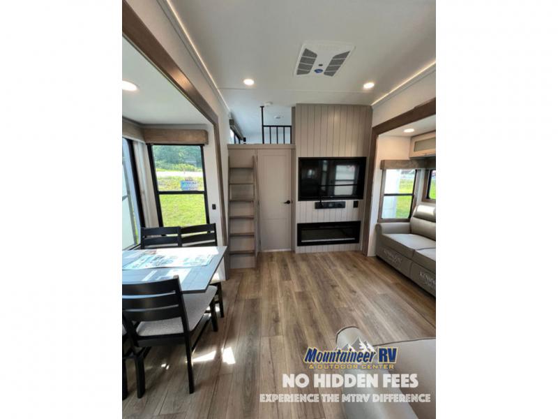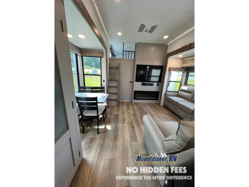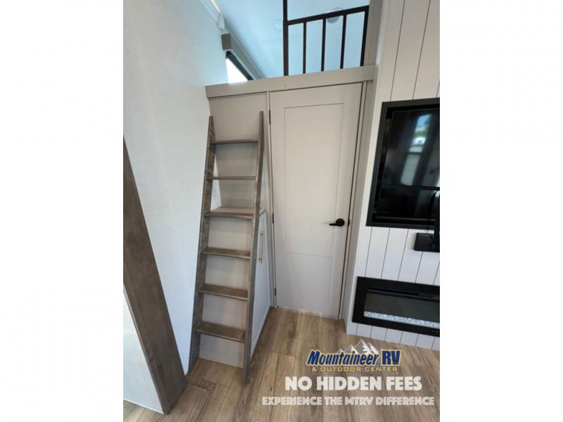 A spacious unit with sleeping for eight with plenty of choices to suit everyone! There is a front private bedroom with a king size bed that offers a large full front closet that has also been prepped for a washer and dryer if you choose that option. The front bath features a 40" x 30" shower and dual entry. Head down to the kitchen and living space at the bottom of the stairs to find a curbside slide that houses the 19 cu. ft. residential refrigerator, a pantry, and a swivel table and desk. As you continue on toward the rear of this coach, you will find a spacious living area along the roadside with a 50" Smart TV and a fireplace, a sofa sleeper slide, and a dual reclining loveseat. This makes a great gathering place for television watching, game playing, and even added sleeping space if needed at night. The rear private bedroom with its own private bath features a queen bed, two closets, and a Smart TV as well. The multipurpose loft area above can be accessed just before this rear bedroom entry by a ladder, and it is perfect for extra storage, or it can be used for added sleeping that the kiddos are sure to love.