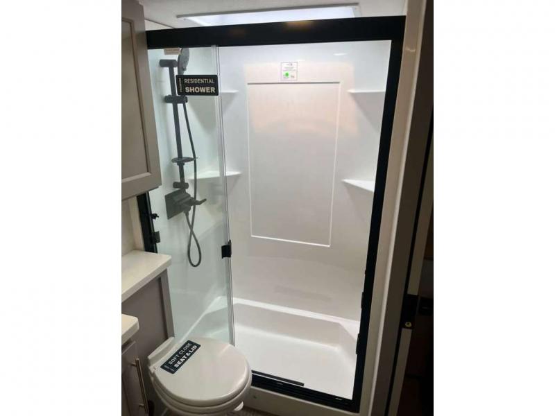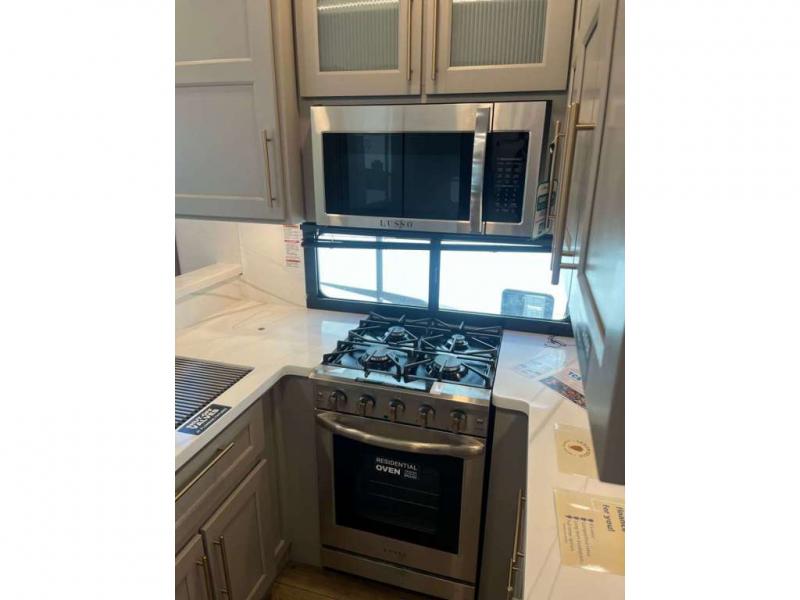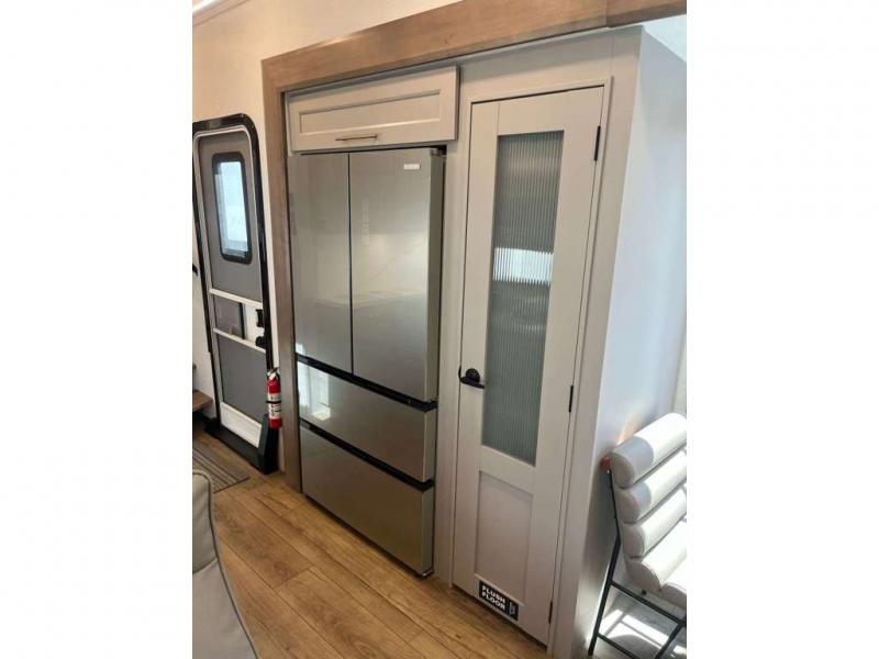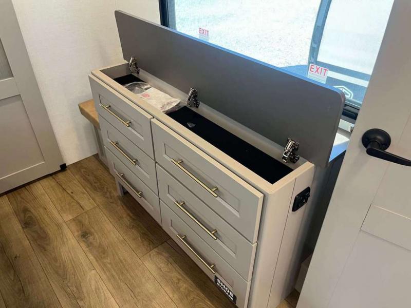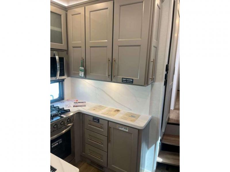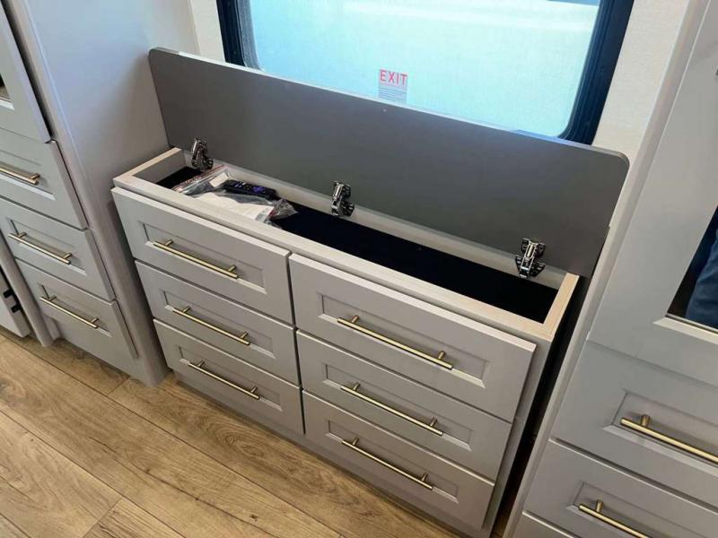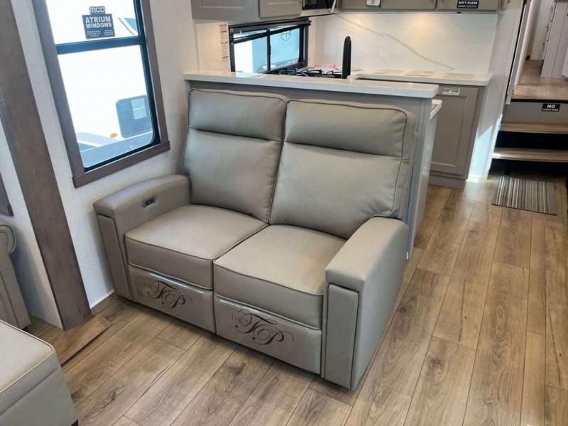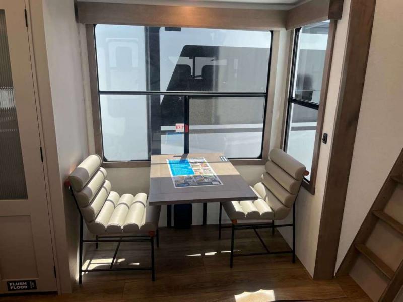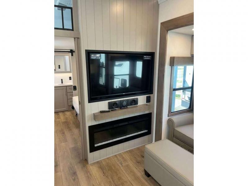 3 A/C's, 40K BTU Furnace, 4 Burner Freestanding Range w/ 12,000 BTU Burner and 3.73 cu. ft. Oven, 19 cu.ft. 12 Volt Residential Refrigerator, Fireplace w/ 5,100 BTU Heater, Walkable Roof w/ Seamless PVC Covering, Flush Floor Kitchen Slide, Large Residential Shower, Commercial Grade Vinyl Flooring (No Carpet), Soft Close Cabinet Doors w/ Magnetic Catch, Hidden Hinges, Soft Close Toilet, Light Dimming Switches, MCD Roller Shades Throughout, Day/Night Shades - Main Deck only, HD Smart TV in Living and Bedroom, Hardwood Fascia and Window Treatments, Residential LED Recessed Ceiling Lights, LED Back-Lit Crown Moulding in Living Area, Hardwood Cabinet Doors and Drawers, Gold Cabinetry Hardware, Centralized Docking Station, No In-Floor Heat Vents (Main Floor), Hardwood Floating Dinette Table w/ 4 Padded Chairs (2 folding), Tri-Fold Sofa, Love/Theatre Seat w/ Power Recliners, Serta Mattress, Painted Fiberglass Front Cap, Solid Surface Kitchen Countertops w/ Solid Surface Backsplash