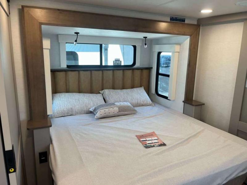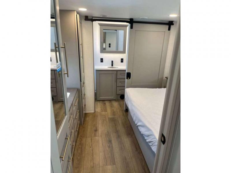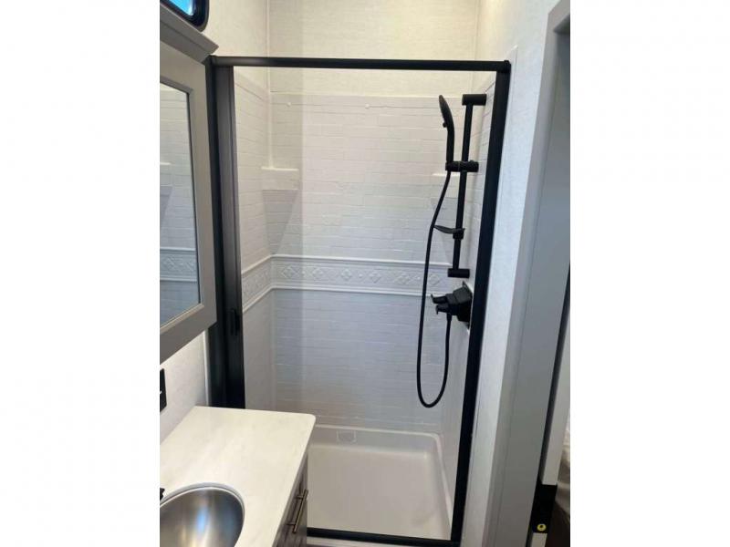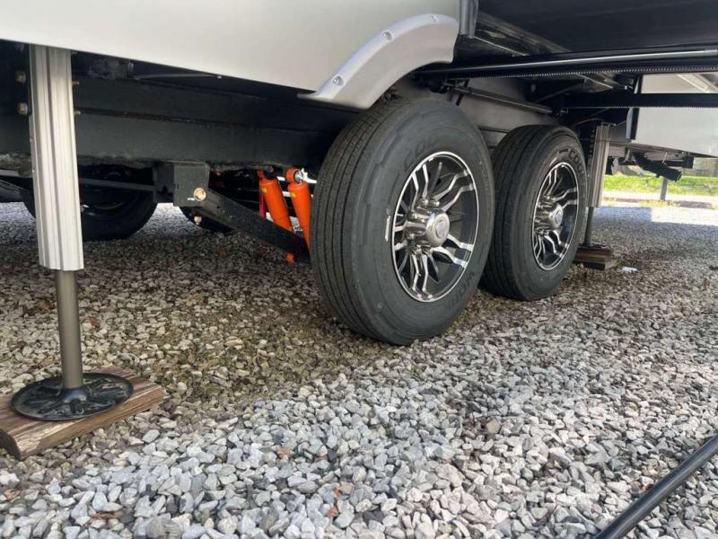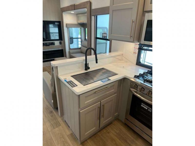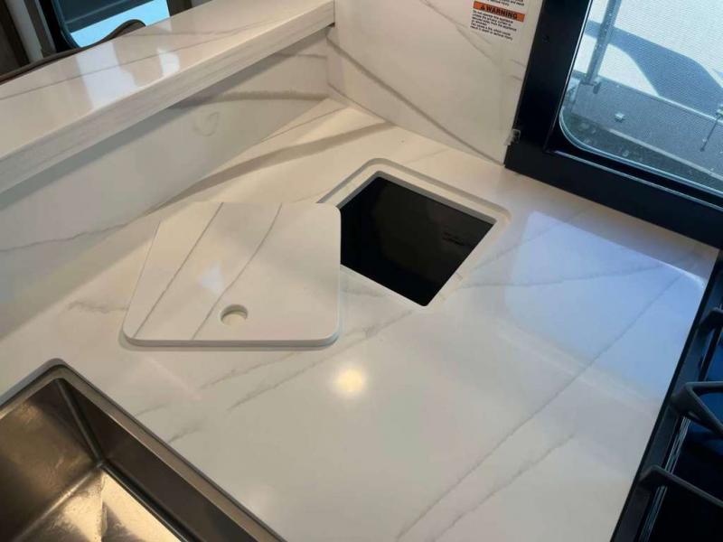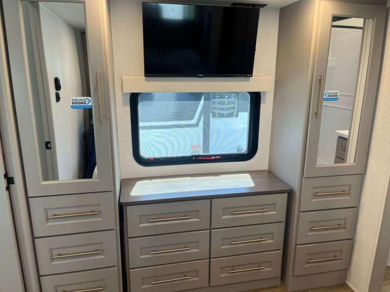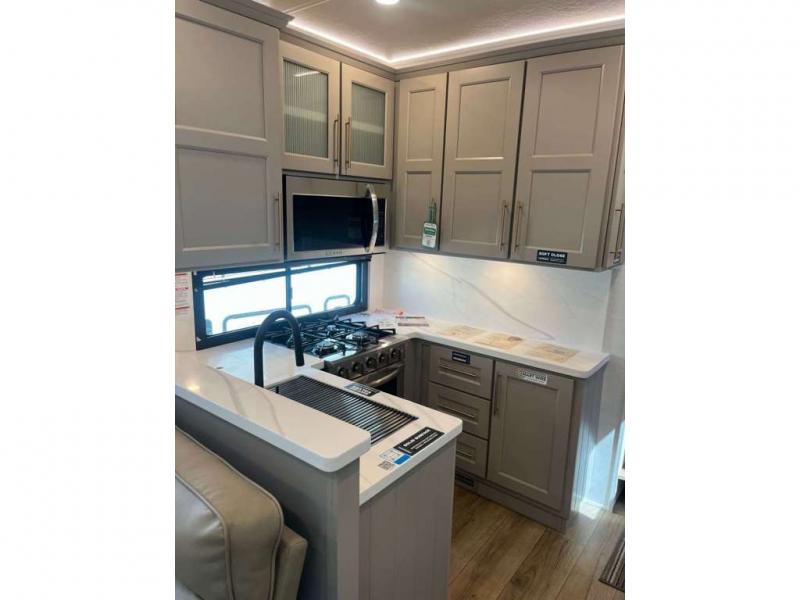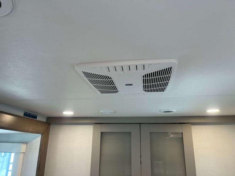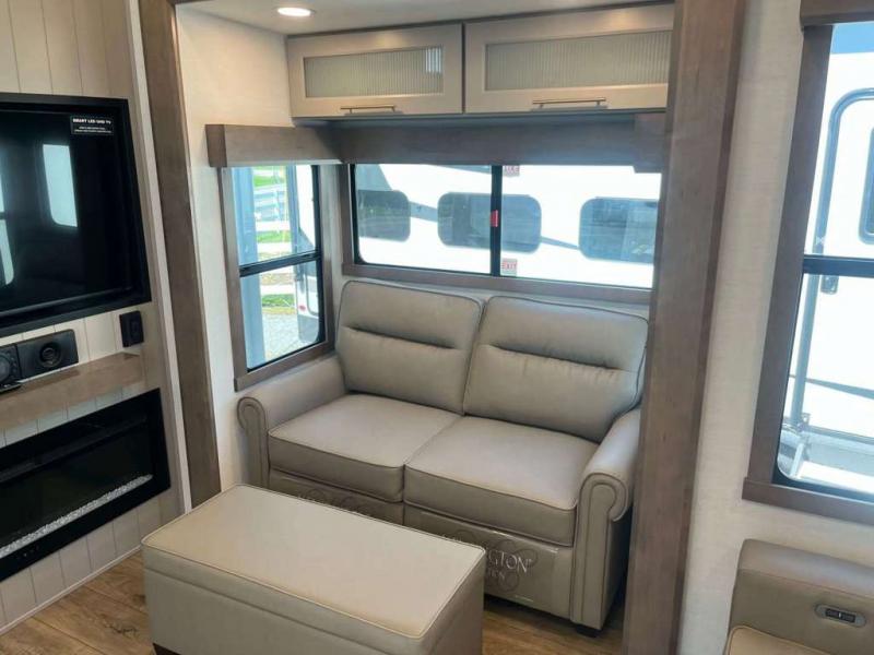 3 A/C's, 40K BTU Furnace, 4 Burner Freestanding Range w/ 12,000 BTU Burner and 3.73 cu. ft. Oven, 19 cu.ft. 12 Volt Residential Refrigerator, Fireplace w/ 5,100 BTU Heater, Walkable Roof w/ Seamless PVC Covering, Flush Floor Kitchen Slide, Large Residential Shower, Commercial Grade Vinyl Flooring (No Carpet), Soft Close Cabinet Doors w/ Magnetic Catch, Hidden Hinges, Soft Close Toilet, Light Dimming Switches, MCD Roller Shades Throughout, Day/Night Shades - Main Deck only, HD Smart TV in Living and Bedroom, Hardwood Fascia and Window Treatments, Residential LED Recessed Ceiling Lights, LED Back-Lit Crown Moulding in Living Area, Hardwood Cabinet Doors and Drawers, Gold Cabinetry Hardware, Centralized Docking Station, No In-Floor Heat Vents (Main Floor), Hardwood Floating Dinette Table w/ 4 Padded Chairs (2 folding), Tri-Fold Sofa, Love/Theatre Seat w/ Power Recliners, Serta Mattress, Painted Fiberglass Front Cap, Solid Surface Kitchen Countertops w/ Solid Surface Backsplash