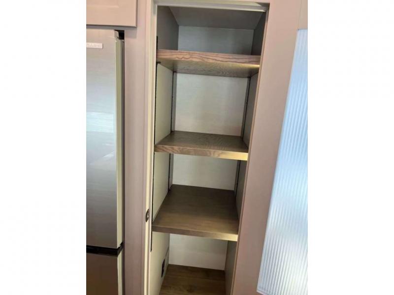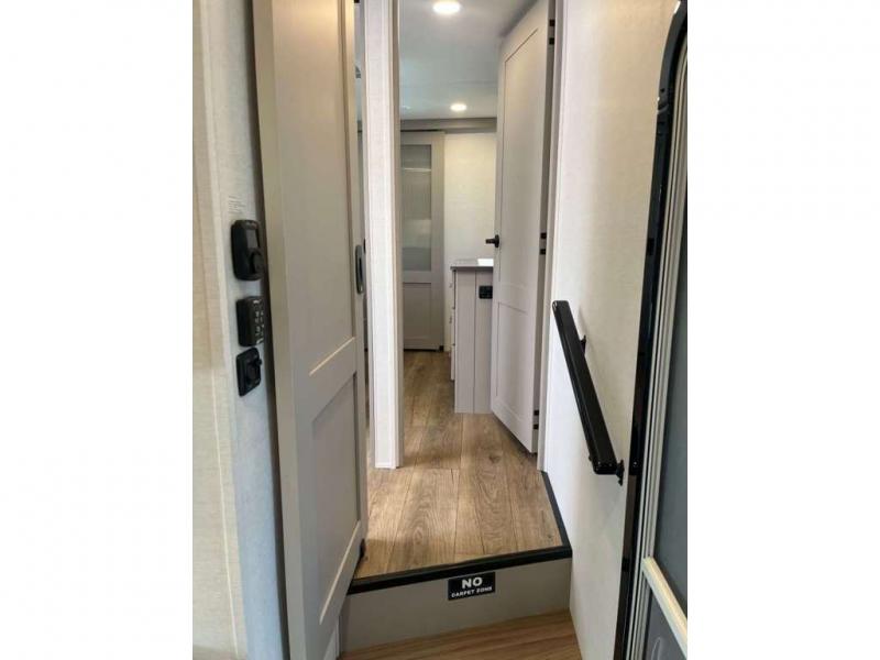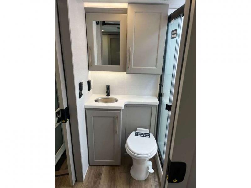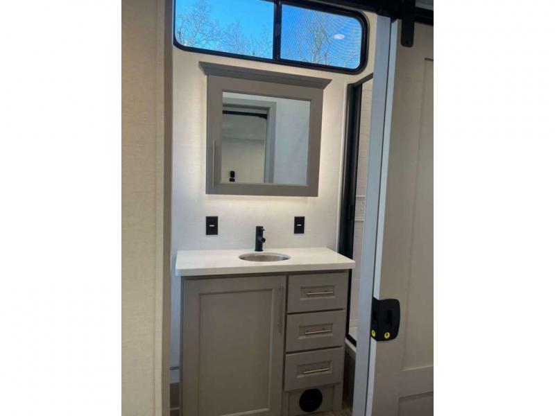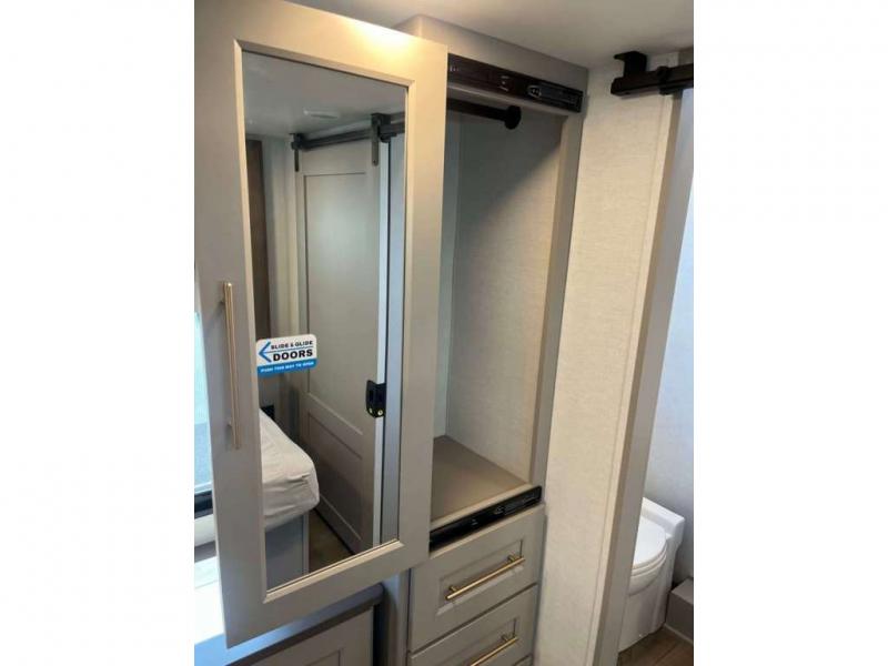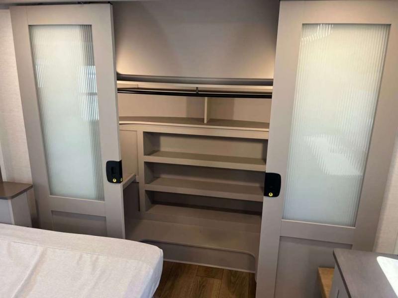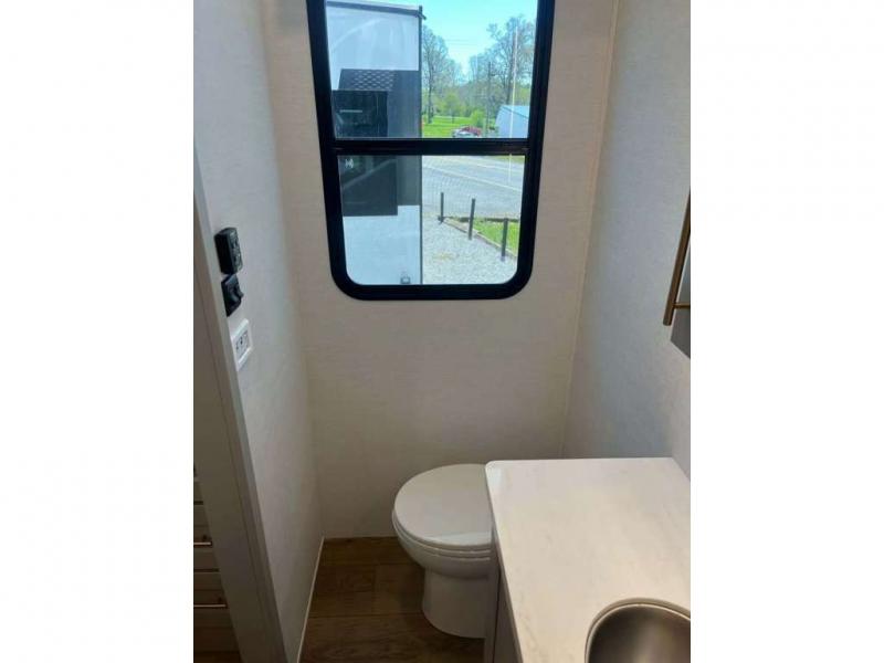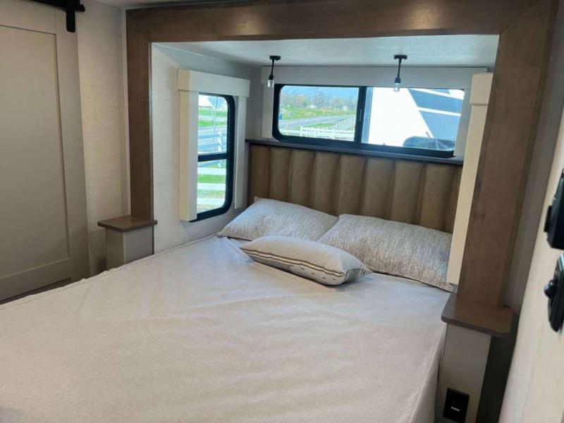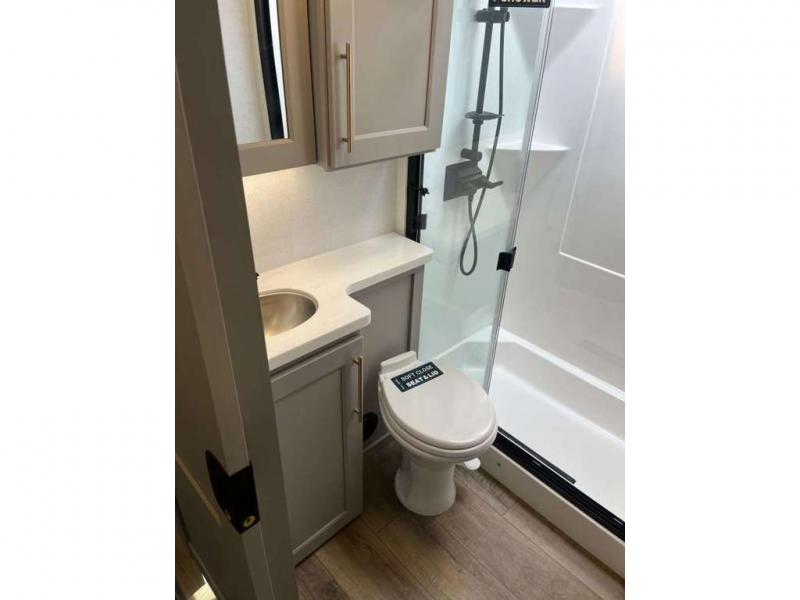 3 A/C's, 40K BTU Furnace, 4 Burner Freestanding Range w/ 12,000 BTU Burner and 3.73 cu. ft. Oven, 19 cu.ft. 12 Volt Residential Refrigerator, Fireplace w/ 5,100 BTU Heater, Walkable Roof w/ Seamless PVC Covering, Flush Floor Kitchen Slide, Large Residential Shower, Commercial Grade Vinyl Flooring (No Carpet), Soft Close Cabinet Doors w/ Magnetic Catch, Hidden Hinges, Soft Close Toilet, Light Dimming Switches, MCD Roller Shades Throughout, Day/Night Shades - Main Deck only, HD Smart TV in Living and Bedroom, Hardwood Fascia and Window Treatments, Residential LED Recessed Ceiling Lights, LED Back-Lit Crown Moulding in Living Area, Hardwood Cabinet Doors and Drawers, Gold Cabinetry Hardware, Centralized Docking Station, No In-Floor Heat Vents (Main Floor), Hardwood Floating Dinette Table w/ 4 Padded Chairs (2 folding), Tri-Fold Sofa, Love/Theatre Seat w/ Power Recliners, Serta Mattress, Painted Fiberglass Front Cap, Solid Surface Kitchen Countertops w/ Solid Surface Backsplash