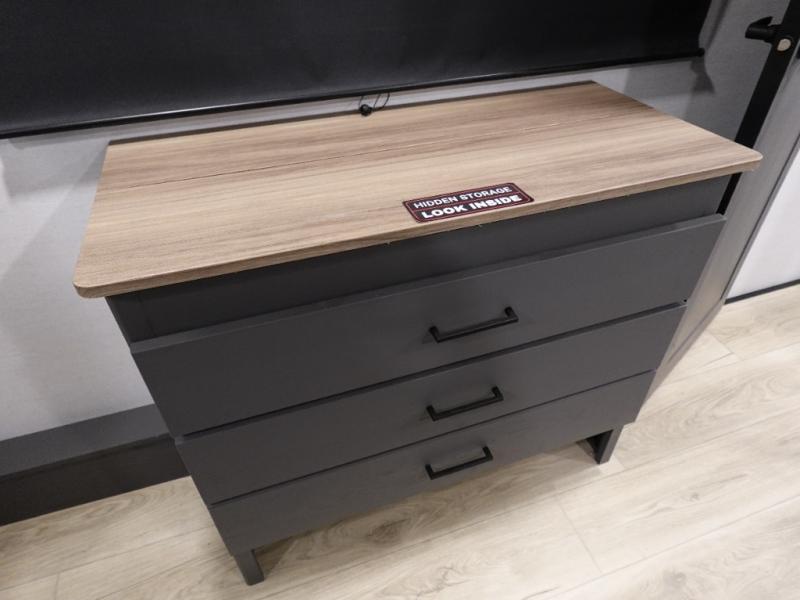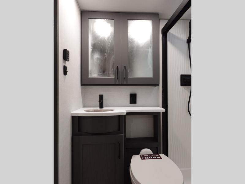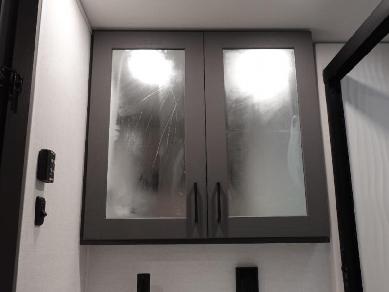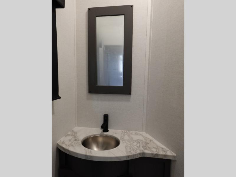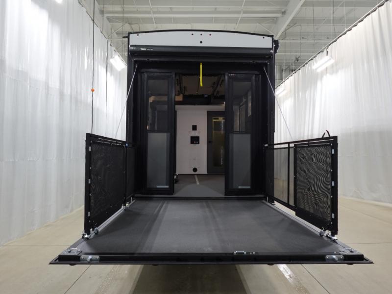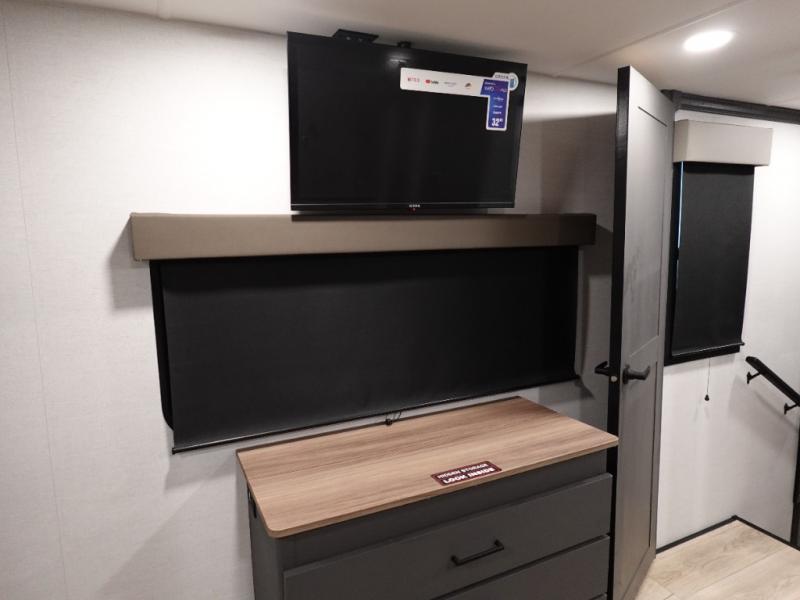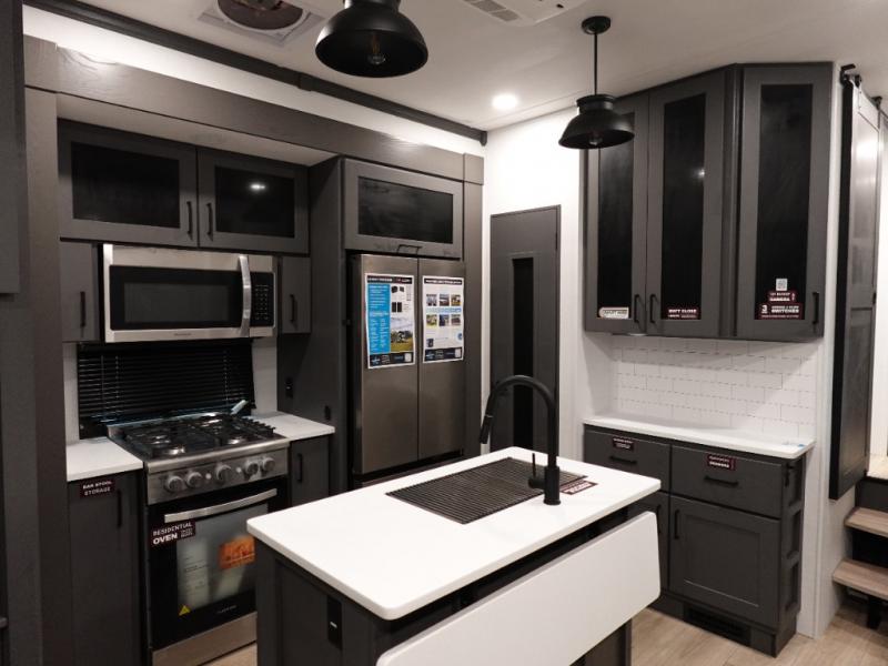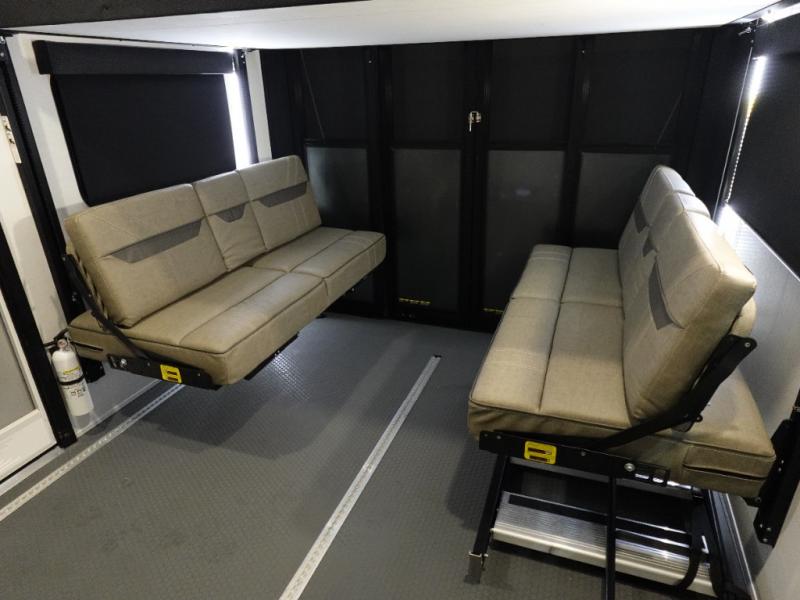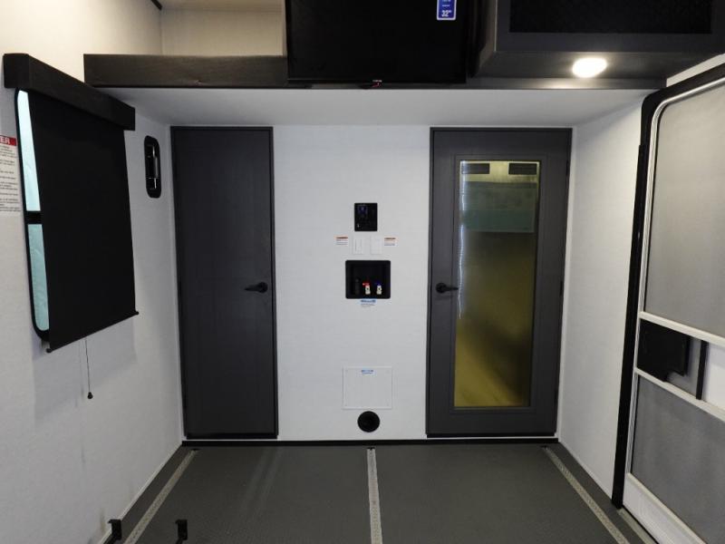 The whole family will have a fun time camping in this toy hauler! You can easily load up your toys into the 11' garage area with the 8' weather resistant ramp door and keep them filled with the dual 30 gallon fuel tanks. Once you unload your toys from the garage area, you can set up the opposing HappiJac sofas with a queen mattress above them, the loft that opens to the living room, and the half bathroom. The kitchen has everything you need to prepare your best meals including two hutches, three pantries, and a kitchen island with two bar stools to enjoy your morning coffee and eggs. The dual entry bathroom has a 48" x 30" shower and leads directly into the front private bedroom. Inside the bedroom is a king bed slide for more floor space, a flip top dresser, and a front wardrobe with washer and dryer prep!
