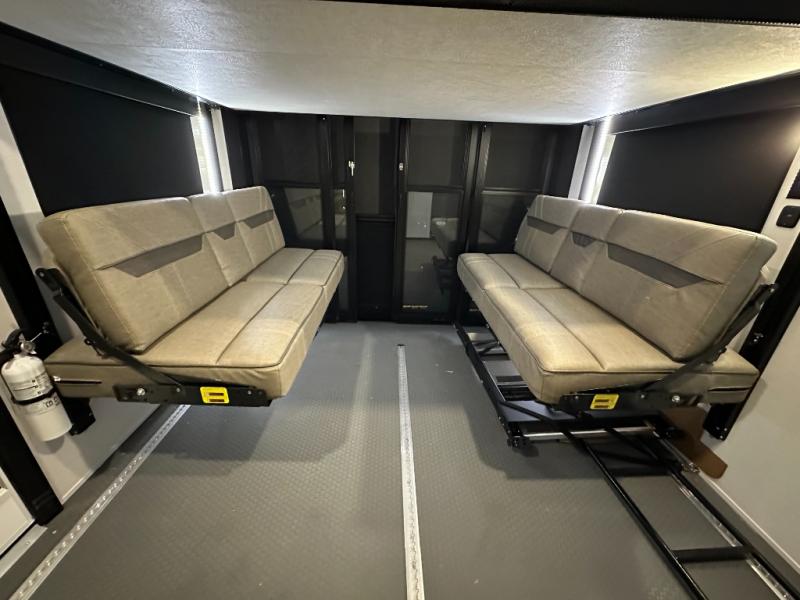 • Opposing HappiJac sofas + a queen mattress above (which can convert for sleeping in the garage) plus a loft.
