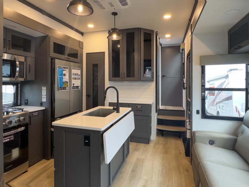 The whole family will have a fun time camping in this toy hauler! You can easily load up your toys into the 11' garage area with the 8' weather resistant ramp door and keep them filled with the dual 30 gallon fuel tanks. Once you unload your toys from the garage area, you can set up the opposing HappiJac sofas with a queen mattress above them, the loft that opens to the living room, and the half bathroom. The kitchen has everything you need to prepare your best meals including two hutches, three pantries, and a kitchen island with two bar stools to enjoy your morning coffee and eggs. The dual entry bathroom has a 48" x 30" shower and leads directly into the front private bedroom. Inside the bedroom is a king bed slide for more floor space, a flip top dresser, and a front wardrobe with washer and dryer prep!