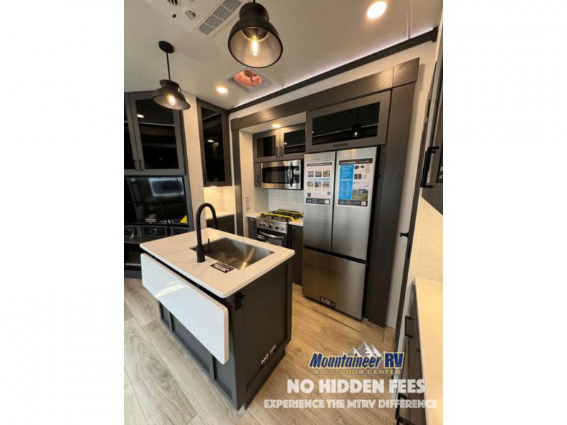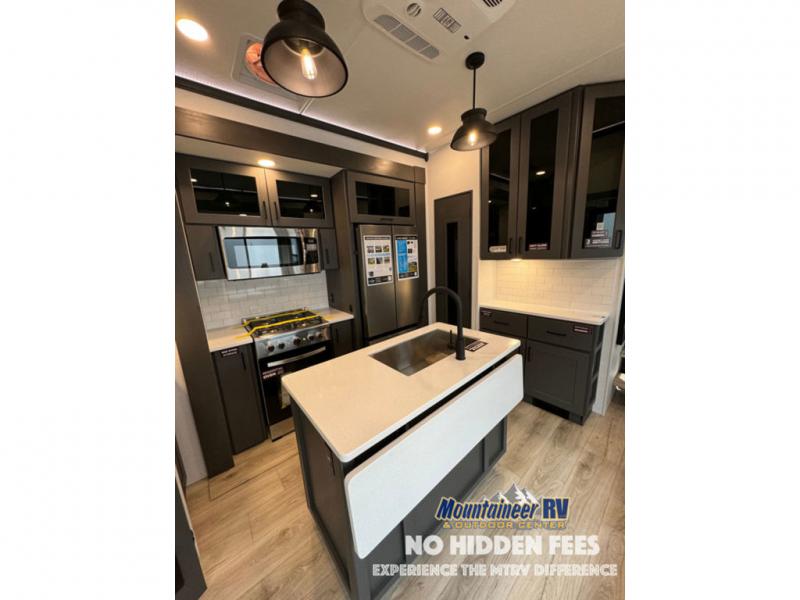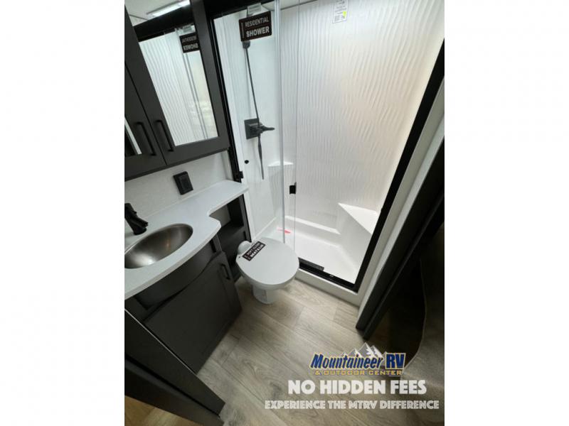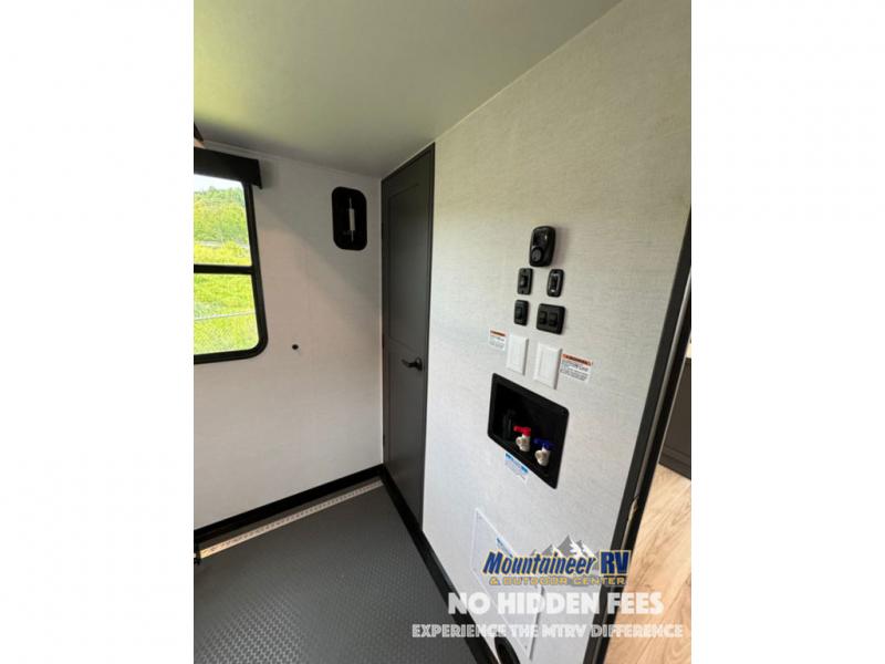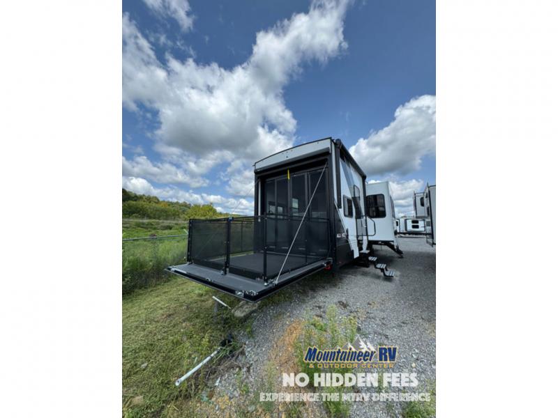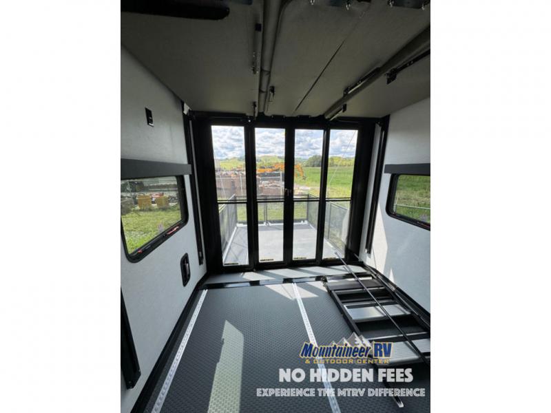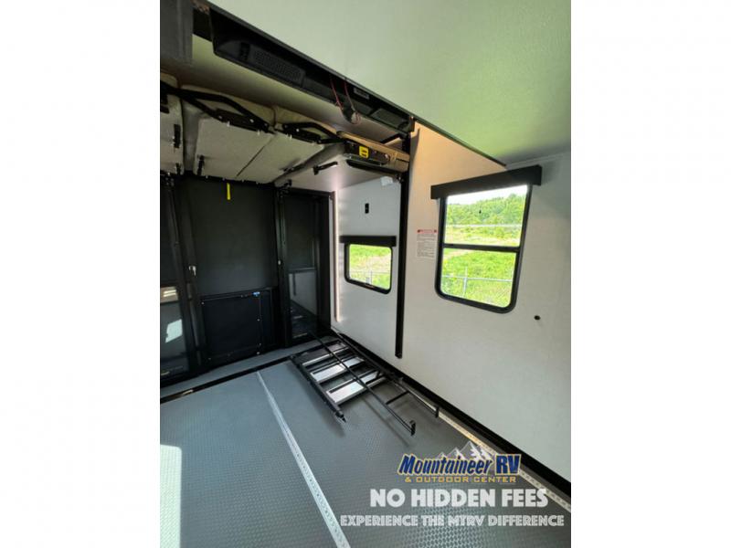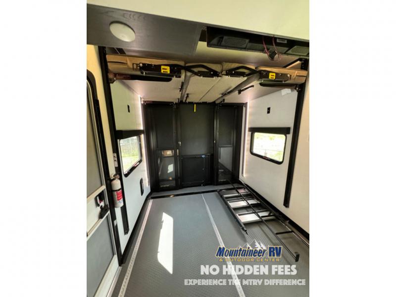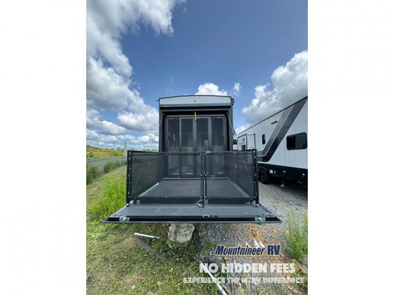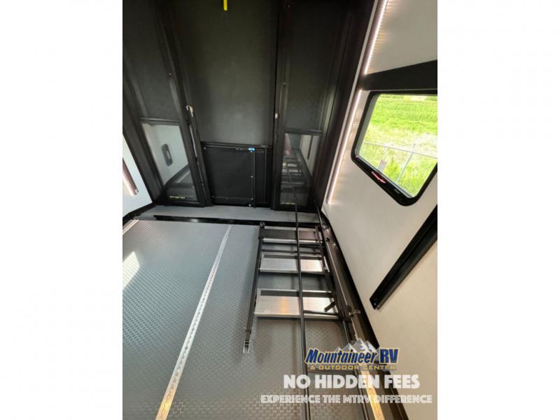 The whole family will have a fun time camping in this toy hauler! You can easily load up your toys into the 11' garage area with the 8' weather resistant ramp door and keep them filled with the dual 30 gallon fuel tanks. Once you unload your toys from the garage area, you can set up the opposing HappiJac sofas with a queen mattress above them, the loft that opens to the living room, and the half bathroom. The kitchen has everything you need to prepare your best meals including two hutches, three pantries, and a kitchen island with two bar stools to enjoy your morning coffee and eggs. The dual entry bathroom has a 48" x 30" shower and leads directly into the front private bedroom. Inside the bedroom is a king bed slide for more walking around space, a flip top dresser, and a front wardrobe that has an area prepped to add the optional washer and dryer.