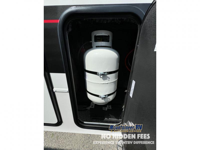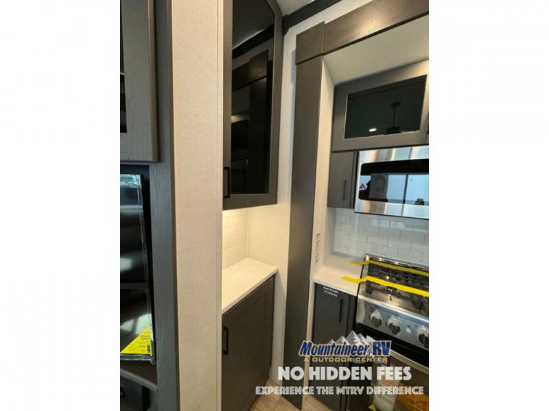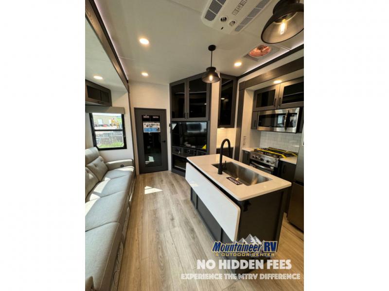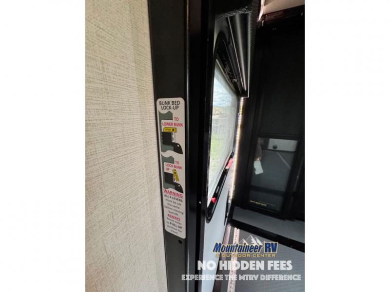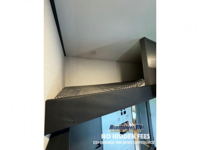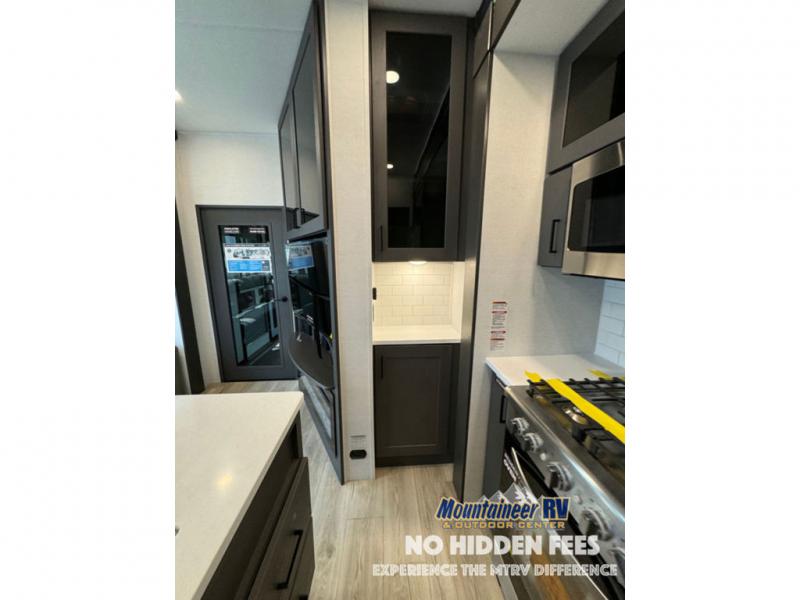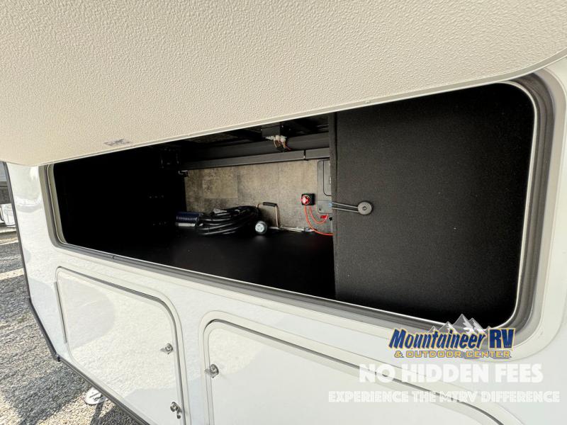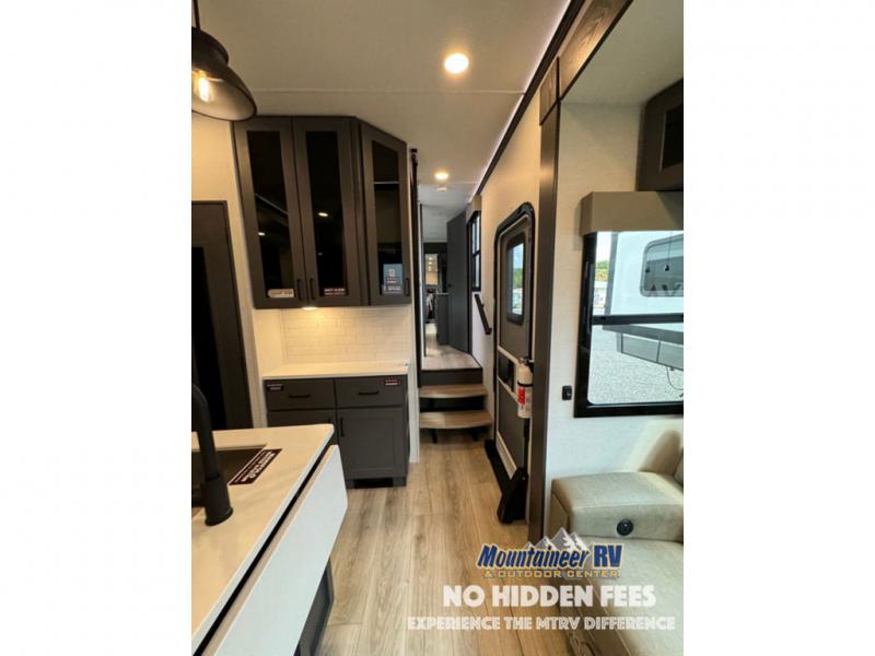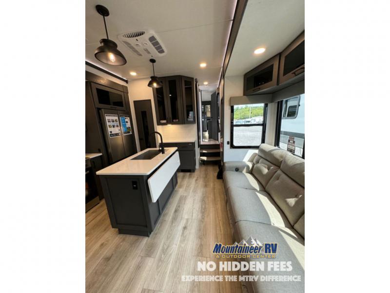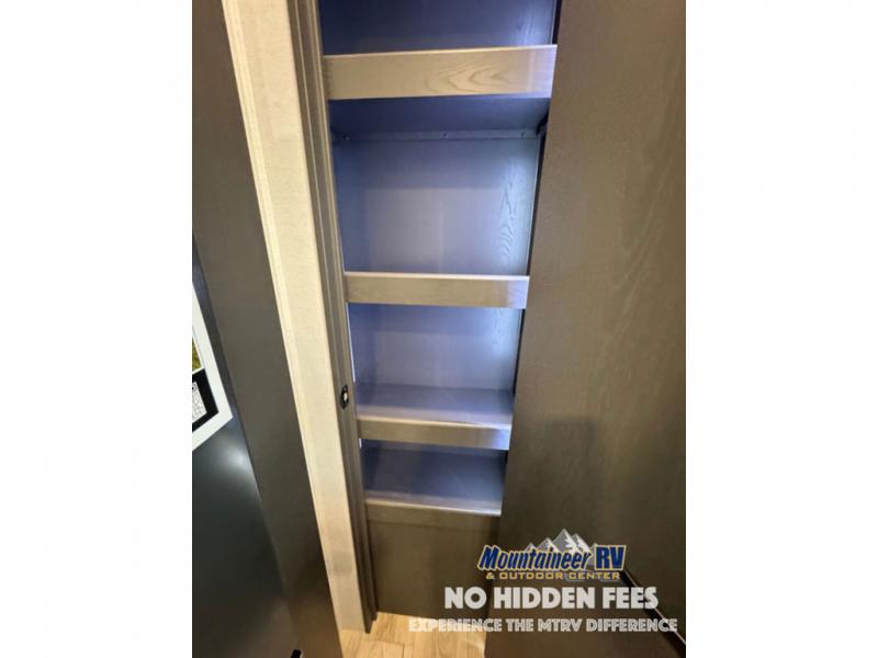 The whole family will have a fun time camping in this toy hauler! You can easily load up your toys into the 11' garage area with the 8' weather resistant ramp door and keep them filled with the dual 30 gallon fuel tanks. Once you unload your toys from the garage area, you can set up the opposing HappiJac sofas with a queen mattress above them, the loft that opens to the living room, and the half bathroom. The kitchen has everything you need to prepare your best meals including two hutches, three pantries, and a kitchen island with two bar stools to enjoy your morning coffee and eggs. The dual entry bathroom has a 48" x 30" shower and leads directly into the front private bedroom. Inside the bedroom is a king bed slide for more walking around space, a flip top dresser, and a front wardrobe that has an area prepped to add the optional washer and dryer.