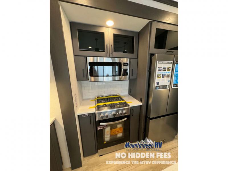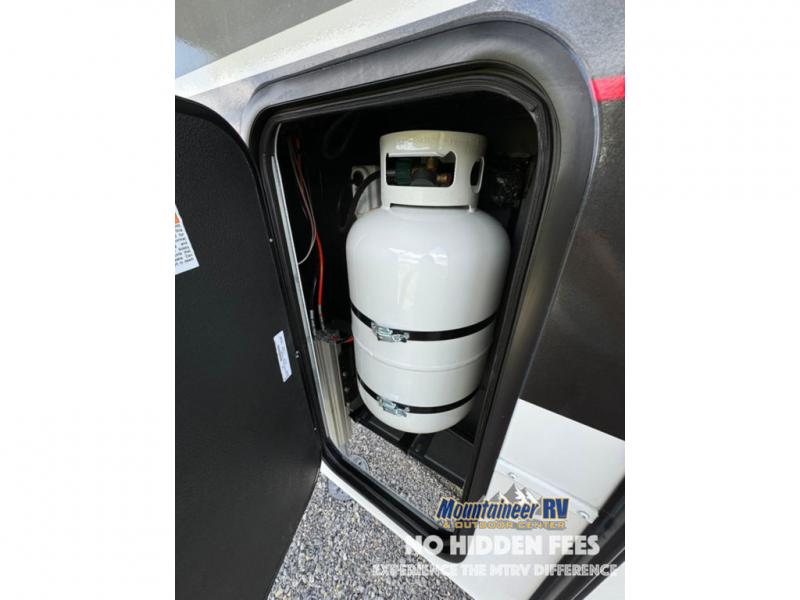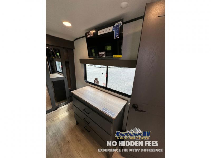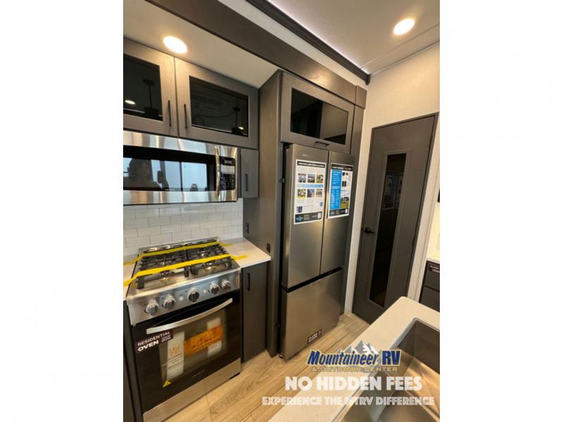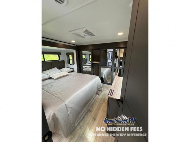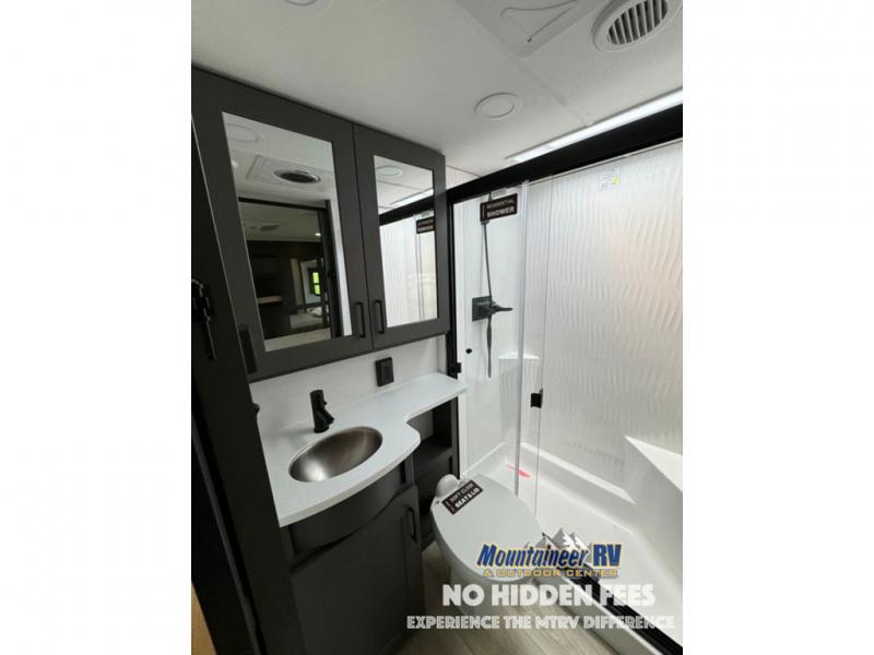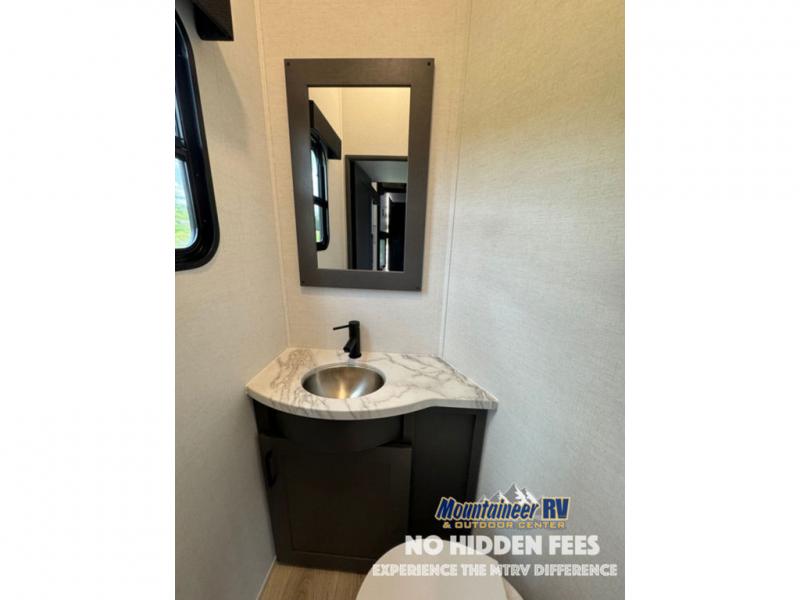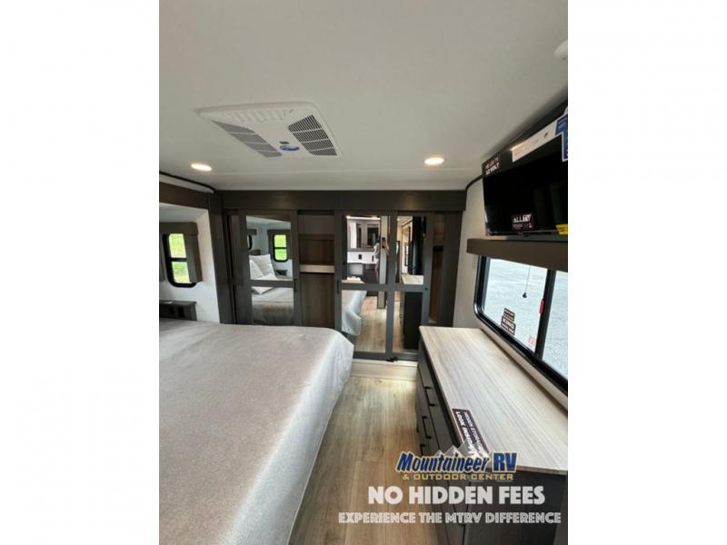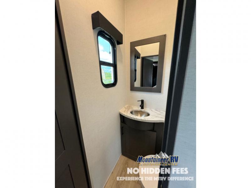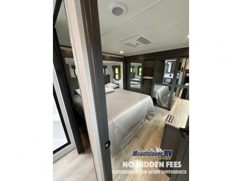 The whole family will have a fun time camping in this toy hauler! You can easily load up your toys into the 11' garage area with the 8' weather resistant ramp door and keep them filled with the dual 30 gallon fuel tanks. Once you unload your toys from the garage area, you can set up the opposing HappiJac sofas with a queen mattress above them, the loft that opens to the living room, and the half bathroom. The kitchen has everything you need to prepare your best meals including two hutches, three pantries, and a kitchen island with two bar stools to enjoy your morning coffee and eggs. The dual entry bathroom has a 48" x 30" shower and leads directly into the front private bedroom. Inside the bedroom is a king bed slide for more walking around space, a flip top dresser, and a front wardrobe that has an area prepped to add the optional washer and dryer.