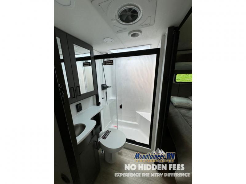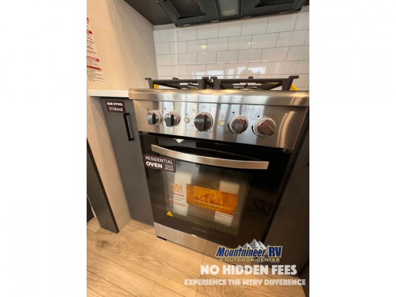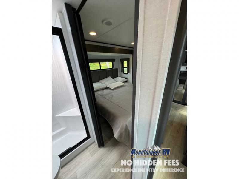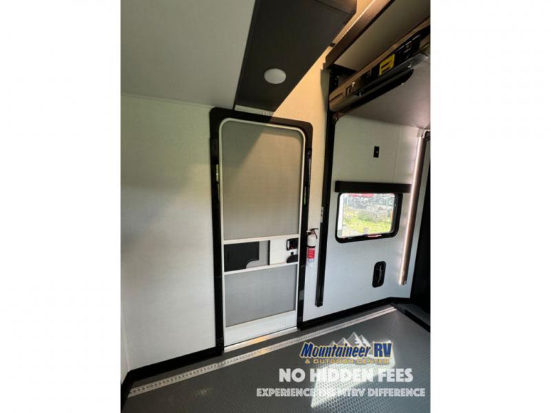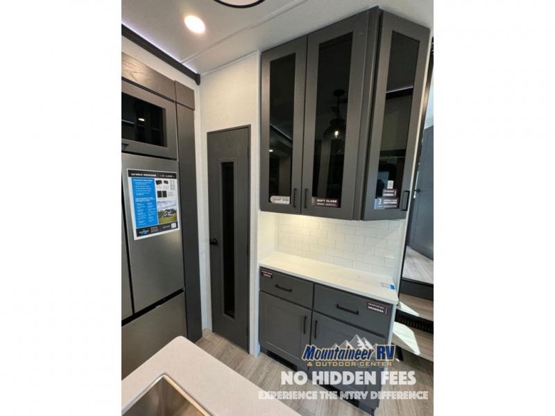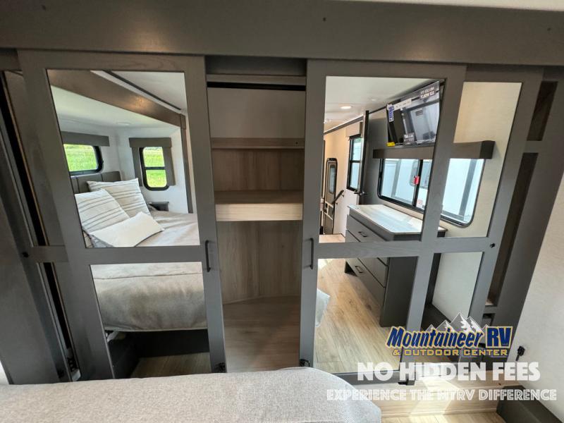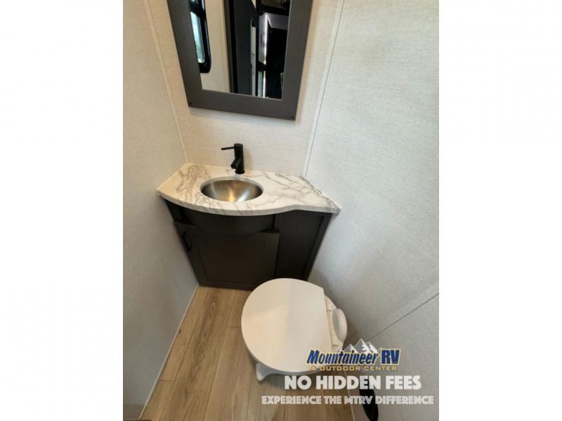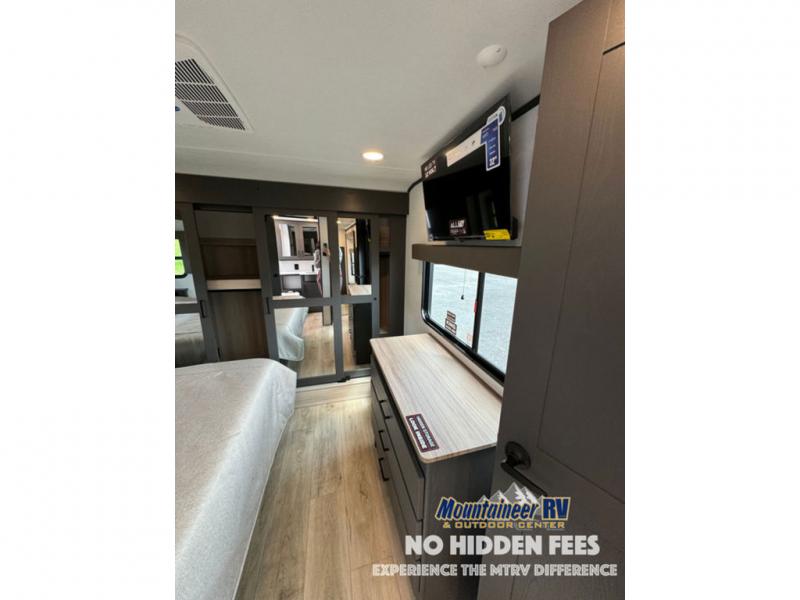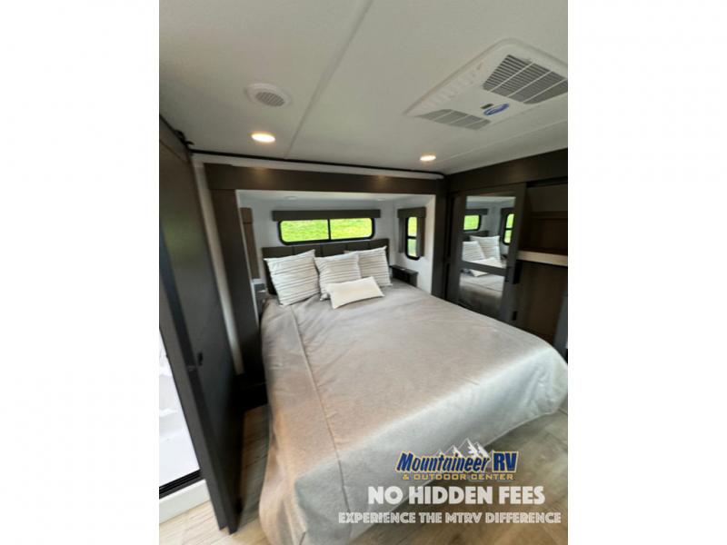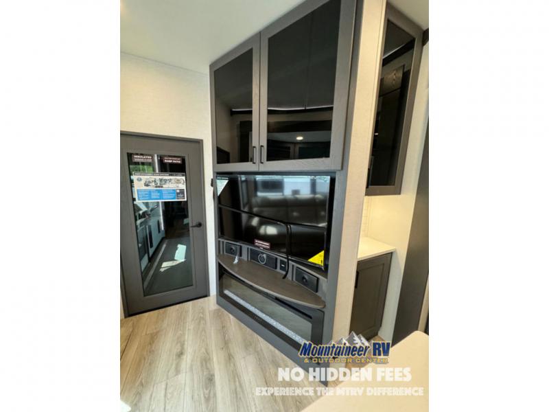 The whole family will have a fun time camping in this toy hauler! You can easily load up your toys into the 11' garage area with the 8' weather resistant ramp door and keep them filled with the dual 30 gallon fuel tanks. Once you unload your toys from the garage area, you can set up the opposing HappiJac sofas with a queen mattress above them, the loft that opens to the living room, and the half bathroom. The kitchen has everything you need to prepare your best meals including two hutches, three pantries, and a kitchen island with two bar stools to enjoy your morning coffee and eggs. The dual entry bathroom has a 48" x 30" shower and leads directly into the front private bedroom. Inside the bedroom is a king bed slide for more walking around space, a flip top dresser, and a front wardrobe that has an area prepped to add the optional washer and dryer.