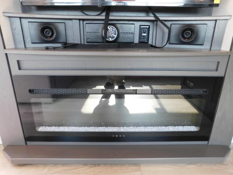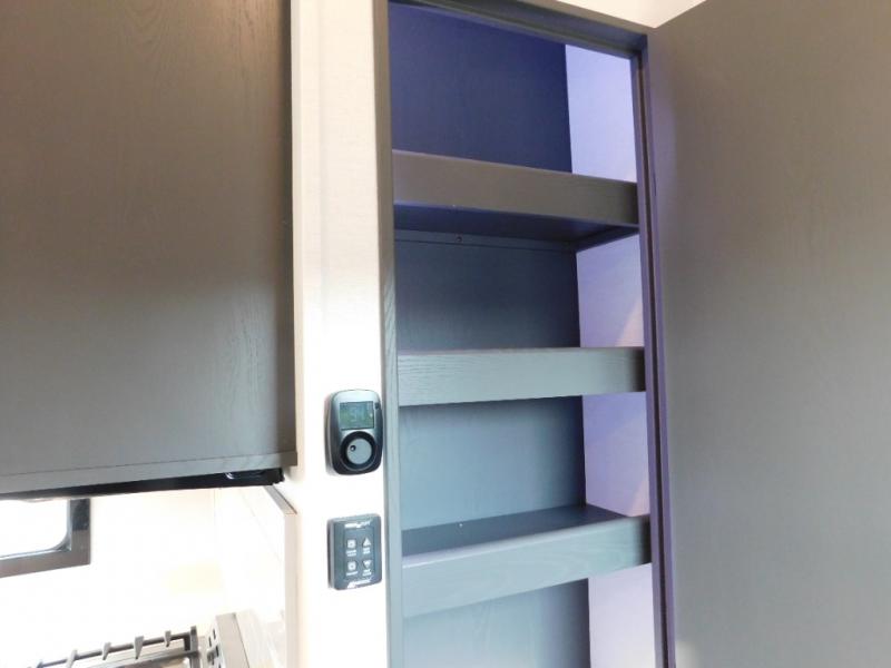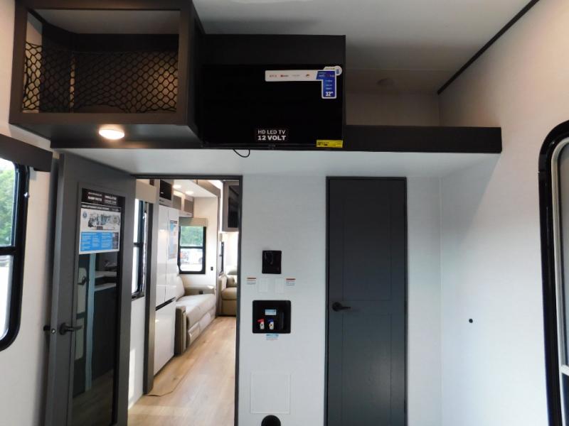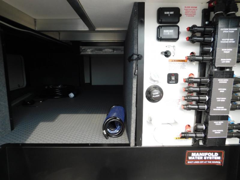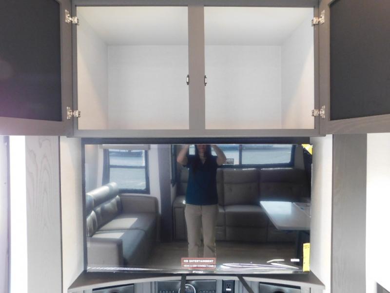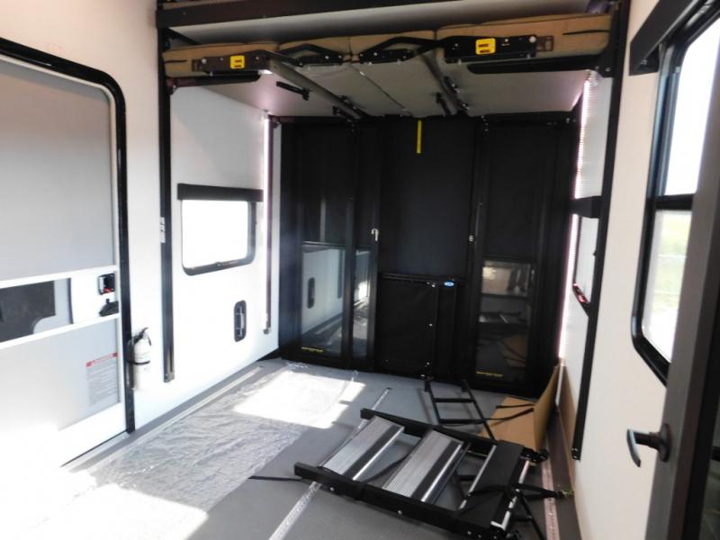 There is room for your off-road toys and the whole family in this toy hauler! The bath and a half makes life more convenient and the dual entry doors create a smooth flow of traffic in and out of the unit. Aside from 13' of garage space, an air compressor, and an entrance/exit door, there are also opposing HappiJac sofas with a queen bed above them, a loft that opens to the garage, and a half bathroom. The chef can prepare their best meals with the four burner cooktop while two others sit at the flip up counter with two bar stools. After a fun day on the trails, wash up in the full bathroom with the 48" x 30" shower, grab your pajamas from the front wardrobe or flip top dresser in the front private bedroom then relax on one of the two sofas by the fireplace and 50" HDTV!