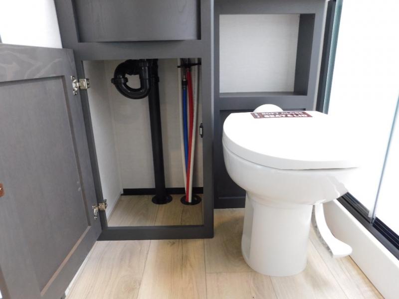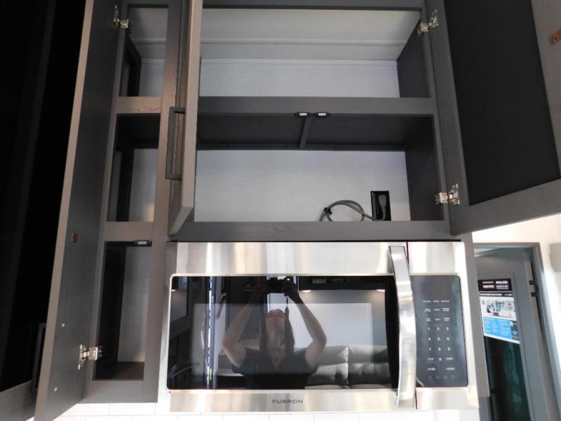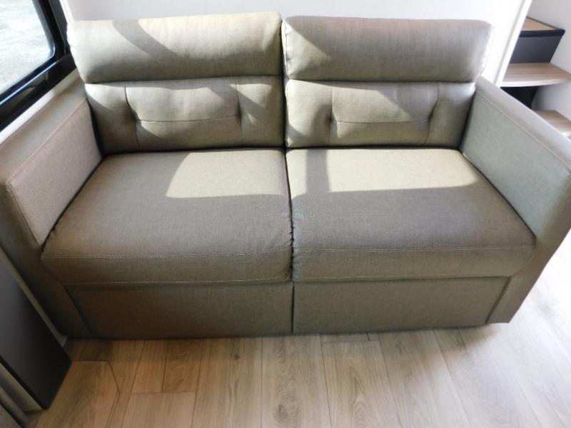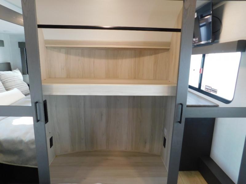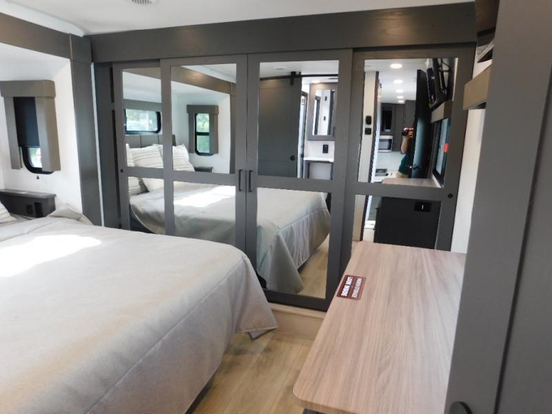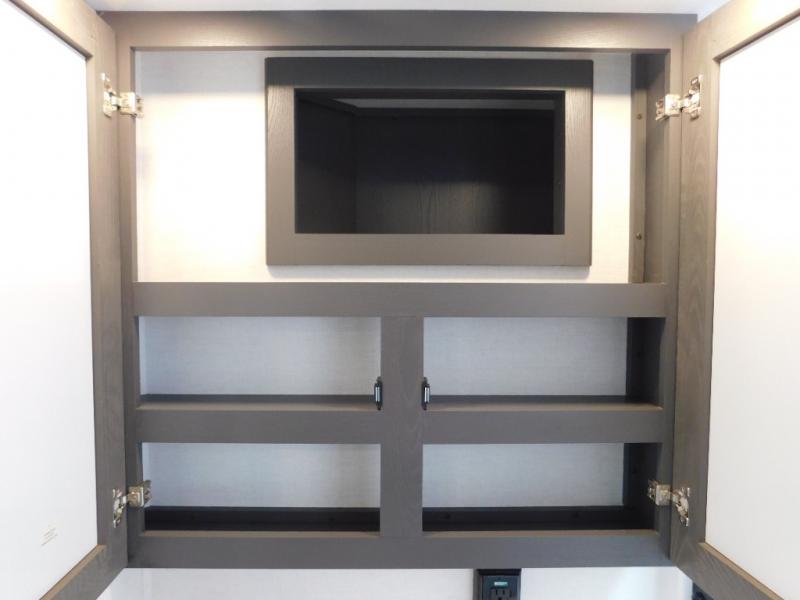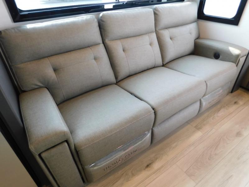 There is room for your off-road toys and the whole family in this toy hauler! The bath and a half makes life more convenient and the dual entry doors create a smooth flow of traffic in and out of the unit. Aside from 13' of garage space, an air compressor, and an entrance/exit door, there are also opposing HappiJac sofas with a queen bed above them, a loft that opens to the garage, and a half bathroom. The chef can prepare their best meals with the four burner cooktop while two others sit at the flip up counter with two bar stools. After a fun day on the trails, wash up in the full bathroom with the 48" x 30" shower, grab your pajamas from the front wardrobe or flip top dresser in the front private bedroom then relax on one of the two sofas by the fireplace and 50" HDTV!
