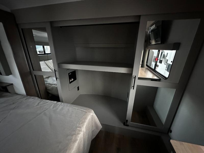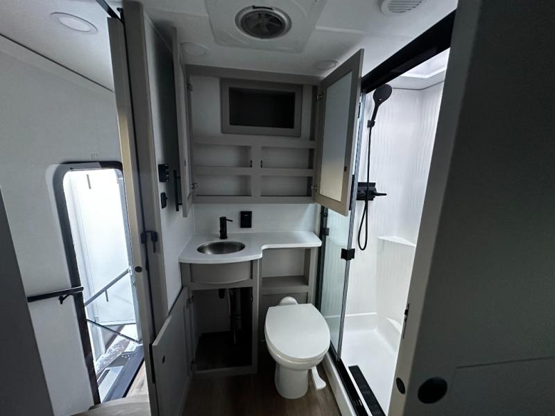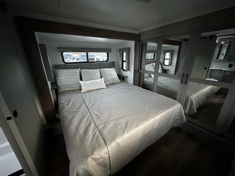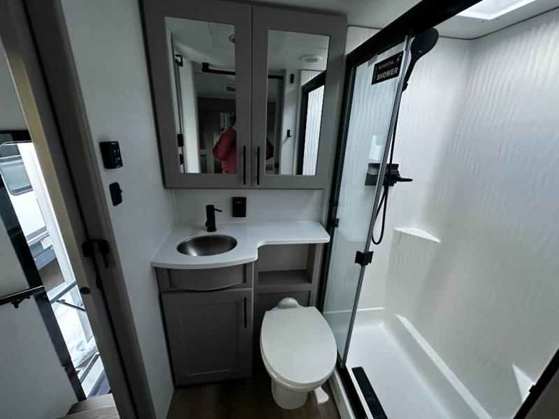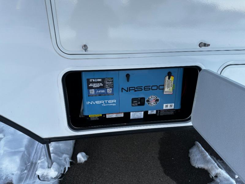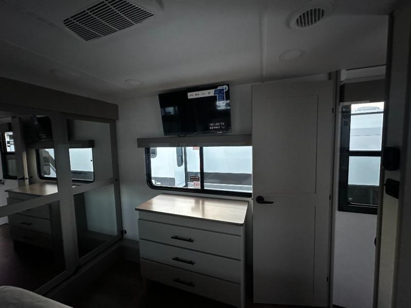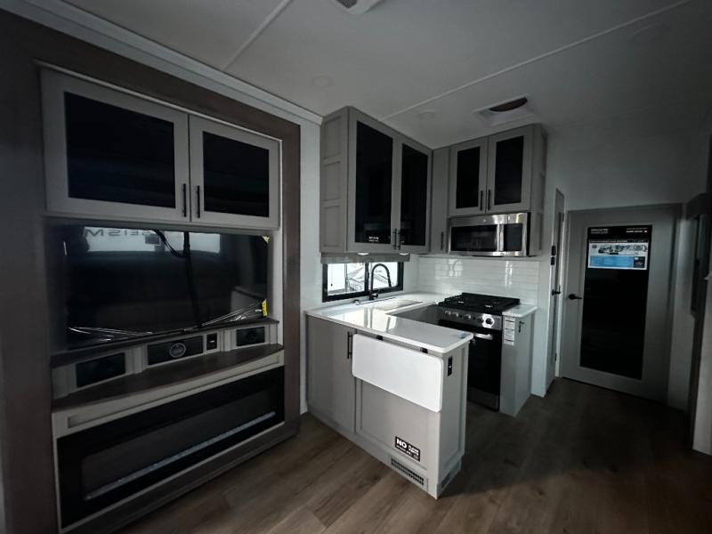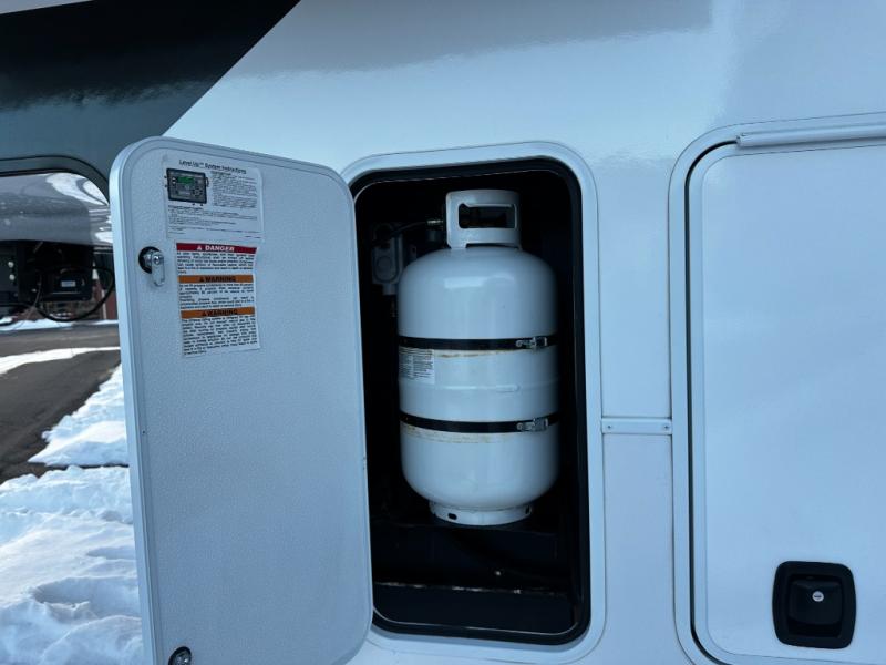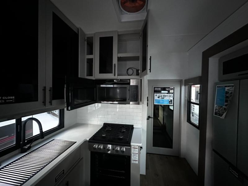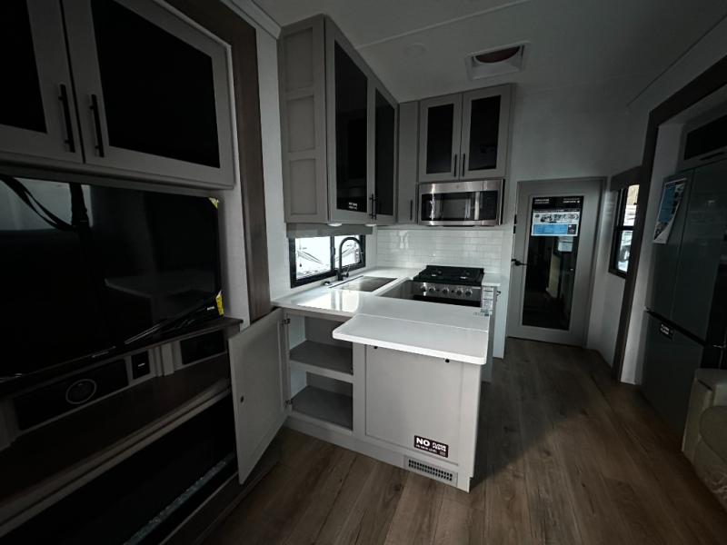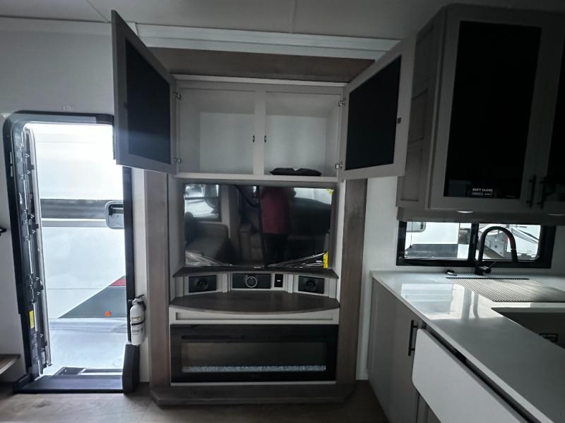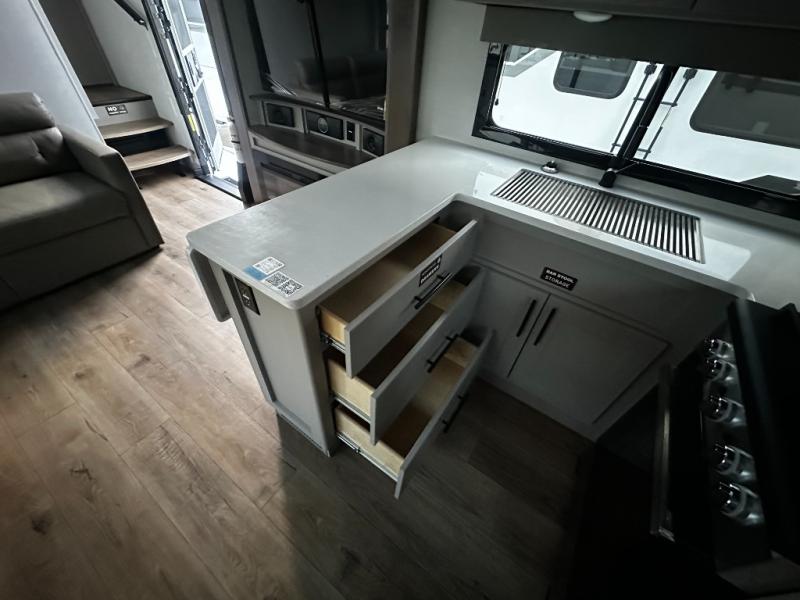 There is room for your off-road toys and the whole family in this toy hauler! The bath and a half makes life more convenient and the dual entry doors create a smooth flow of traffic in and out of the unit. Aside from 13' of garage space and an entrance/exit door, there are also opposing HappiJac sofas with a queen bed above them, a loft that opens to the garage, and a half bathroom. The chef can prepare their best meals with the four burner cooktop while two others sit at the flip up counter with two bar stools. After a fun day on the trails, wash up in the full bathroom with the 48" x 30" shower, grab your pajamas from the front wardrobe or flip top dresser in the front private bedroom then relax on one of the two sofas by the fireplace and 50" HDTV!