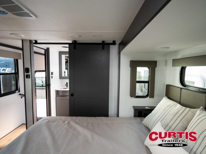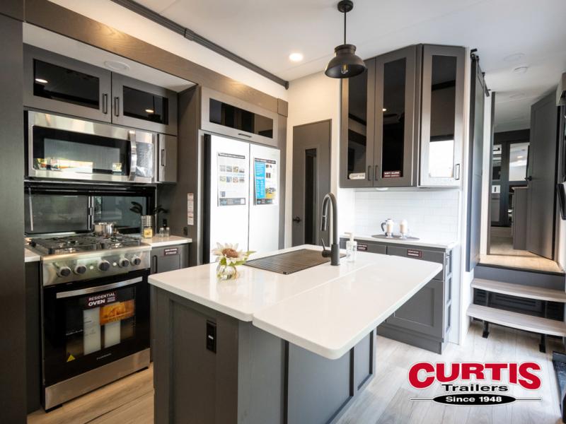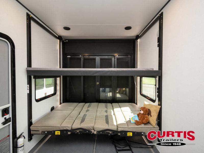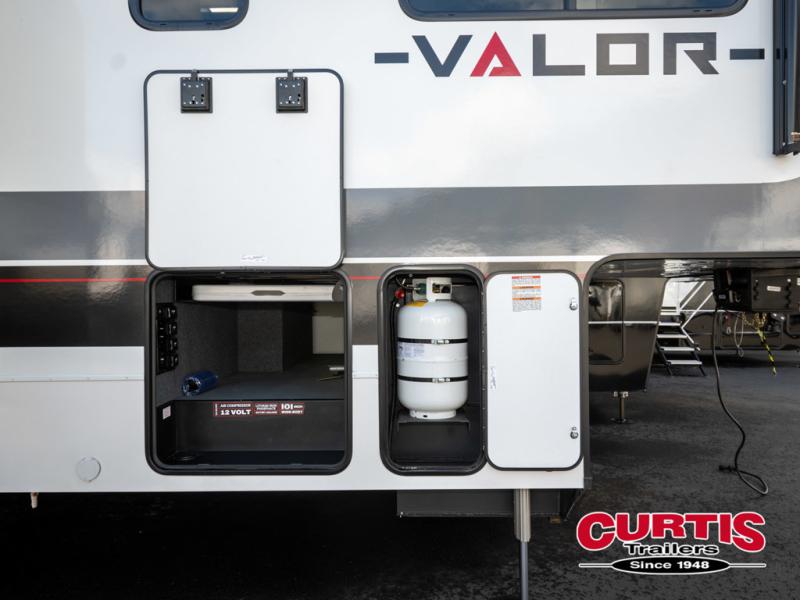 You can bring your toys with you wherever you go with any one of these Alliance RV Valor toy hauler fifth wheels! They are adventure-ready with a quality build from the walk on roof with seamless PVC roof covering to the commercial grade vinyl flooring and MorRyde CRE3000 suspension system. The Performance Running Gear package comes with a 101" wide-body benchmark chassis platform, 7,000 lb. Dexter axles, and a space enhancing drop frame storage compartment to pack in all your riding gear. You can even go off-gridding thanks to the Off the Grid Pack that has two 400 watt solar panels, generator prep, a 40 amp charge controller, and a 100 amp hour lithium iron phosphate battery. Some of the interior comforts you will enjoy are the hardwood cabinet doors and drawers, solid surface kitchen countertops, and commercial grade vinyl flooring with no carpet to make clean up a breeze. The Valor toy haulers are also the Masters of 12 Volt with USB charging station throughout, a stainless steel refrigerator, and more 12 volt features to make camping hassle-free!