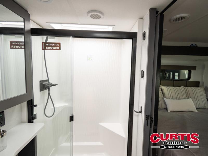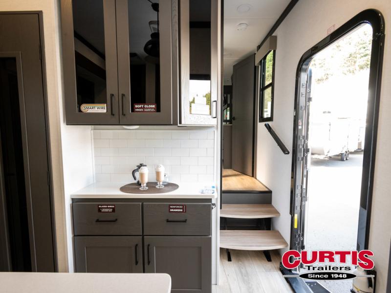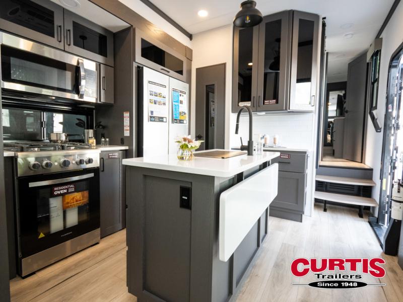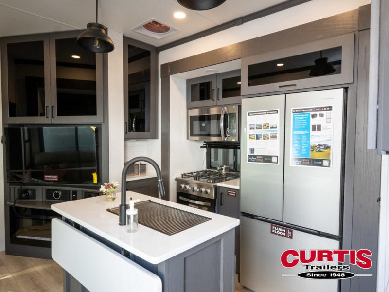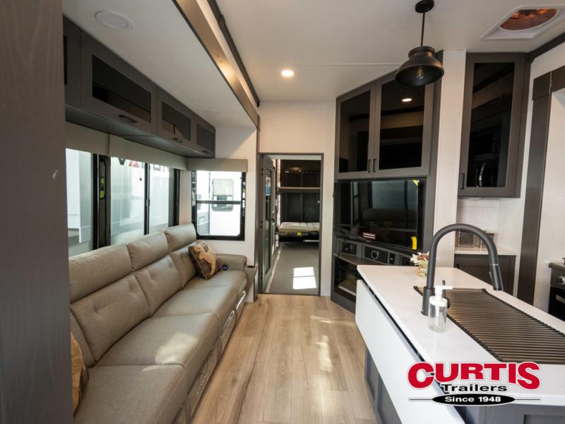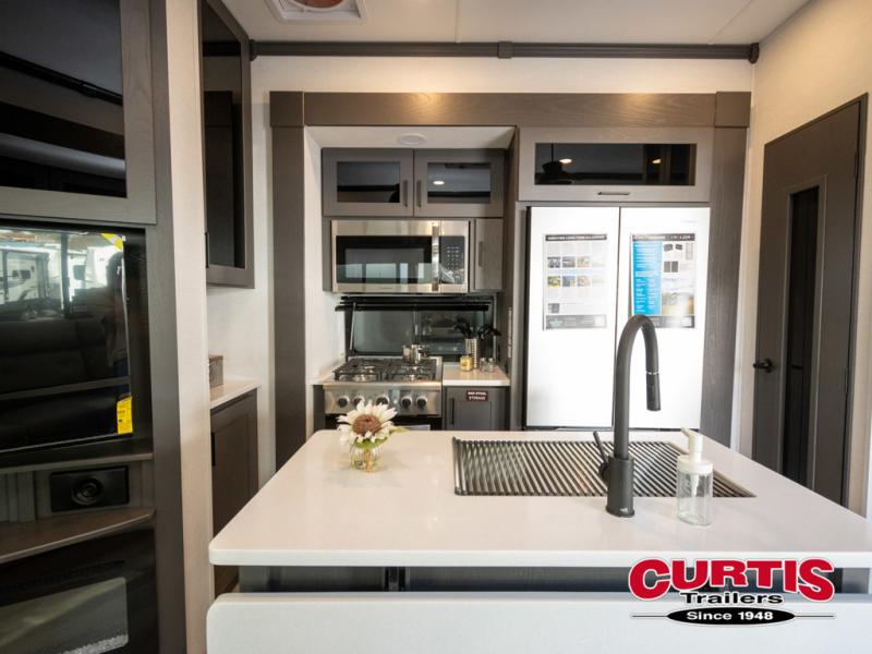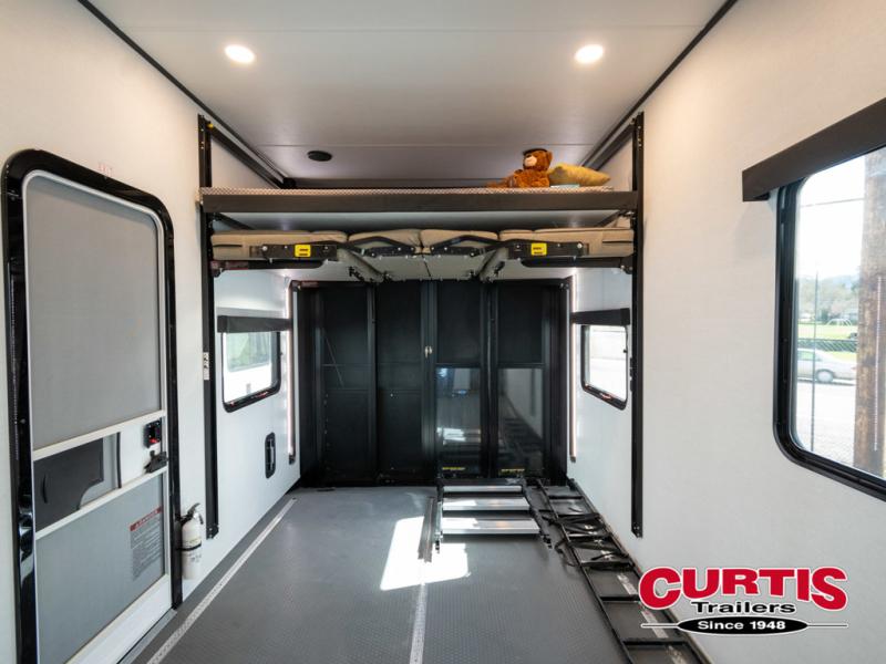 You can easily load up your toys into the 16' garage area of this toy hauler with the 8' weather resistant ramp door and keep them filled with the dual 30 gallon fuel tanks! Once you unload your toys from the garage area, you can set up the opposing HappiJac sofas with a queen mattress above them, the loft that opens to the garage, and the half bathroom. The kitchen has everything you need to prepare your best meals including two hutches, three pantries, and a kitchen island with two bar stools to enjoy your morning coffee and eggs. The dual entry bathroom has a 48" x 30" shower and leads directly into the front private bedroom. Inside the bedroom, a king bed slide allows for more floor space. There is also a flip top dresser, and a front wardrobe with washer and dryer prep.