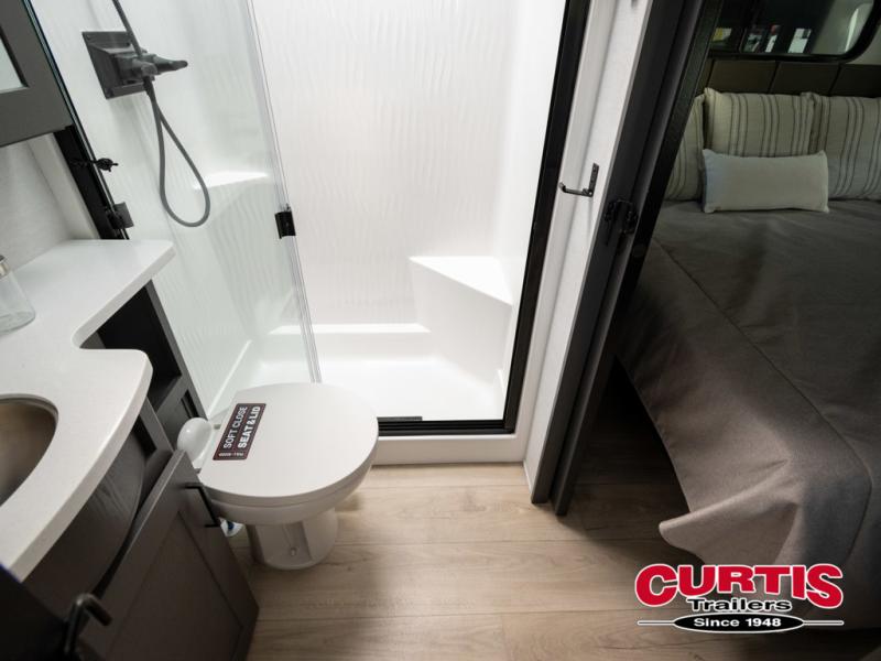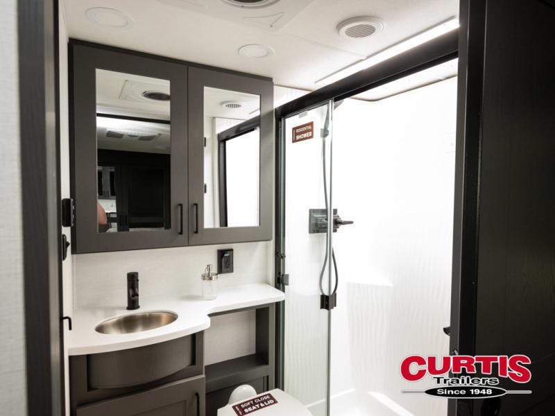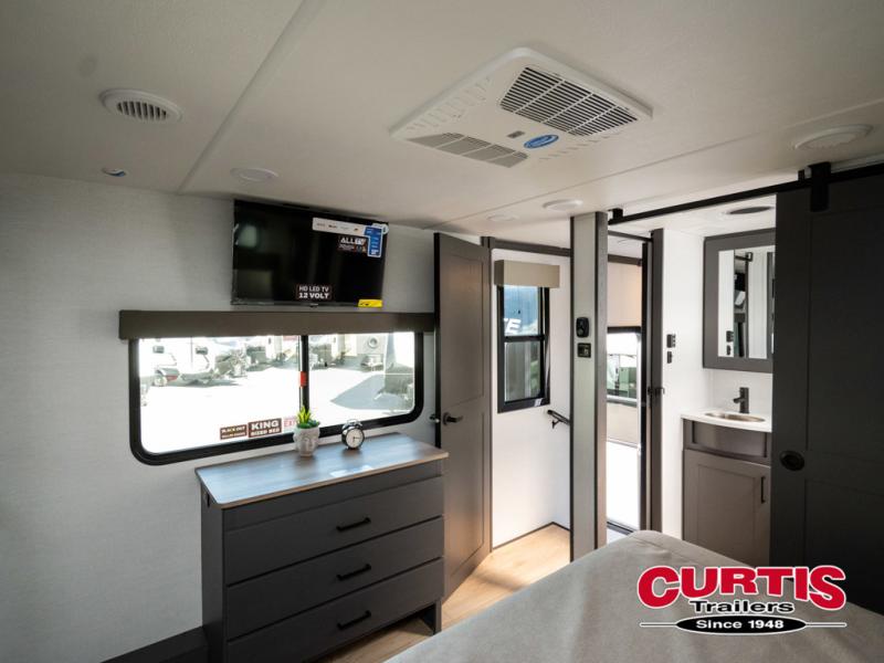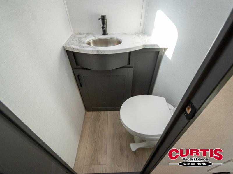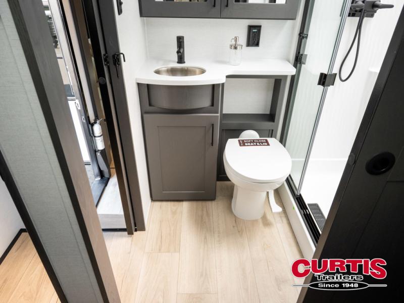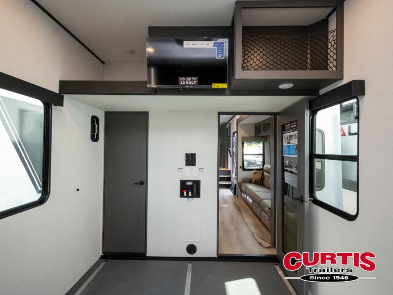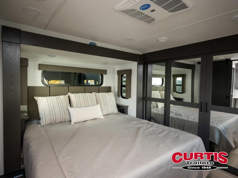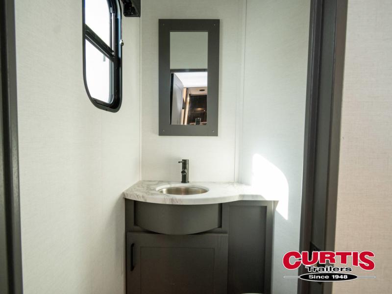 You can easily load up your toys into the 16' garage area of this toy hauler with the 8' weather resistant ramp door and keep them filled with the dual 30 gallon fuel tanks! Once you unload your toys from the garage area, you can set up the opposing HappiJac sofas with a queen mattress above them, the loft that opens to the garage, and the half bathroom. The kitchen has everything you need to prepare your best meals including two hutches, three pantries, and a kitchen island with two bar stools to enjoy your morning coffee and eggs. The dual entry bathroom has a 48" x 30" shower and leads directly into the front private bedroom. Inside the bedroom, a king bed slide allows for more floor space. There is also a flip top dresser, and a front wardrobe with washer and dryer prep.