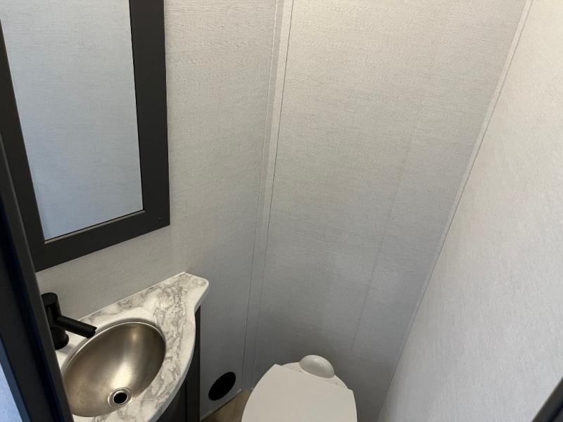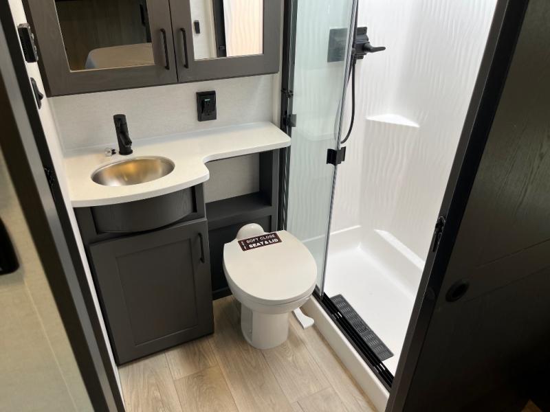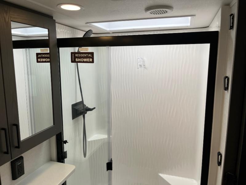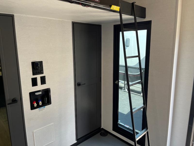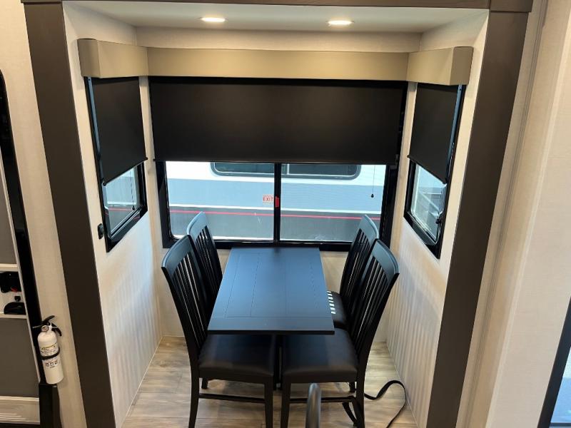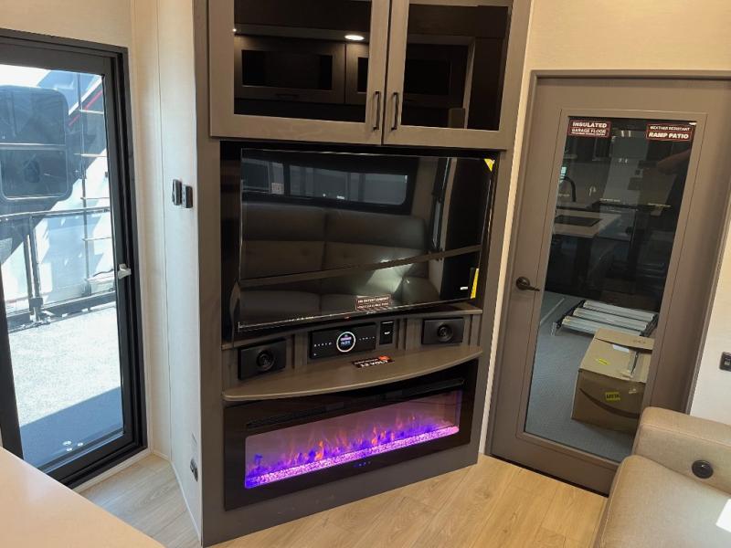 With a 14' garage and an 8' weather resistant ramp door, you can easily load up your toys into this toy hauler! The garage area also has opposing HappiJac sofas with a queen bed above them, a loft that opens to the garage, and a half bathroom. Wake up feeling refreshed after sleeping on the king bed slide inside the front private bedroom and showering in the 48" x 30" shower inside the dual entry bathroom. Now that you're ready for the day you can head to the kitchen and fry up some bacon on the four burner cooktop then enjoy it at the free standing dinette. There is also a kitchen island with flip-up extensions for more counter space. When you're ready to wind down your nights, either relax on the sofa across from the fireplace inside or set up a chair outside on the fold-down side patio!