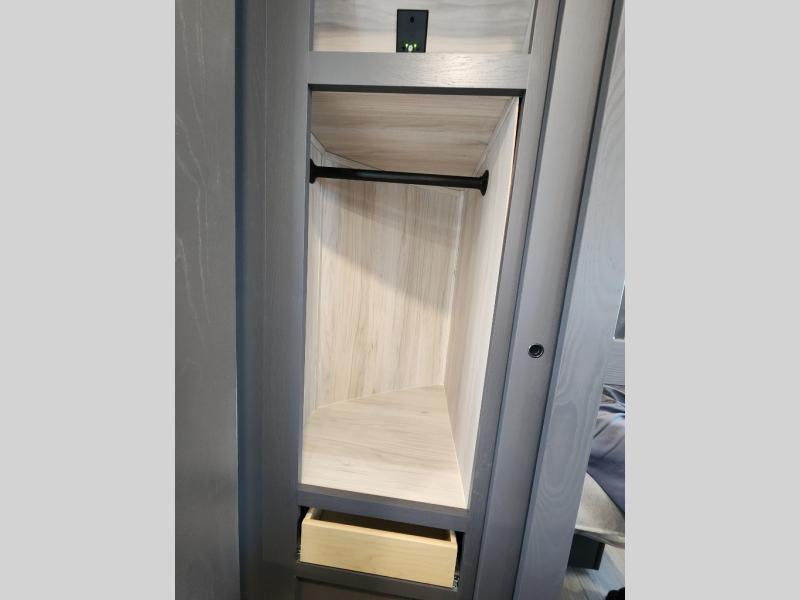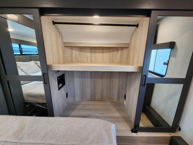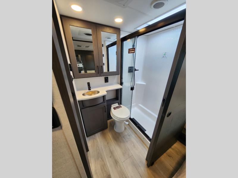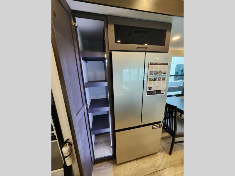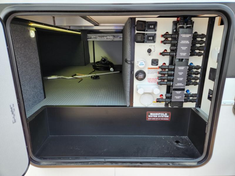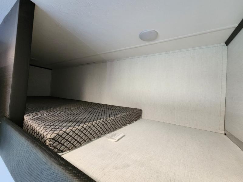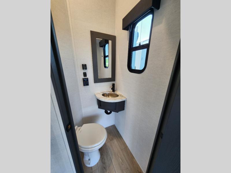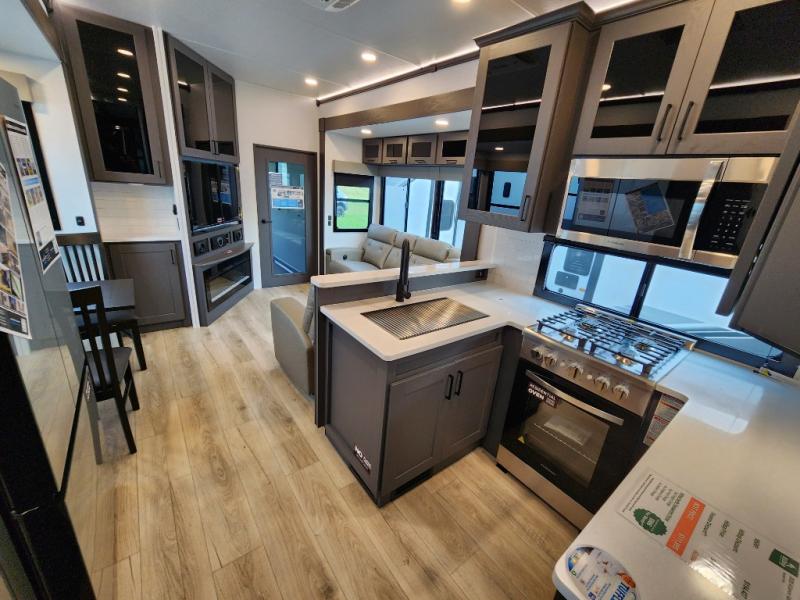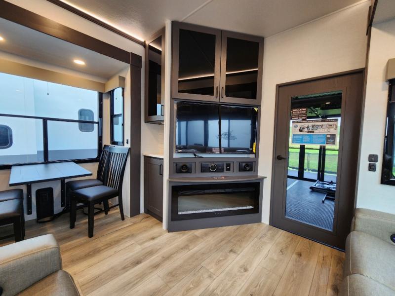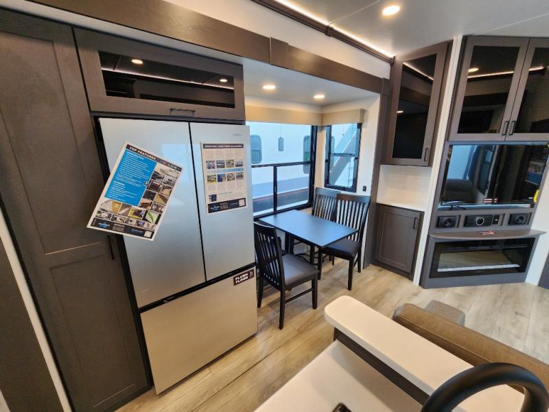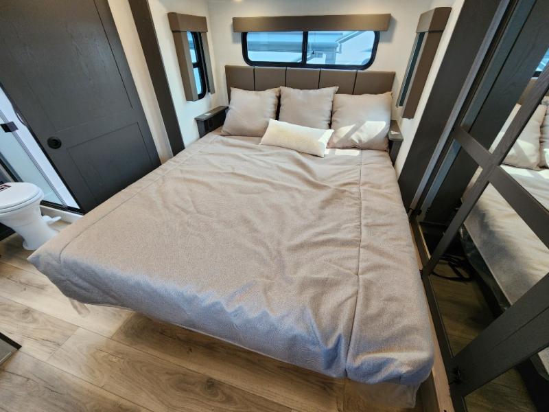 The whole gang will love camping in this toy hauler with a 14' garage for your toys and gear. Once you have arrived at your destination, you can set up the HappiJac roll-over sofas with a queen bed above them, and also a loft which opens to the garage area as well. A half bath is also available off the garage which is an added convenience for those sleeping in this converted area, and for those coming in off the trail so that they do not have to track all through the main unit to use the bathroom. The chef can prepare great meals for their hungry crew with the fully equipped kitchen including a four burner cooktop, a 17 cu. ft. stainless steel 12V refrigerator, large sink, and plenty of countertop prep space. The rest of the gang can be relaxing on the large L-shaped sofa slide watching the 50" HDTV and enjoying the fireplace, or playing a game of cards at the dining table with four chairs. The front private bedroom features a king bed slide for more interior space, a flip top dresser for all of your belongings, and a front wardrobe with washer and dryer prep, plus it has an entrance into the dual entry bathroom!