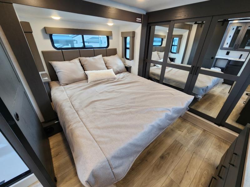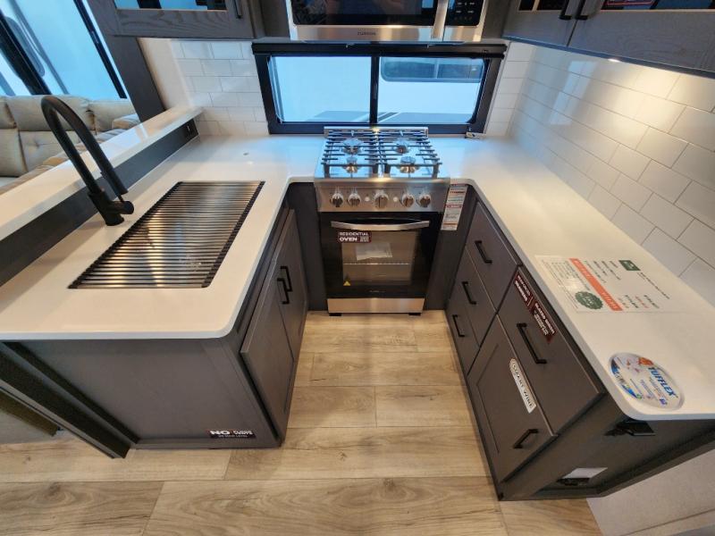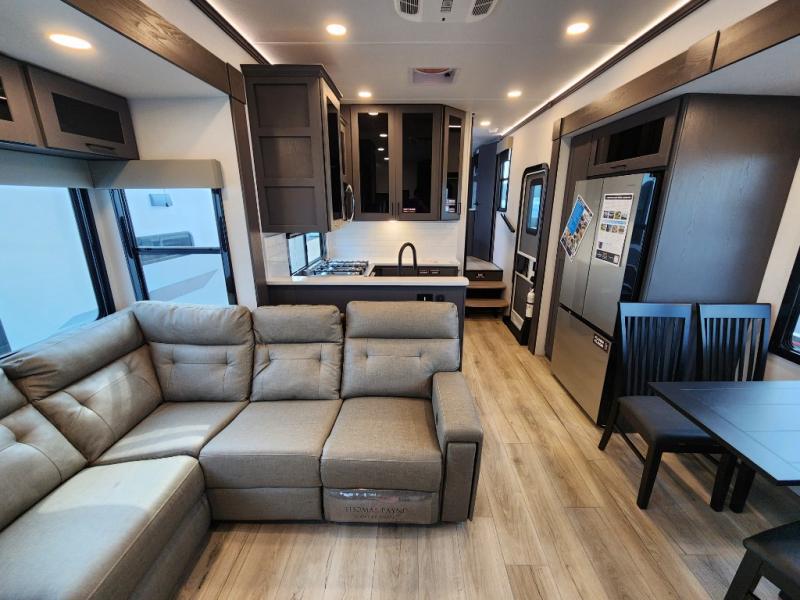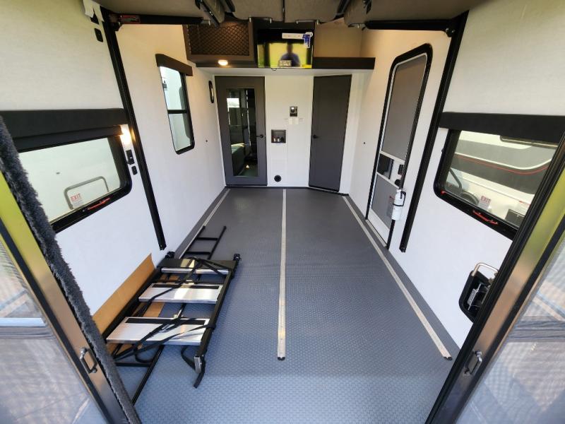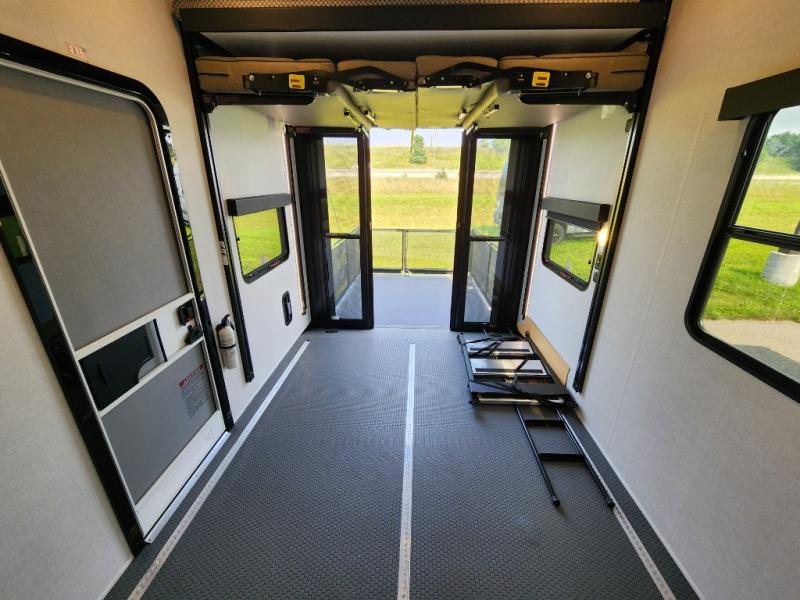 You can bring your toys with you wherever you go with any one of these Alliance RV Valor toy hauler fifth wheels! They are adventure-ready with a quality build from the walk on roof with seamless PVC roof covering to the commercial grade vinyl flooring and MorRyde CRE3000 suspension system. The Performance Running Gear package comes with a 101" wide-body benchmark chassis platform, 7,000 lb. Dexter axles, and a space enhancing drop frame storage compartment to pack in all your riding gear. You can even go off-gridding thanks to the Off the Grid Pack that has two 400 watt solar panels, generator prep, a 40 amp charge controller, and a 100 amp hour lithium iron phosphate battery. Some of the interior comforts you will enjoy are the hardwood cabinet doors and drawers, solid surface kitchen countertops, and commercial grade vinyl flooring with no carpet to make clean up a breeze. The Valor toy haulers are also the Master of 12 Volt with USB charging station throughout, a stainless steel refrigerator, and more 12 volt features to make camping hassle-free!