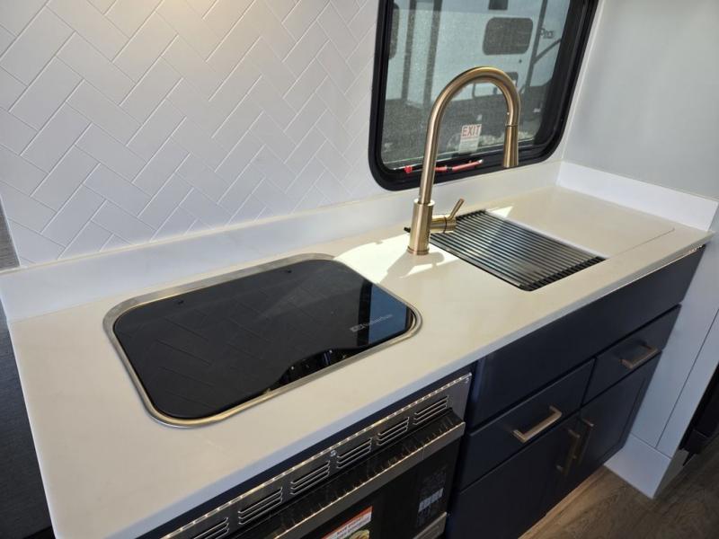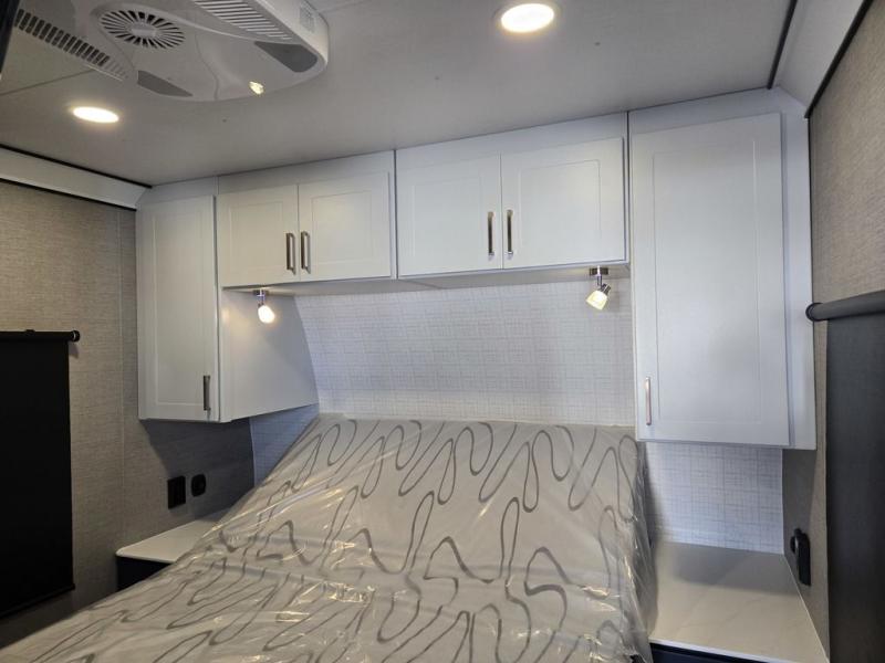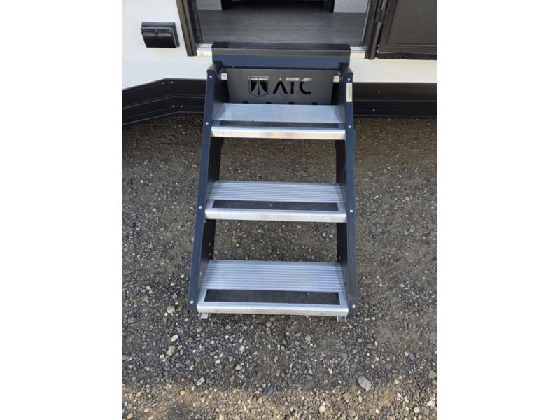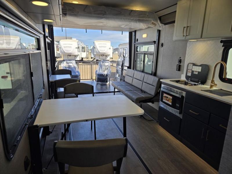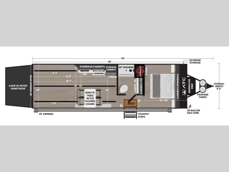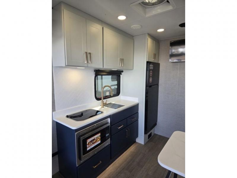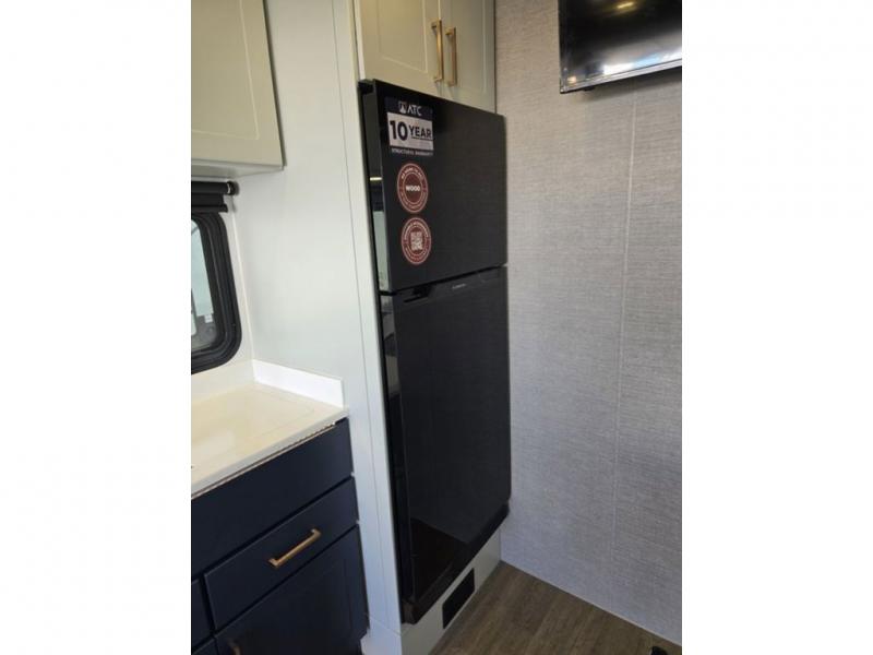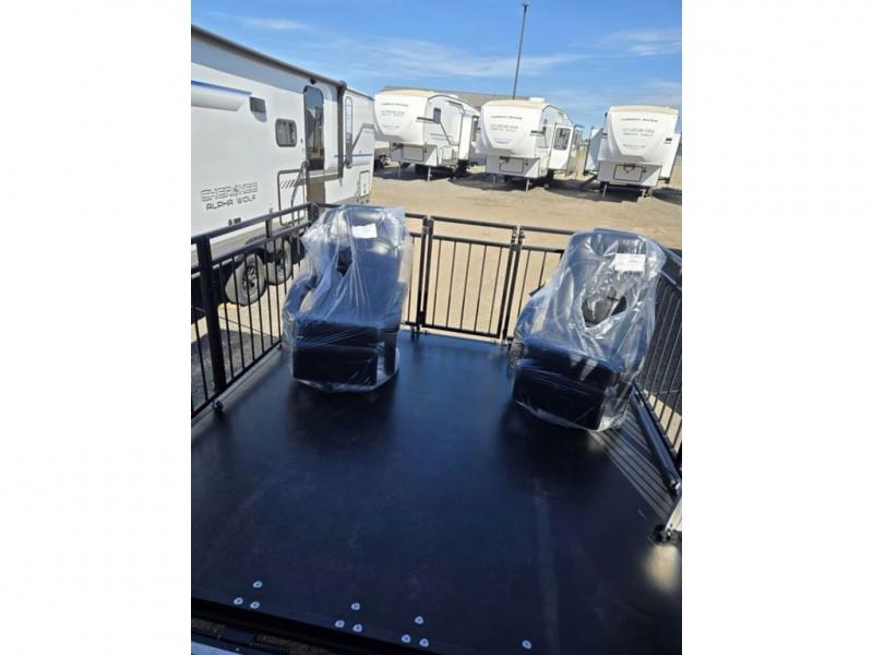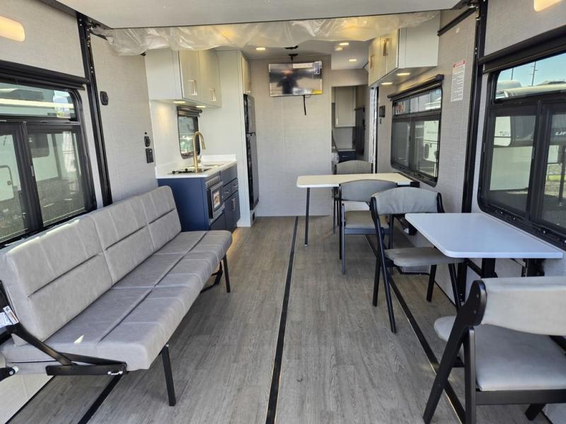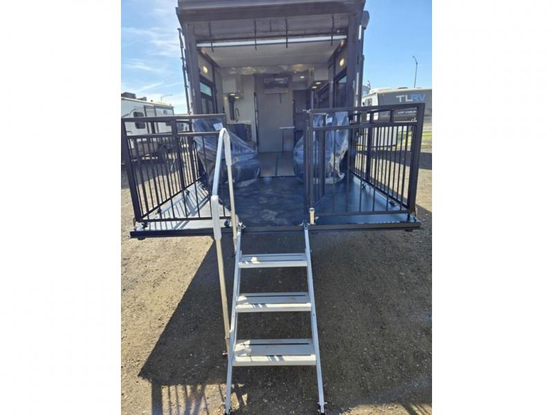 The PLA 550 toy hauler travel trailers by ATC Trailers are built for the long haul with a fully integrated aluminum frame, a one-piece aluminum roof, composite ramp door, and an enclosed underbelly. There is an electric tongue jack outside, along with a pass-through storage, power awning with a light strip, and electric scissor jacks for easy set up. The LifeTrac modular component system will let you configure your garage space how you need it, and there are three rows of Airline tracks with covers to secure your gear. You will also love the interior with its aluminum cabinets with solid surface countertops, dimmable can ceiling lights, and composite with commercial-grade vinyl flooring to name a few comforts!