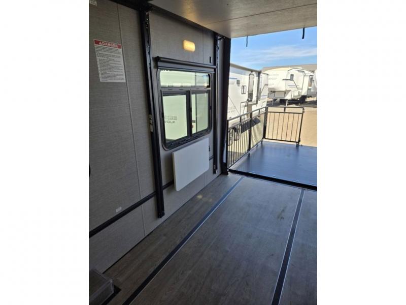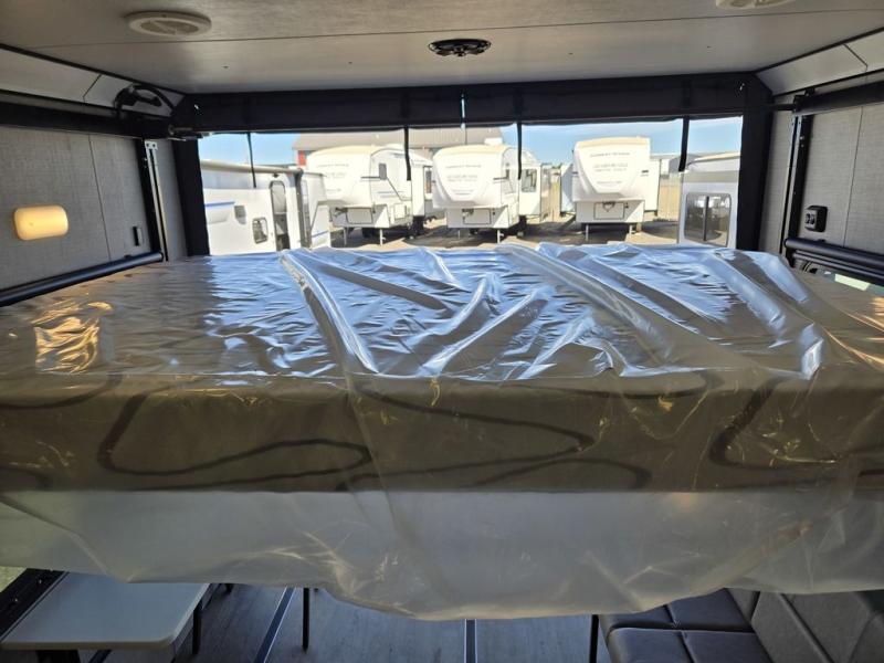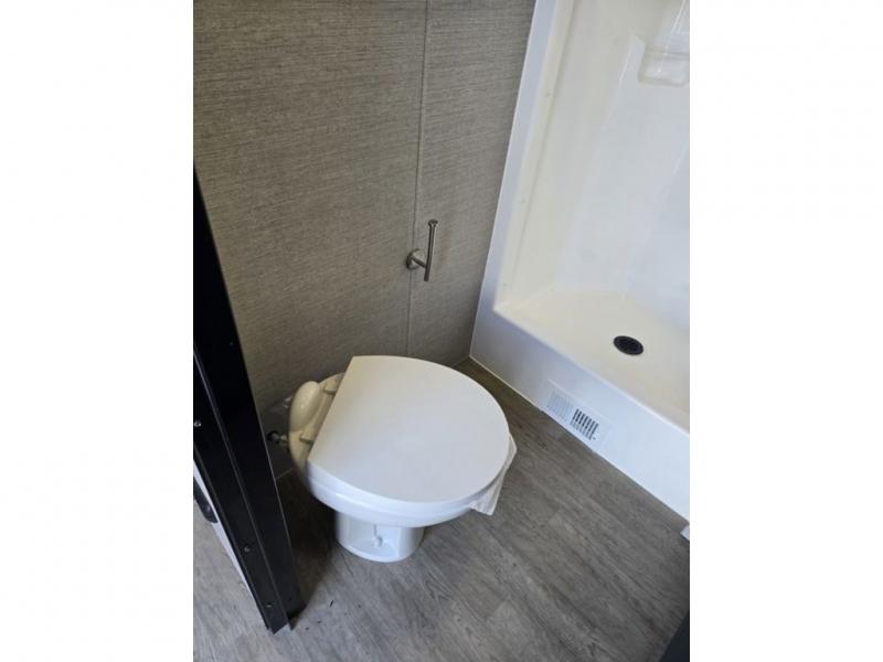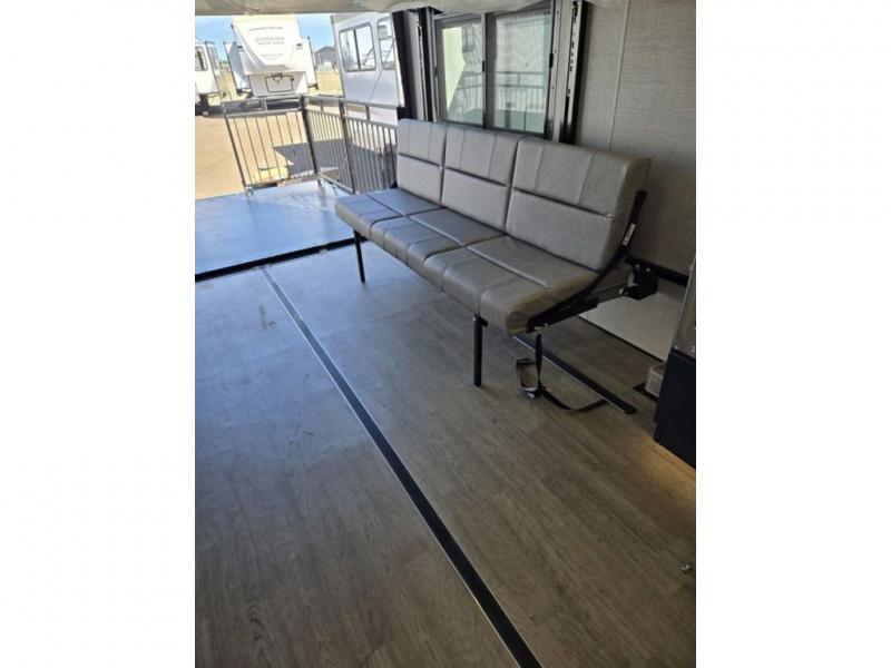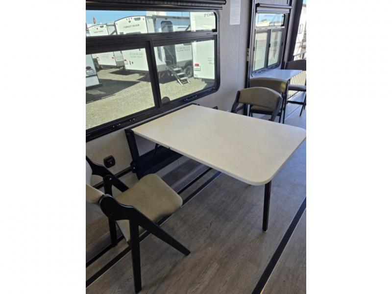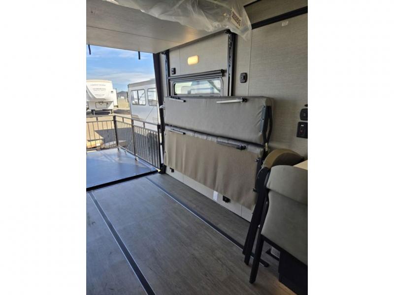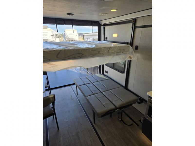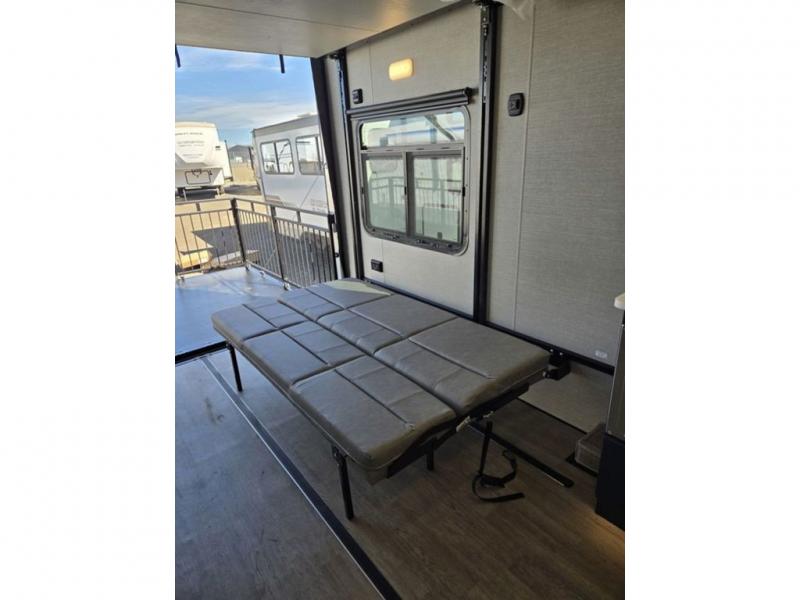 Time spent in this toy hauler will be time well spent! There is 15' 7" total garage space for your toys plus a cableless rear ramp door for easy unloading. You can whip up a meal on the LP two burner cooktop or in the convection microwave when you get back from trail riding, and the 10-cu. ft. 12V refrigerator will keep your food fresh. There is also a dinette table with four folding chairs where you can dine together. A full bath lets you clean up before bed, and you'll find a front private bedroom with a queen bed for all-around comfort!
