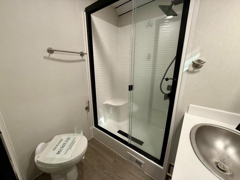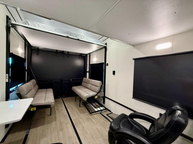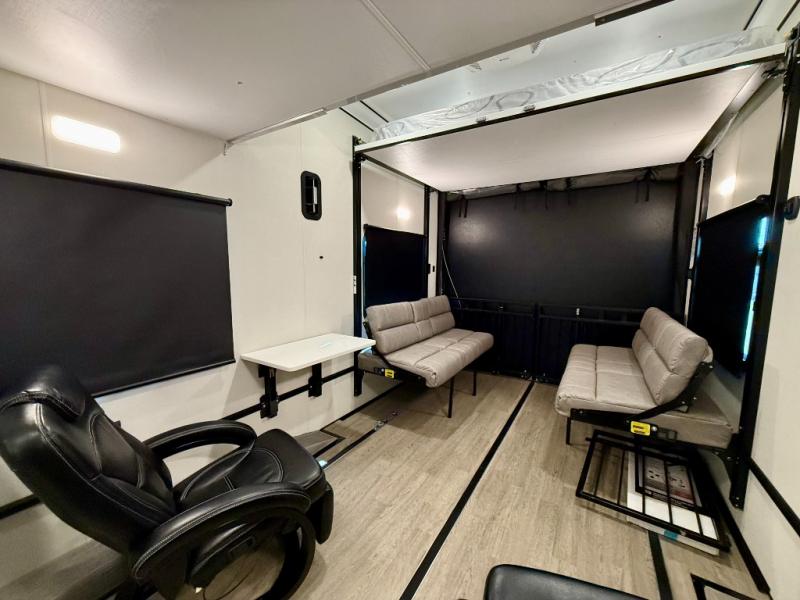 Start a new adventure in this spacious toy hauler that can sleep 2-16 depending on the options you choose to add! Once your toys are unloaded using the cableless rear ramp door, you can head out on a trail or two. You'll find a residential queen bed with storage in the front bedroom, along with a large front closet and TV prep if you want to add a television. The full bath includes a spa/jet shower fixture that is sure to be nice after a day of riding the trails, and there is a glass shower door for added luxury. Head to the kitchen where you can whip up a meal for your crew on the LP three burner cooktop or in the convection microwave, and you can dine at the dinette with four chairs. If you'd like to get some fresh air, take your plate outdoors to sit under the power awning with a light strip!